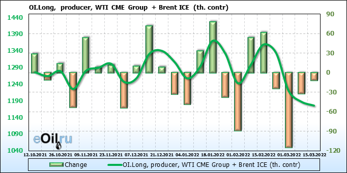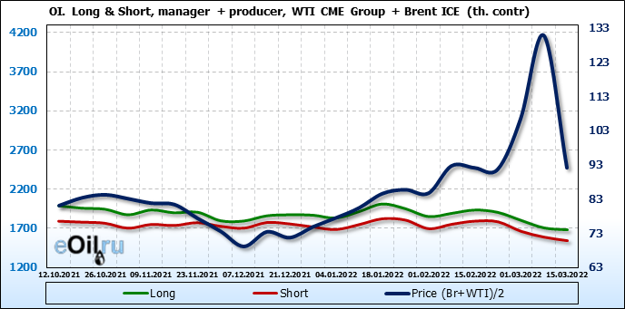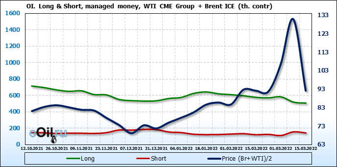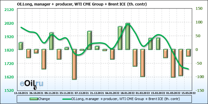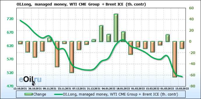 За прошедшую неделю, 09.03.22 — 15.03.22, разница между длинными и короткими позициями управляющих увеличилась на 0.8 тыс. контрактов. В тоже время, цена упала на 38.74 доллара.