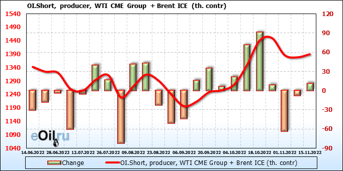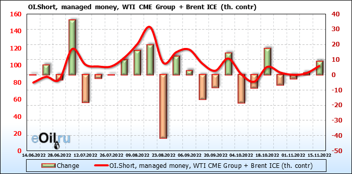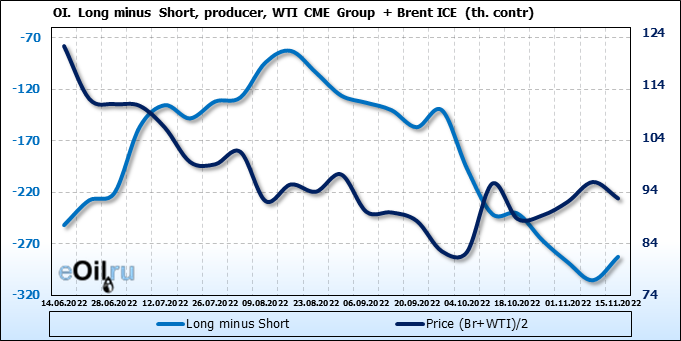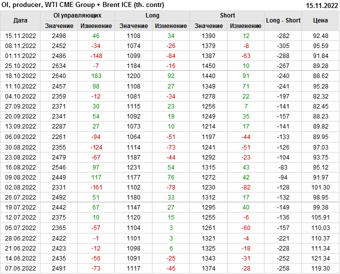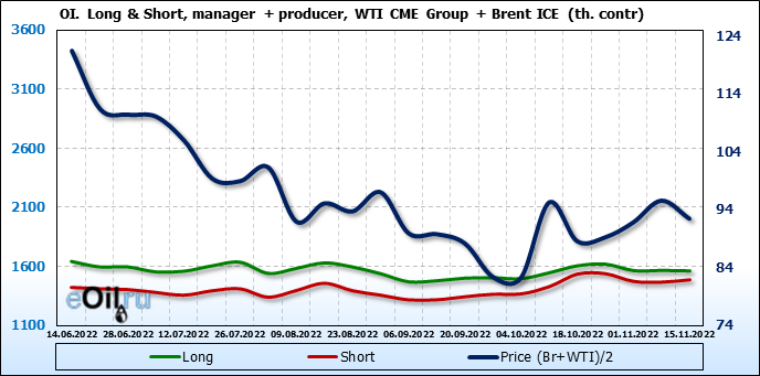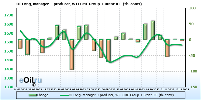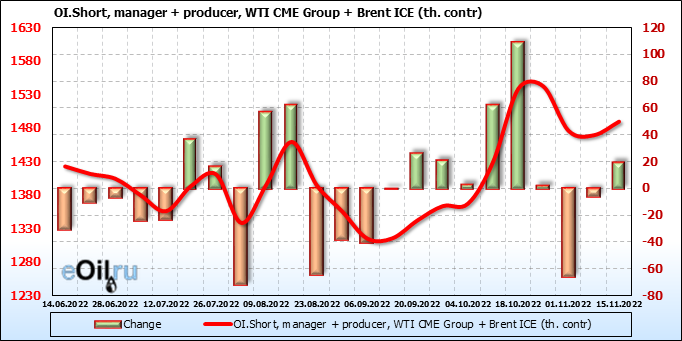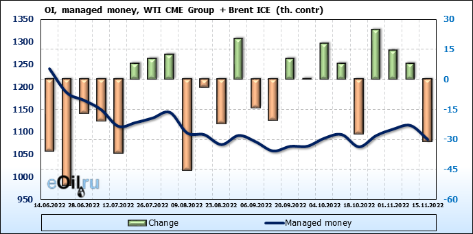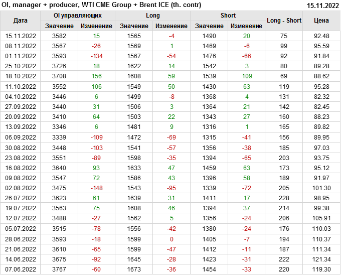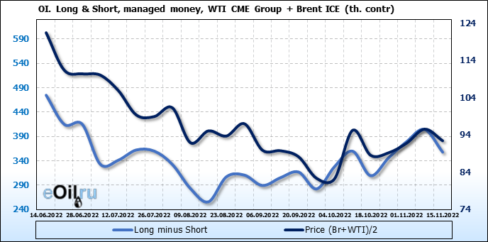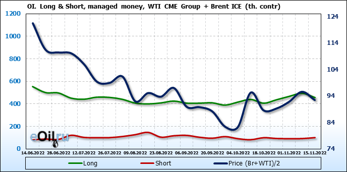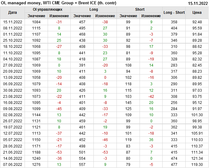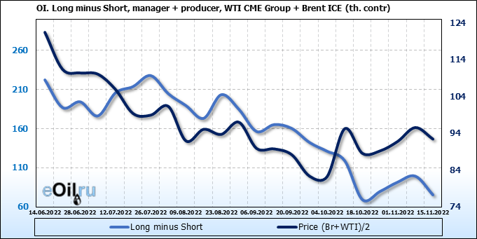 За прошедшую неделю, 09.11.22 — 15.11.22, разница между длинными и короткими позициями управляющих сократилась на 46.6 тыс. контрактов. В тоже время, цена упала на 3.11 доллара.