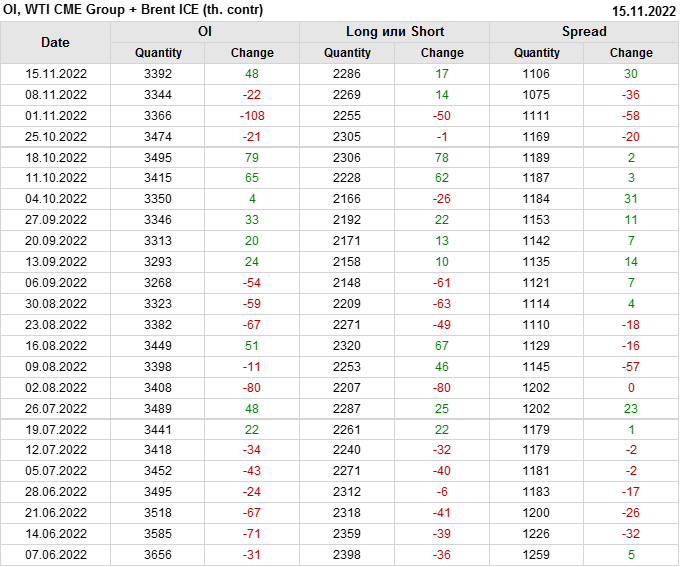 За прошлую неделю, 09.11.22 — 15.11.22, открытый интерес вырос на 48 тыс. контрактов. Объем вовлеченных в торговлю контрактов составляет 3 391 927 штук. Текущее положение дел на рынке таково, что деньги в течение прошлой недели приходили на рынок поддерживая тенденцию.