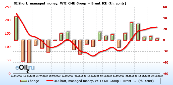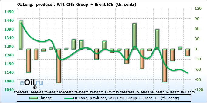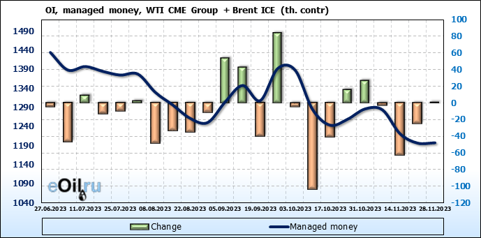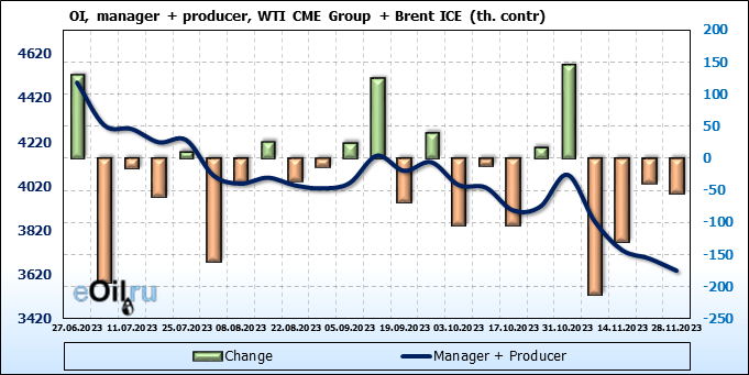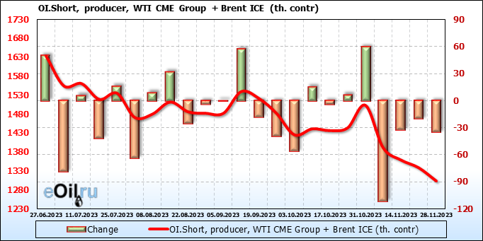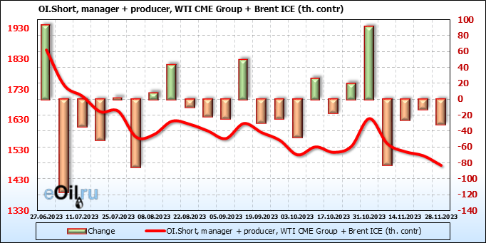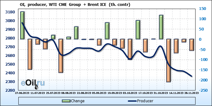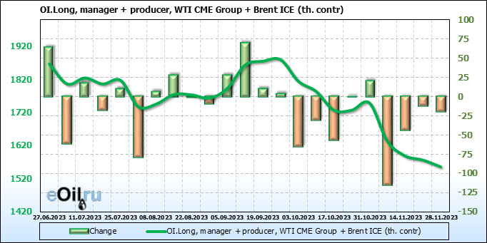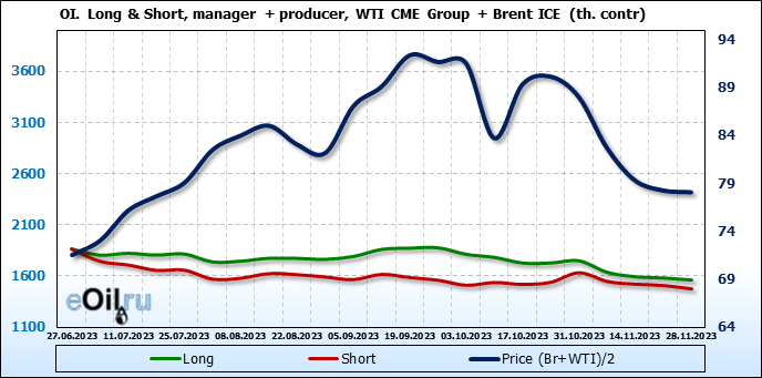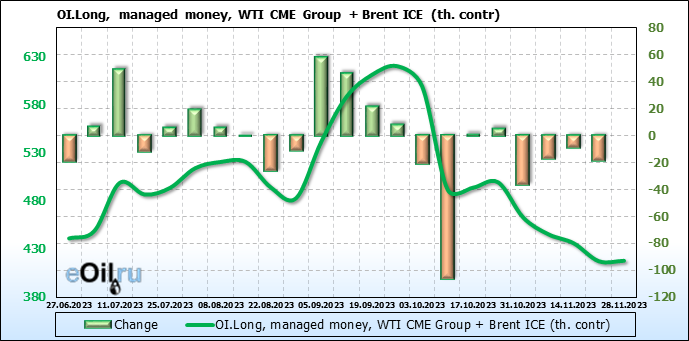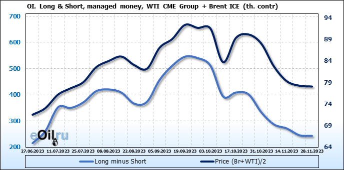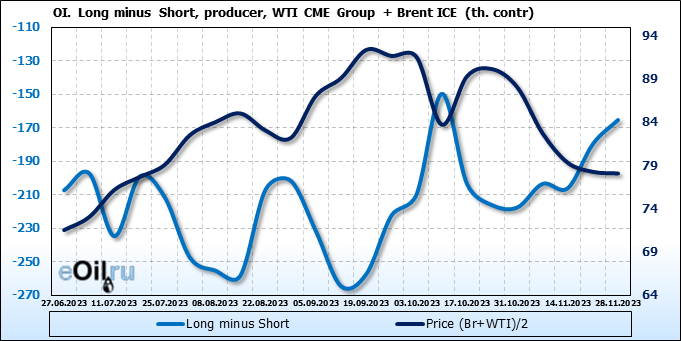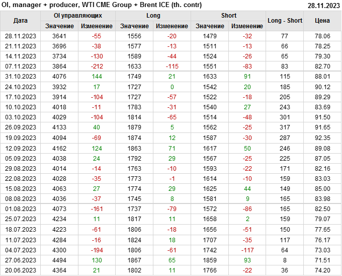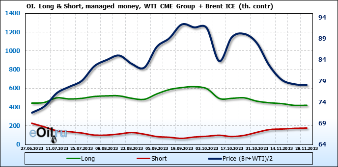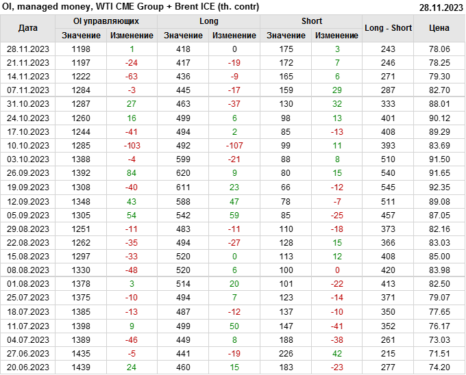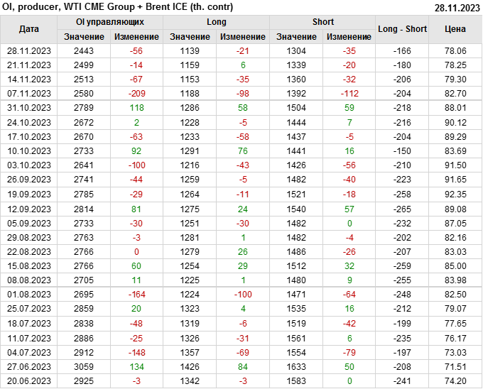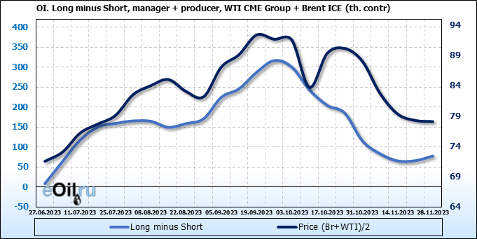 За прошедшую неделю, 22.11.23 — 28.11.23, разница между длинными и короткими позициями управляющих сократилась на 2.5 тыс. контрактов. В тоже время, цена упала на 0.19 доллара.