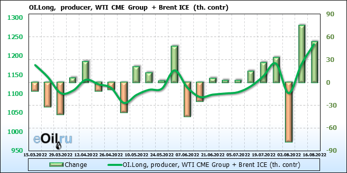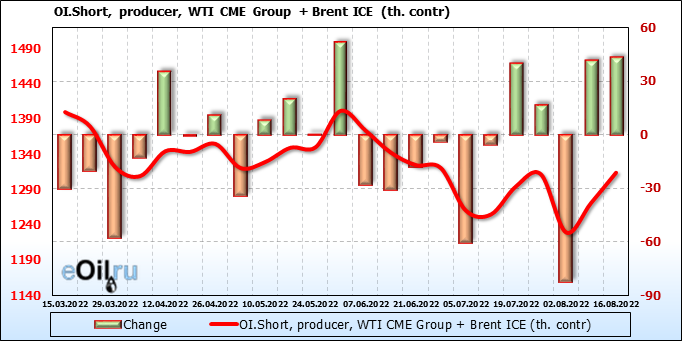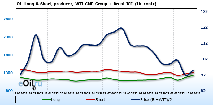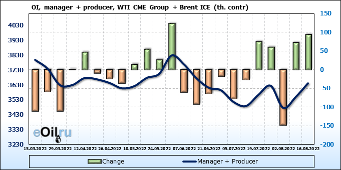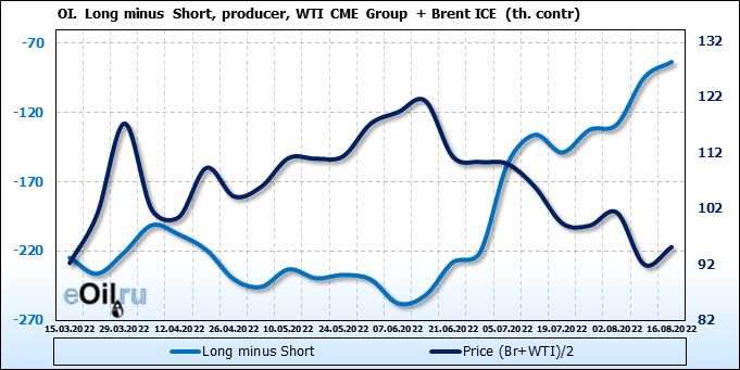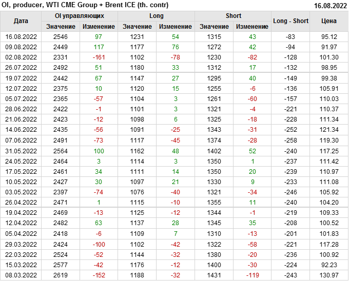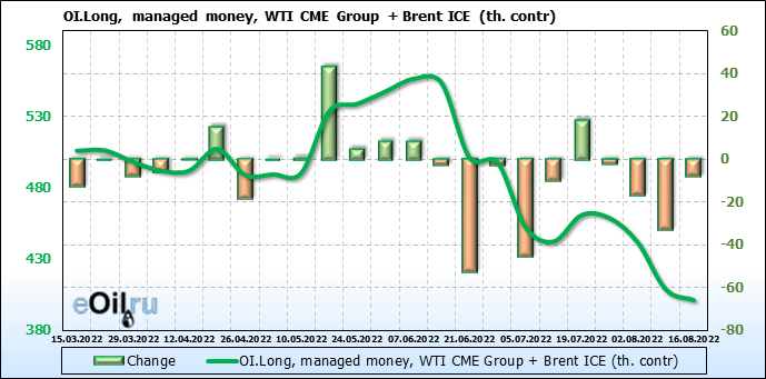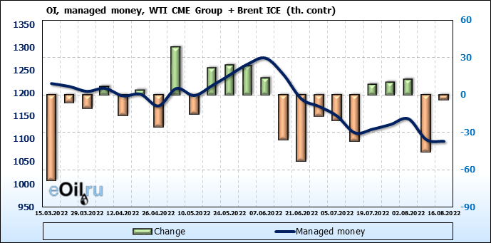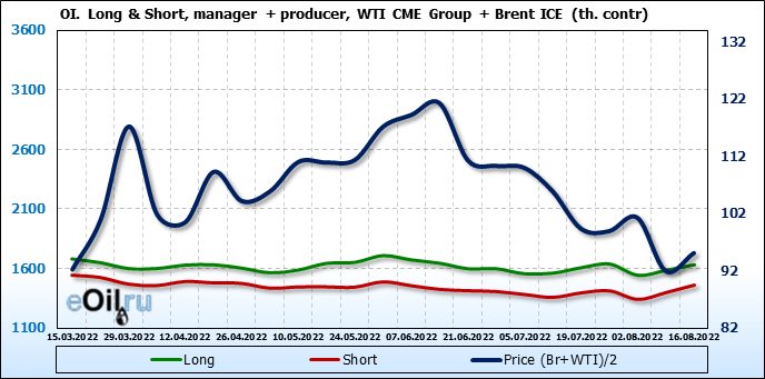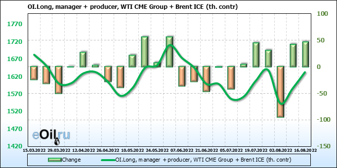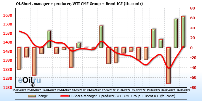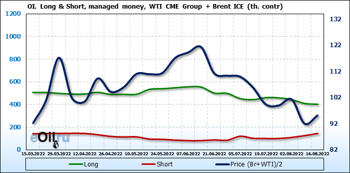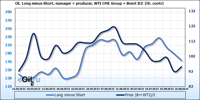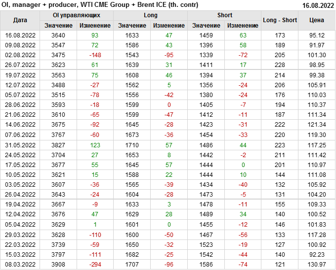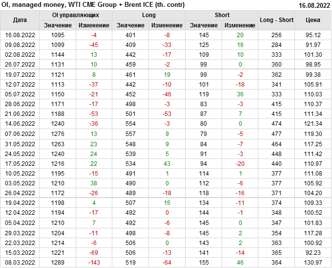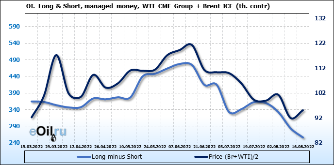 За прошедшую неделю, 10.08.22 — 16.08.22, разница между длинными и короткими позициями управляющих сократилась на 27.3 тыс. контрактов. В тоже время, цена выросла на 3.15 доллара.