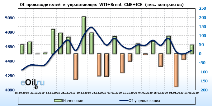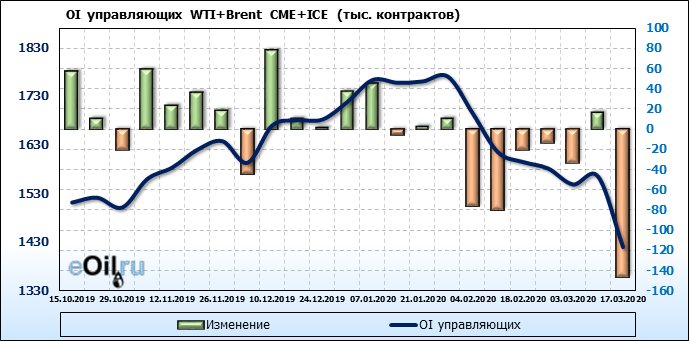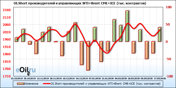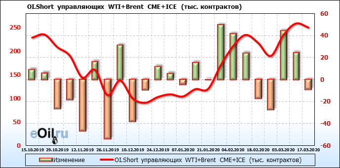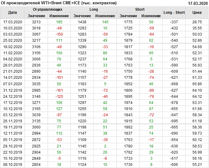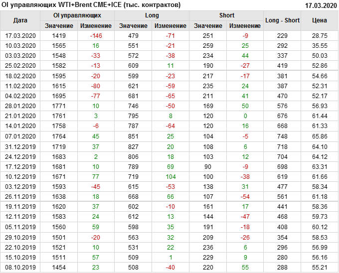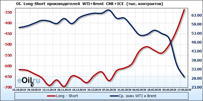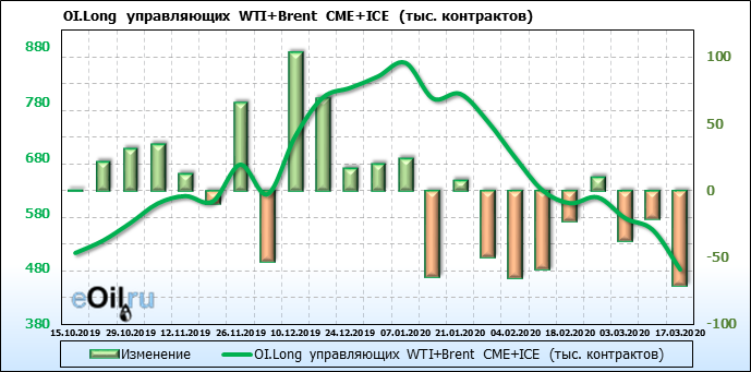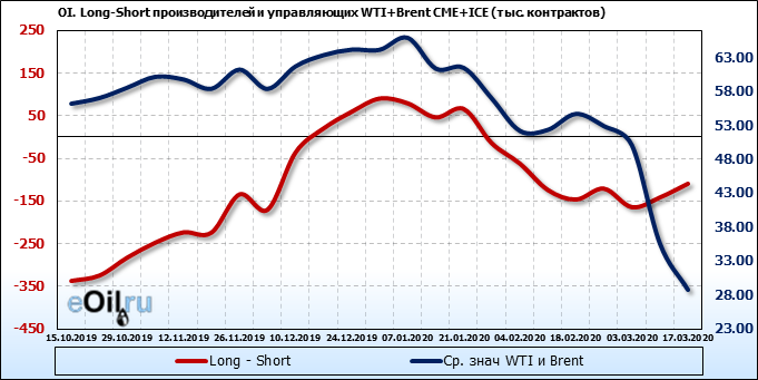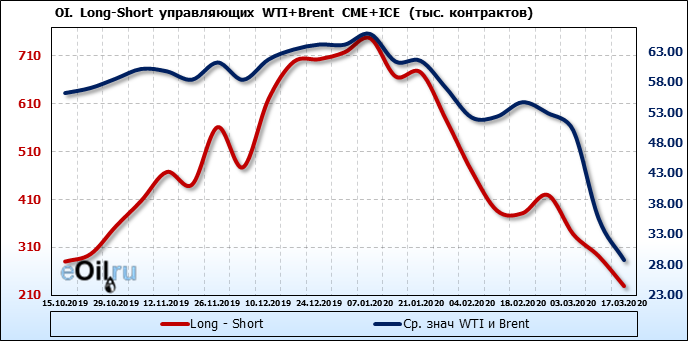 За прошлую неделю, 11.03.20 — 17.03.20, разница между длинными и короткими позициями управляющих упала на 63 тыс. контрактов. В тоже время, цена упала на 6.8 доллара. Наращивание коротких позиций спекулянтами приводит к падению цен. Если давление со стороны медведей продолжится, то мы можем увидеть новые минимумы.