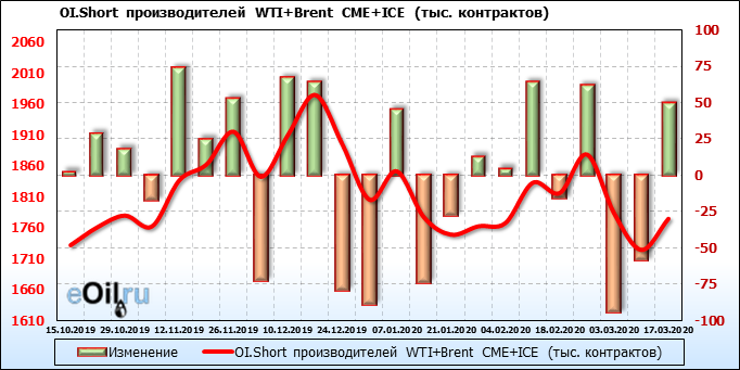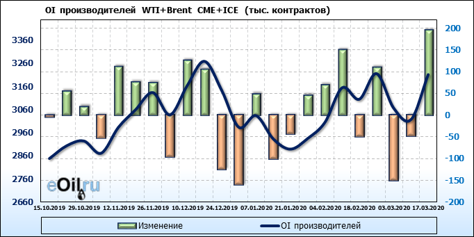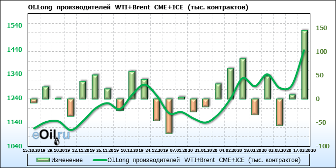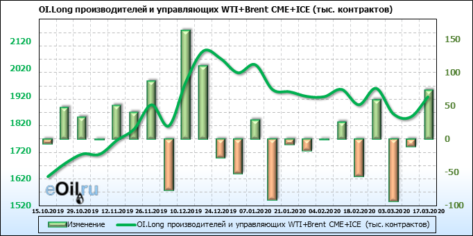 За прошлую неделю, 11.03.20 — 17.03.20, разница между длинными и короткими позициями производителей выросла на 95 тыс. контрактов. В тоже время, цена упала на 6.8 доллара. Производители перестали наращивать короткие позиции, что говорит или о непривлекательности текущих ценовых уровней для хеджирования, или о том, что часть участников рынка заняла выжидательную позицию.