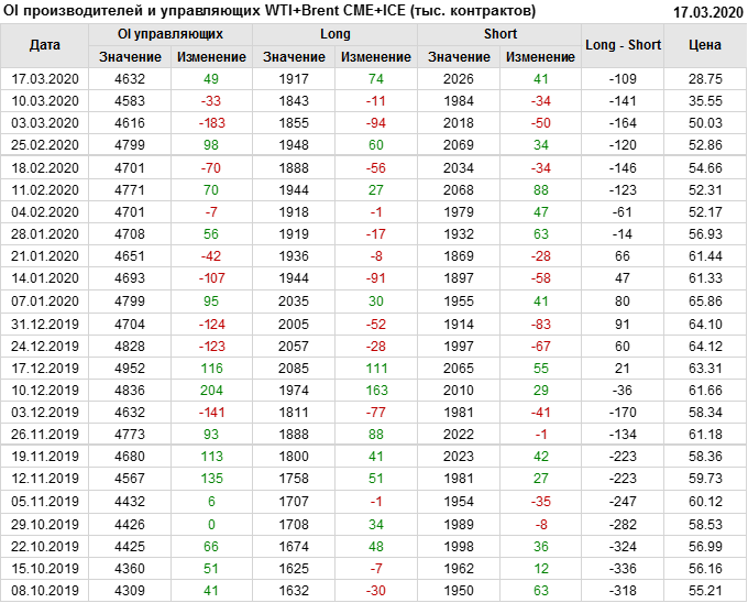 За прошлую неделю, 11.03.20 — 17.03.20, разница между длинными и короткими позициями производителей и управляющих выросла на 32 тыс. контрактов. За отчетный период времени, цена упала на 6.8 доллара. Производители и управляющие в своей совокупности смотрели вверх, не смотря на то, что цена продолжала снижаться. Подобный дисбаланс должен привести к стабилизации и развороту цен вверх в скором времени.