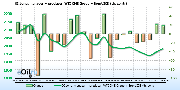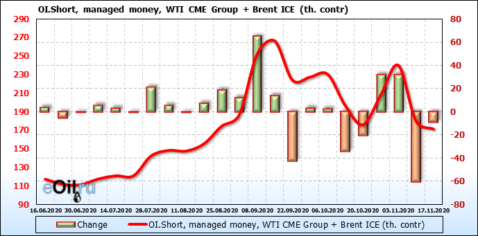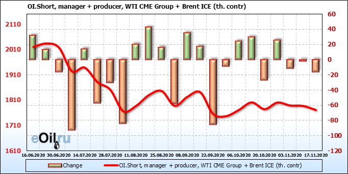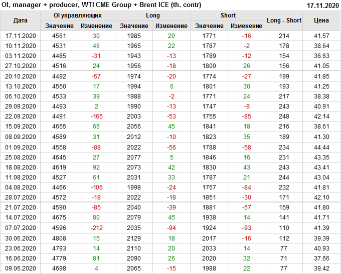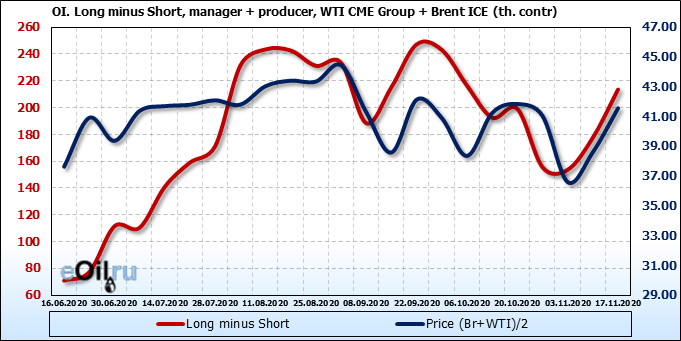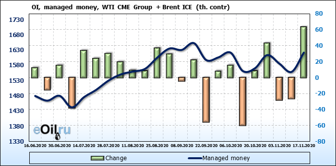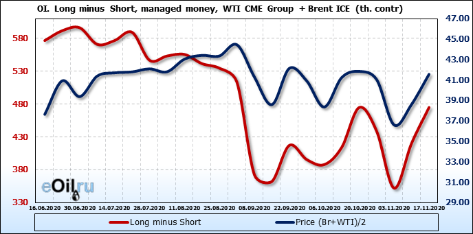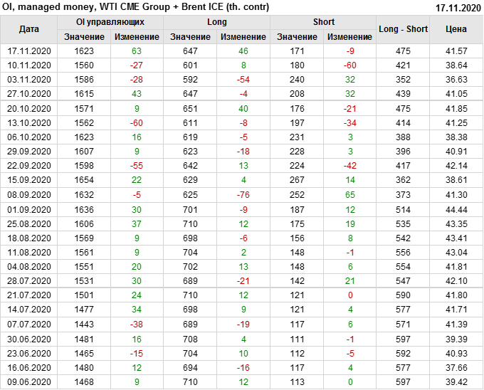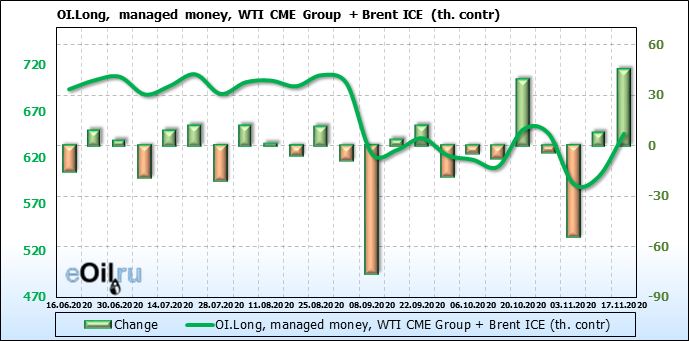 За прошлую неделю, 11.11.20 — 17.11.20, разница между длинными и короткими позициями управляющих выросла на 55 тыс. контрактов. В тоже время, цена выросла на 2.93 доллара. Управляющие наращивают позиции, разгоняя тем самым рост цен, что говорит нам о текущей силе рынка.