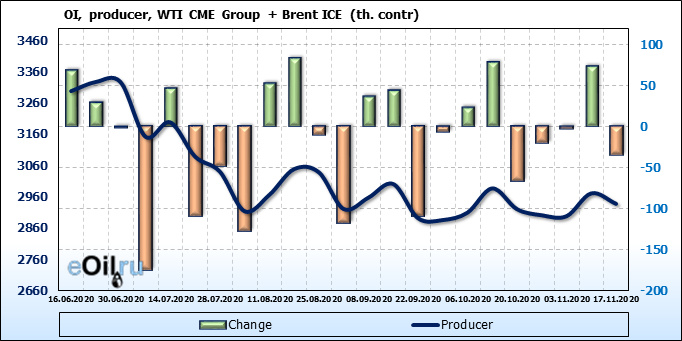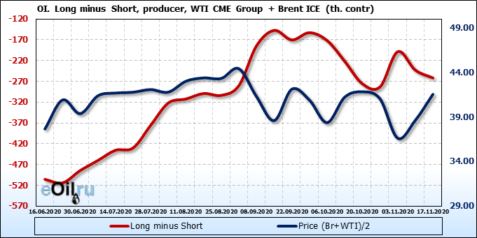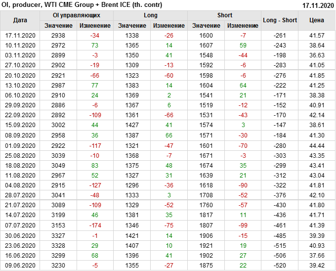 За прошлую неделю, 11.11.20 — 17.11.20, разница между длинными и короткими позициями производителей и управляющих выросла на 36 тыс. контрактов. За отчетный период времени, цена выросла на 2.93 доллара. Совокупно производители и управляющие наращивают длинные позиции, поддерживая рост цен. Это сильная комбинация, которая должна вызывать доверие у всё большего числа быков.