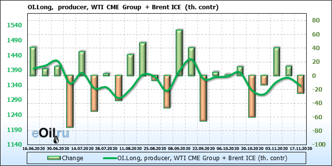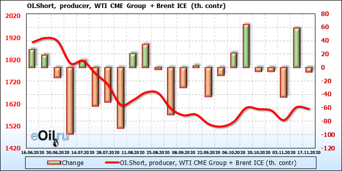 За прошлую неделю, 11.11.20 — 17.11.20, разница между длинными и короткими позициями производителей упала на 19 тыс. контрактов. В тоже время, цена выросла на 2.93 доллара. Производители увеличивают продажи, предполагая, что текущие уровни являются привлекательными для них. И не смотря на это, рынок продолжает расти, что показывает силу текущего тренда.