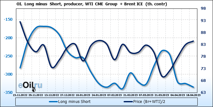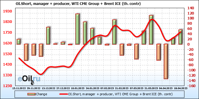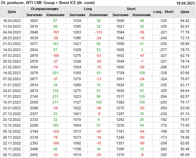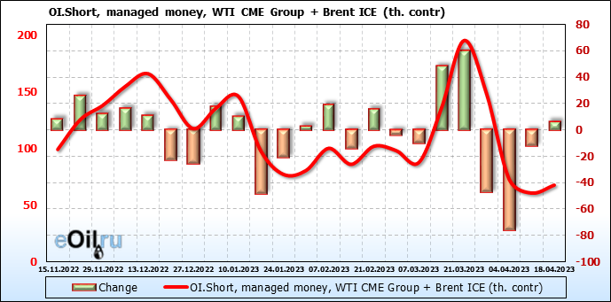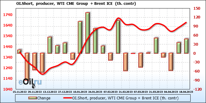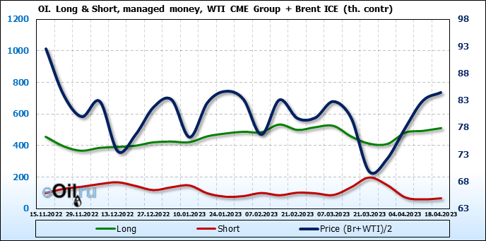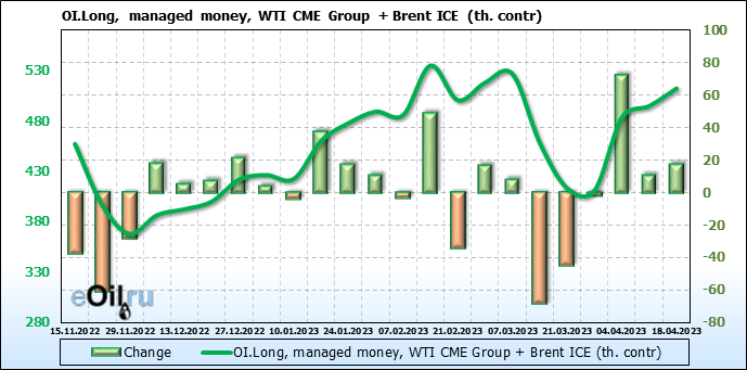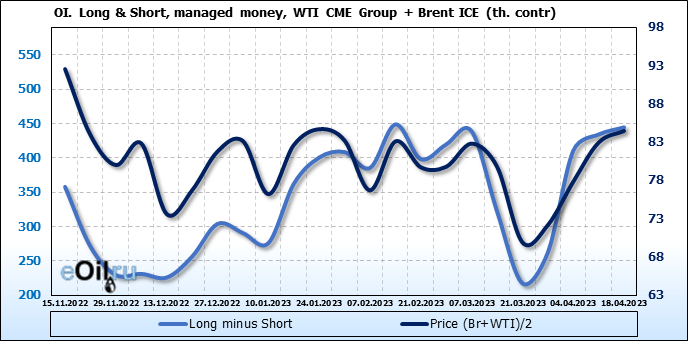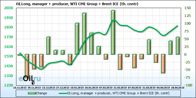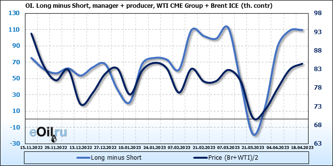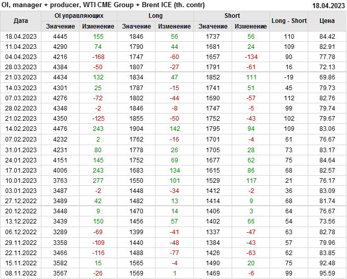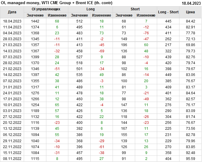 За прошедшую неделю, 12.04.23 — 18.04.23, разница между длинными и короткими позициями управляющих увеличилась на 10.4 тыс. контрактов. В тоже время, цена выросла на 1.51 доллара.