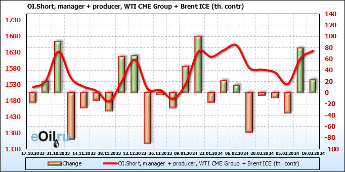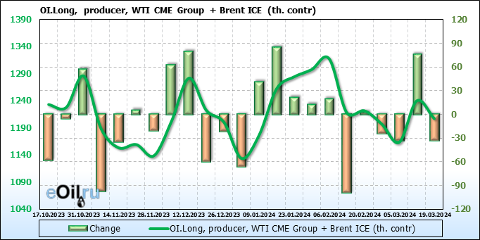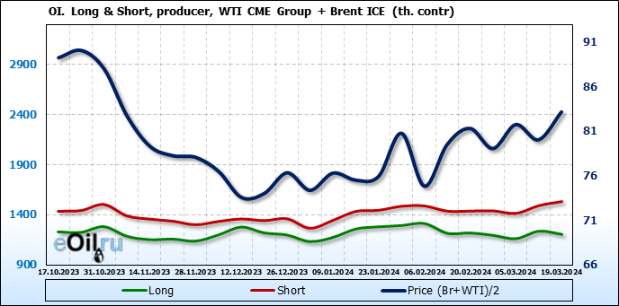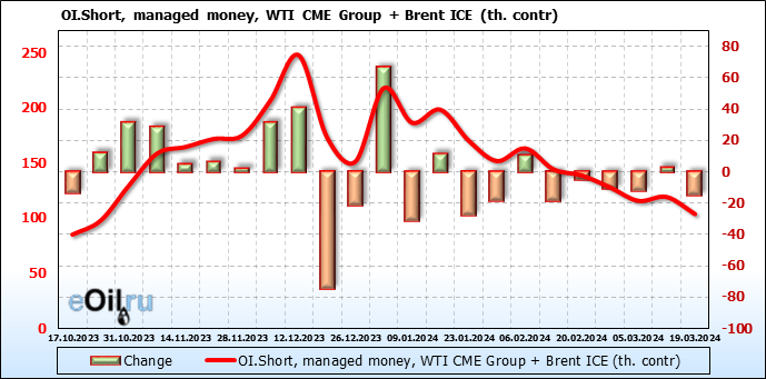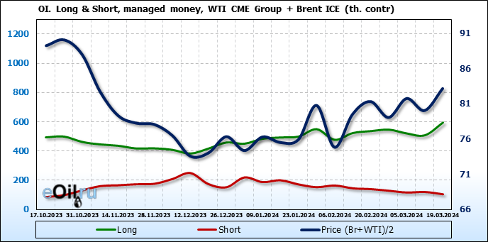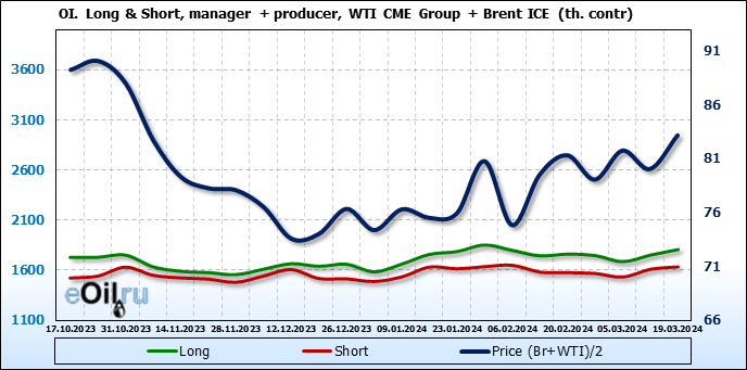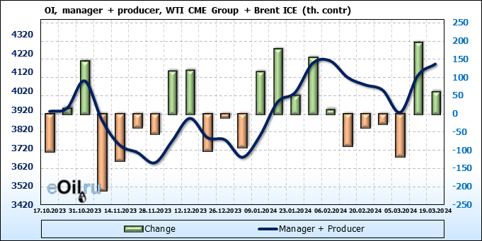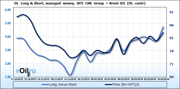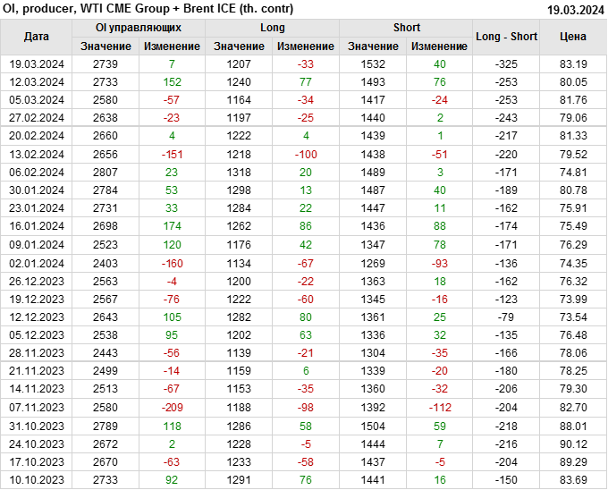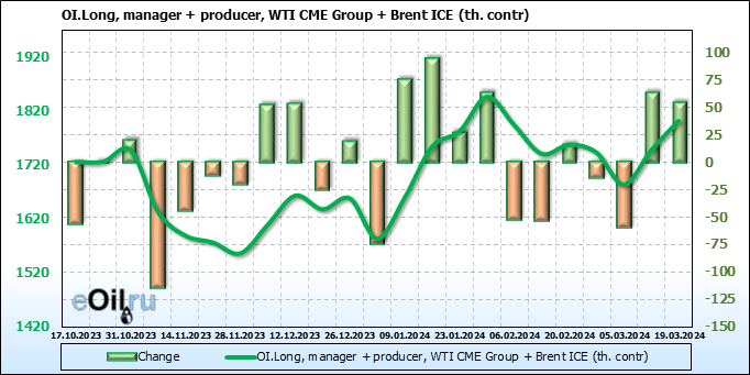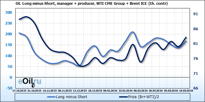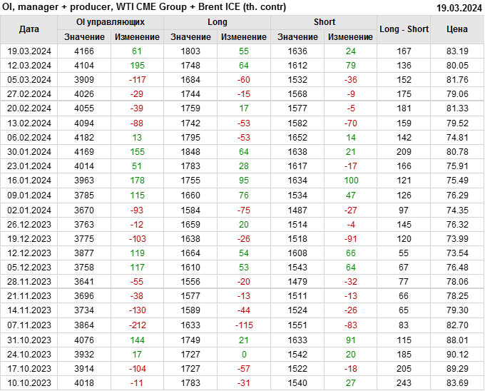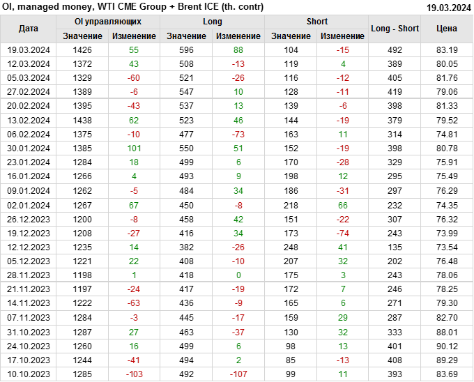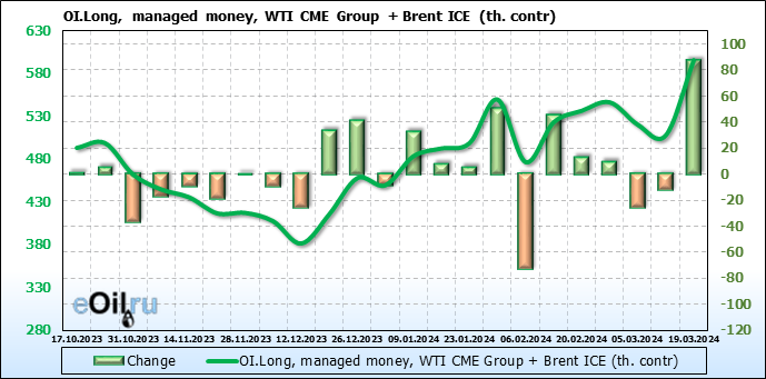 За прошедшую неделю, 13.03.24 — 19.03.24, разница между длинными и короткими позициями управляющих увеличилась на 103.3 тыс. контрактов. В тоже время, цена выросла на 3.14 доллара.