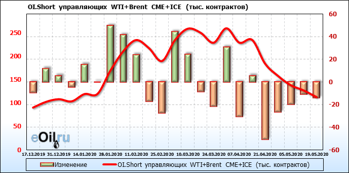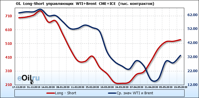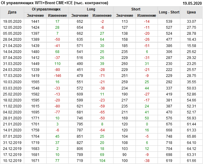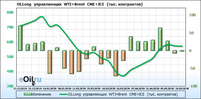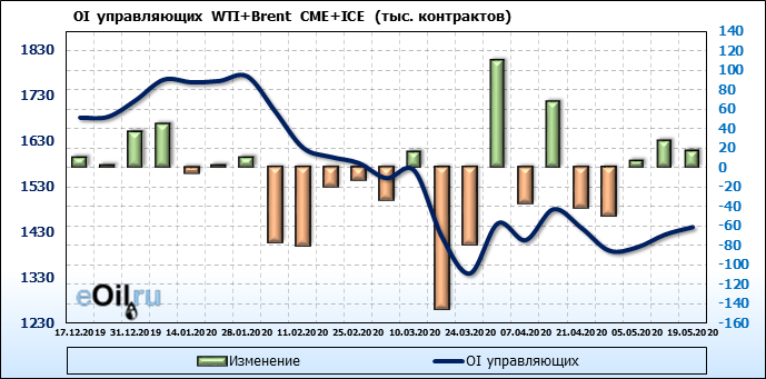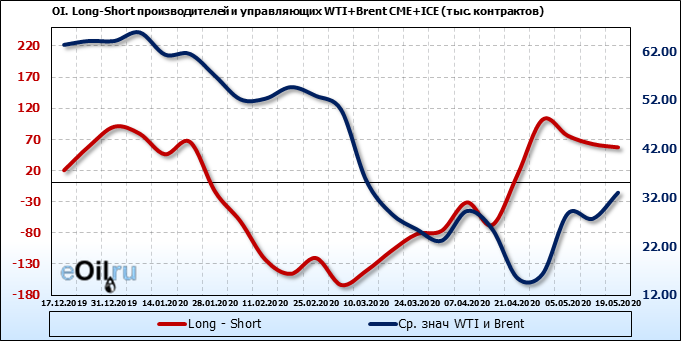 За прошлую неделю, 13.05.20 — 19.05.20, разница между длинными и короткими позициями управляющих выросла на 12 тыс. контрактов. В тоже время, цена выросла на 5.32 доллара. Управляющие наращивают позиции, разгоняя тем самым рост цен, что говорит нам о текущей силе рынка.