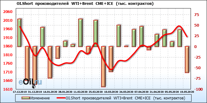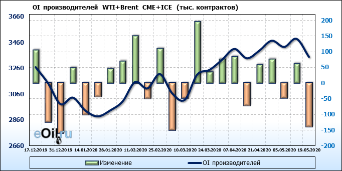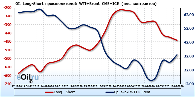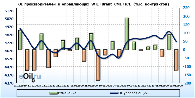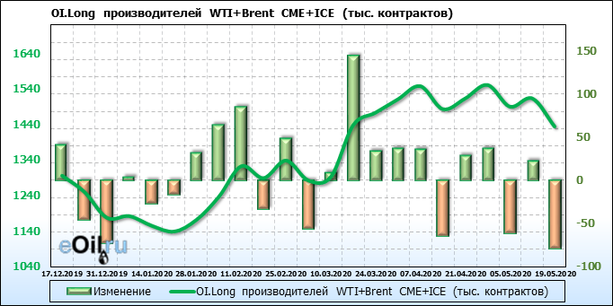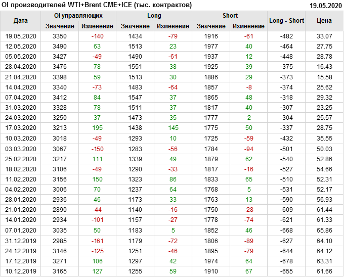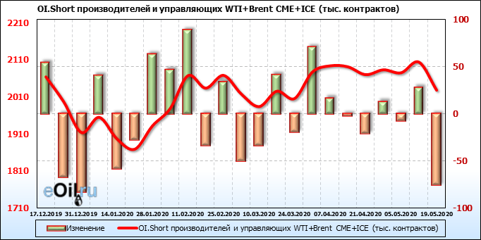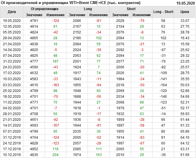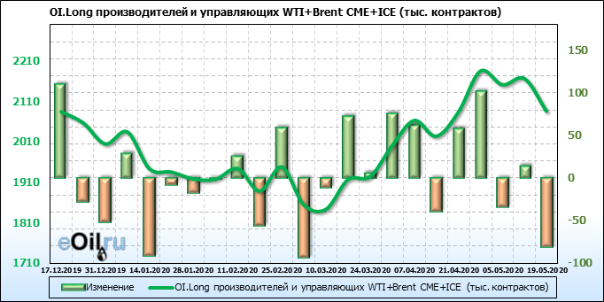 За прошлую неделю, 13.05.20 — 19.05.20, разница между длинными и короткими позициями производителей и управляющих упала на 5 тыс. контрактов. За отчетный период времени, цена выросла на 5.32 доллара. Разница совокупного объема длинных и коротких позиций производителей и управляющих на прошедшей неделе снизилась, в то время как цены выросли. Рынок теряет доверие покупателей, что, при продолжении данной динамики, приведет к стабилизации или падению цен в ближайшее время.