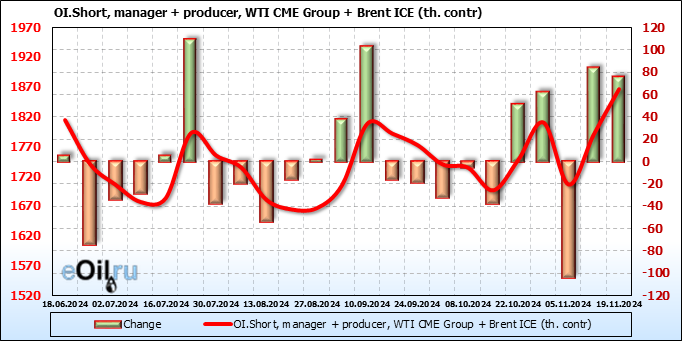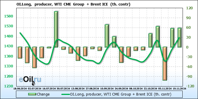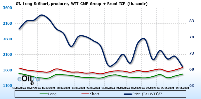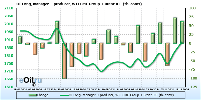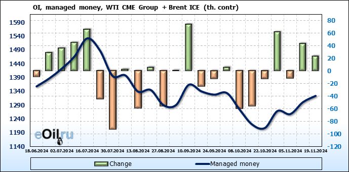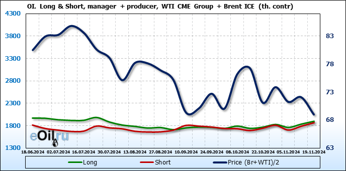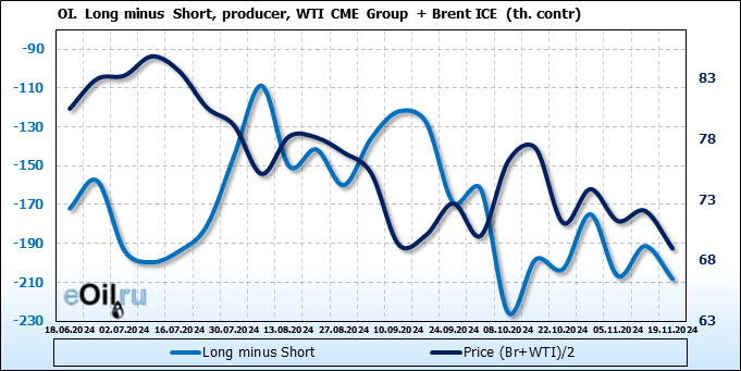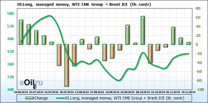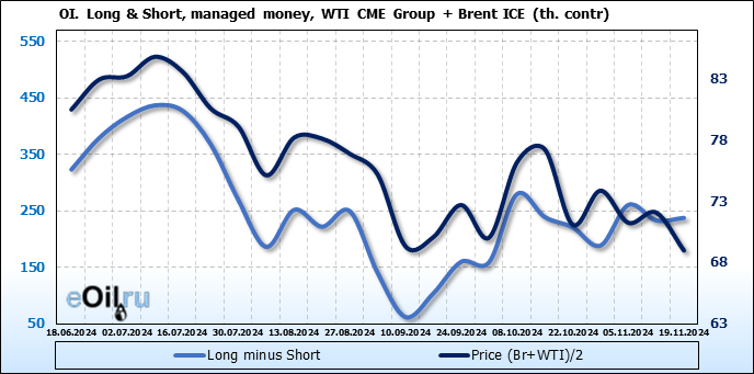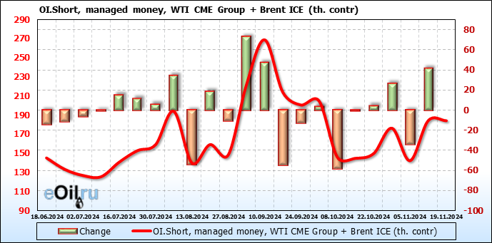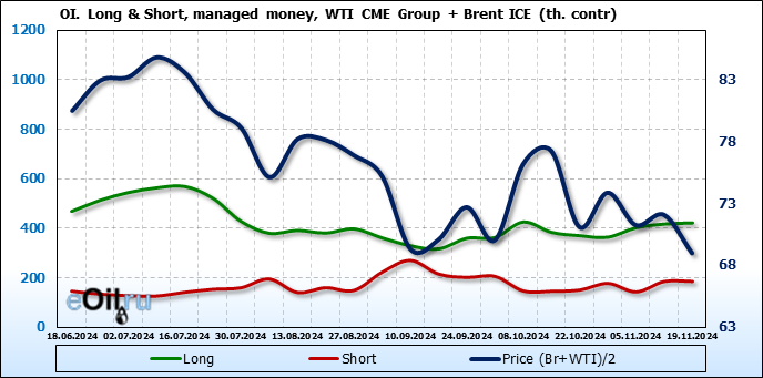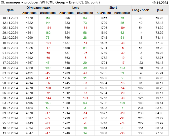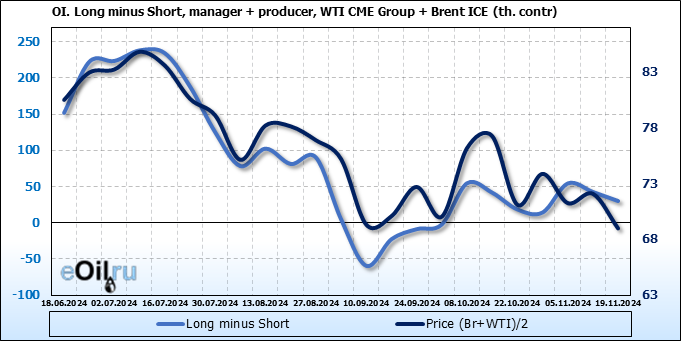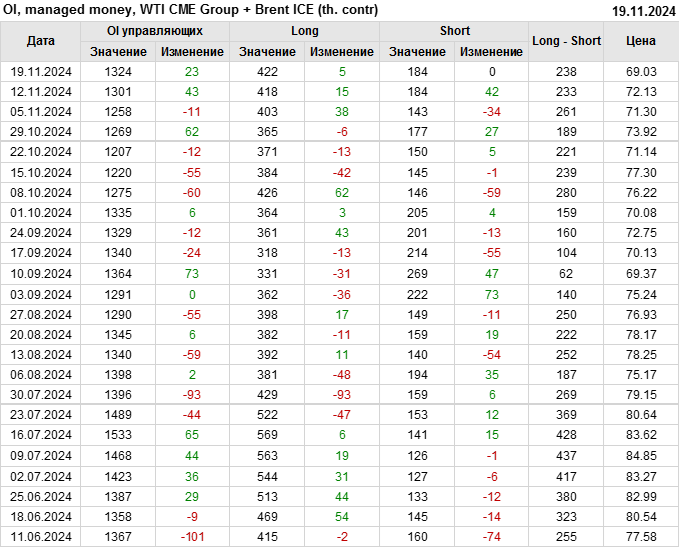 За прошедшую неделю, 13.11.24 — 19.11.24, разница между длинными и короткими позициями управляющих увеличилась на 4.6 тыс. контрактов. В тоже время, цена упала на 3.1 доллара.