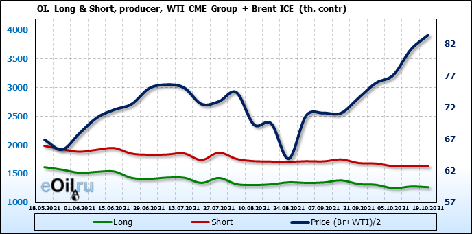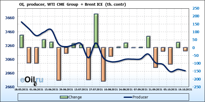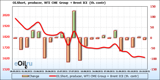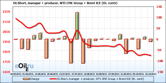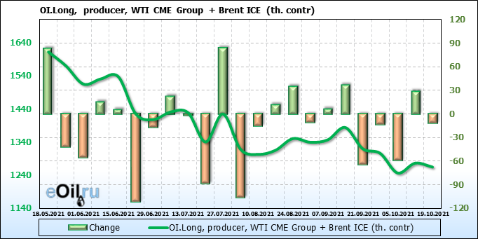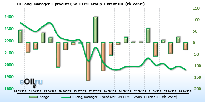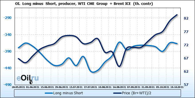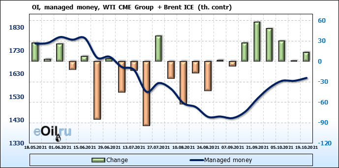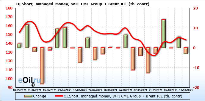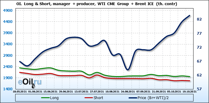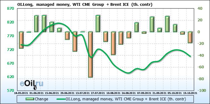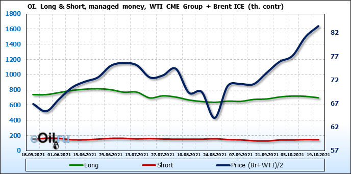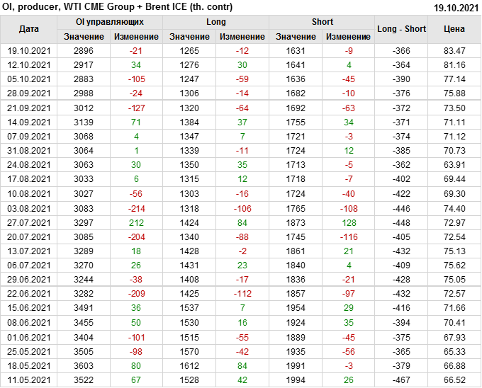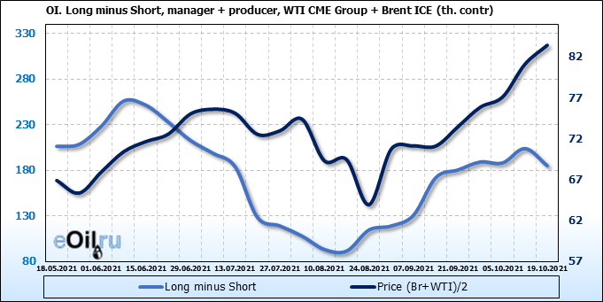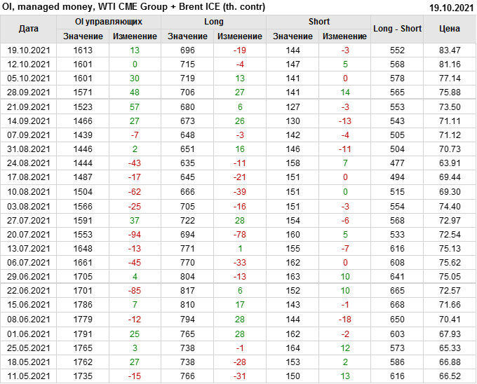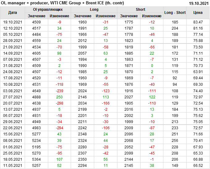 За прошлую неделю, 13.10.21 — 19.10.21, разница между длинными и короткими позициями управляющих сократилась на 16.6 тыс. контрактов. В тоже время, цена выросла на 2.31 доллара.