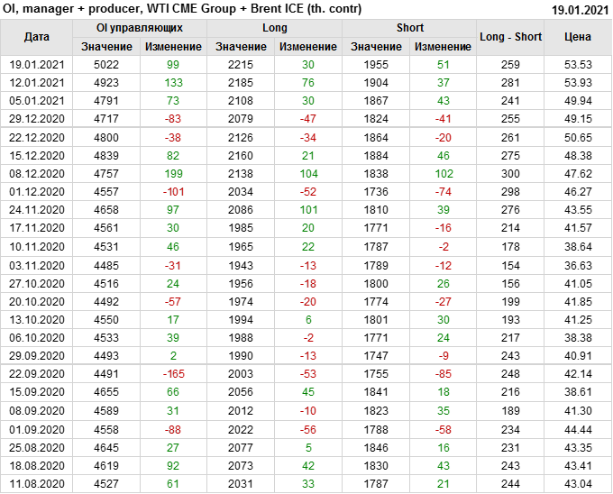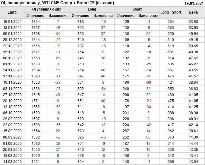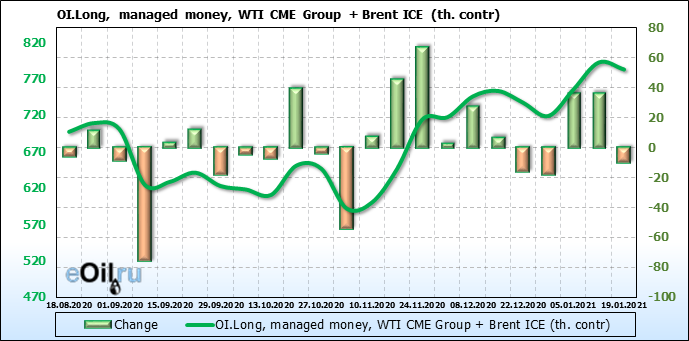 За прошлую неделю, 13.01.21 — 19.01.21, разница между длинными и короткими позициями управляющих упала на 9 тыс. контрактов. В тоже время, цена упала на 0.4 доллара. Наращивание коротких позиций спекулянтами приводит к падению цен. Если давление со стороны медведей продолжится, то мы можем увидеть новые минимумы.