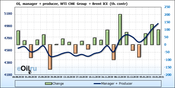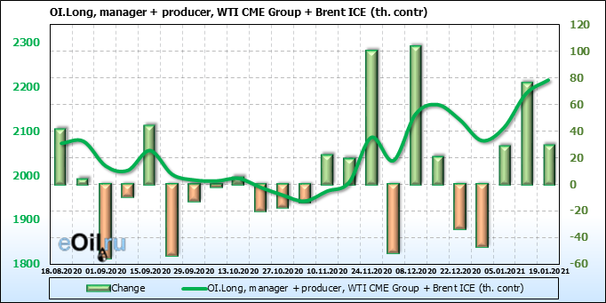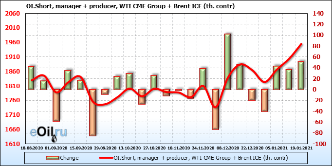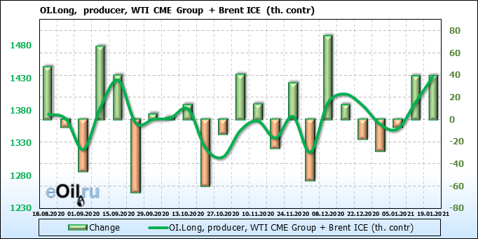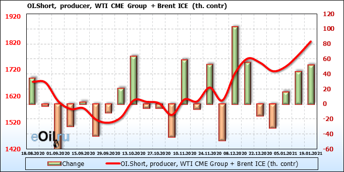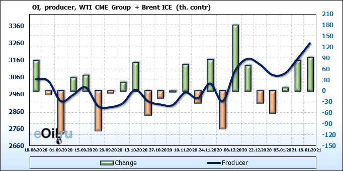 За прошлую неделю, 13.01.21 — 19.01.21, разница между длинными и короткими позициями производителей упала на 12 тыс. контрактов. В тоже время, цена упала на 0.4 доллара. Производители наращивают короткие позиции, что не дает цене расти. В такой ситуации на рынке возможно ускорение падения цен.