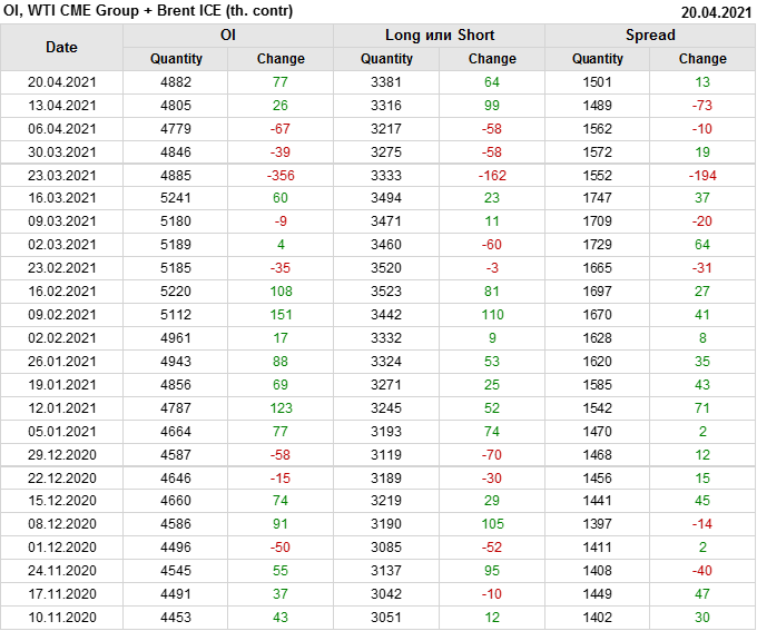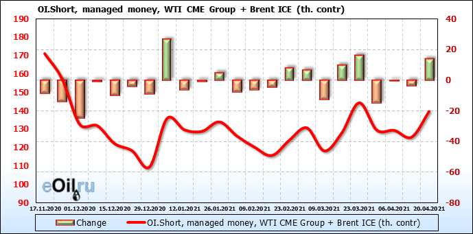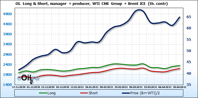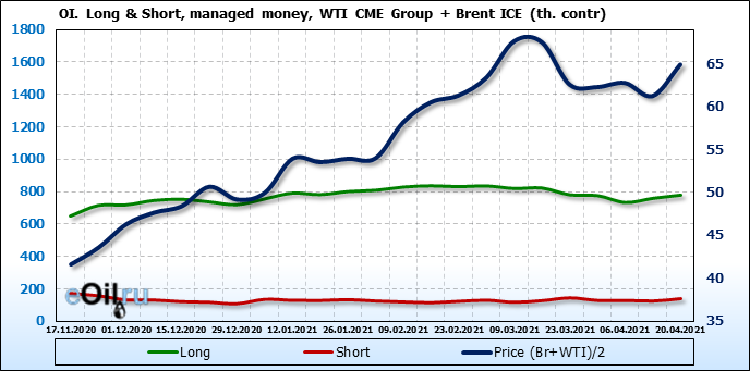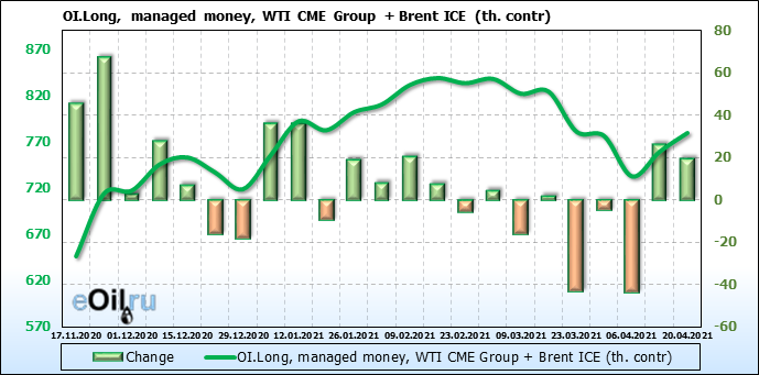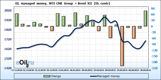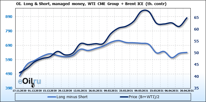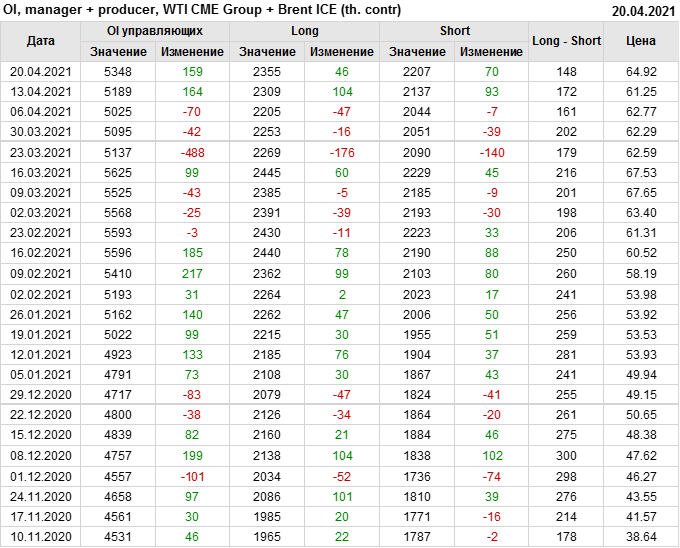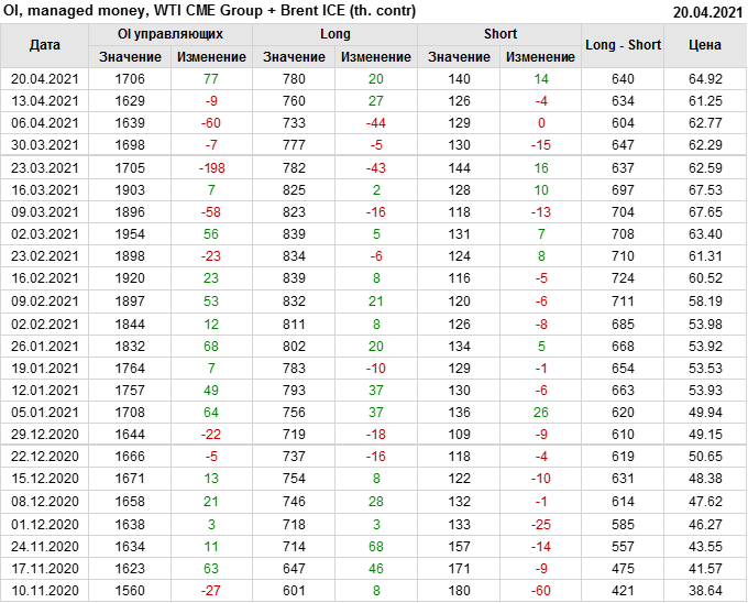 За прошлую неделю, 14.04.21 — 20.04.21, разница между длинными и короткими позициями управляющих выросла на 6 тыс. контрактов. В тоже время, цена выросла на 3.67 доллара. Управляющие наращивают позиции, разгоняя тем самым рост цен, что говорит нам о текущей силе рынка.