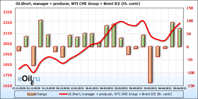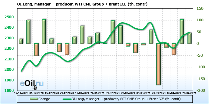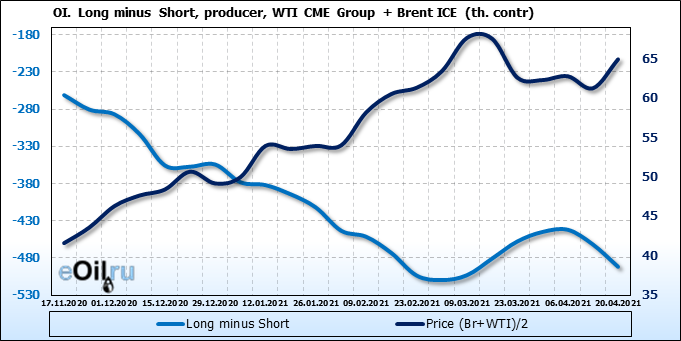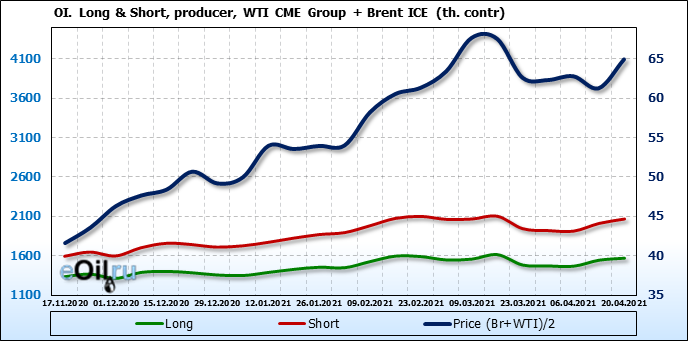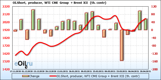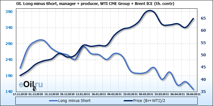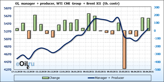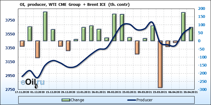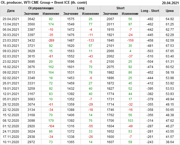 За прошлую неделю, 14.04.21 — 20.04.21, разница между длинными и короткими позициями производителей и управляющих упала на 24 тыс. контрактов. За отчетный период времени, цена выросла на 3.67 доллара. Разница совокупного объема длинных и коротких позиций производителей и управляющих на прошедшей неделе снизилась, в то время как цены выросли. Рынок теряет доверие покупателей, что, при продолжении данной динамики, приведет к стабилизации или падению цен в ближайшее время.