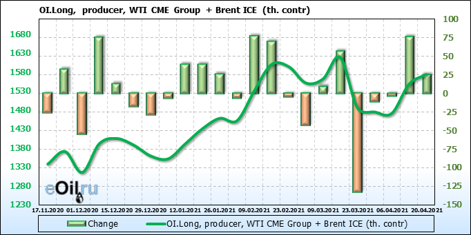 За прошлую неделю, 14.04.21 — 20.04.21, разница между длинными и короткими позициями производителей выросла на 30 тыс. контрактов. В тоже время, цена выросла на 3.67 доллара. Производители увеличивают продажи, предполагая, что текущие уровни являются привлекательными для них. И не смотря на это, рынок продолжает расти, что показывает силу текущего тренда.