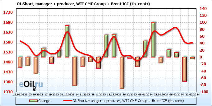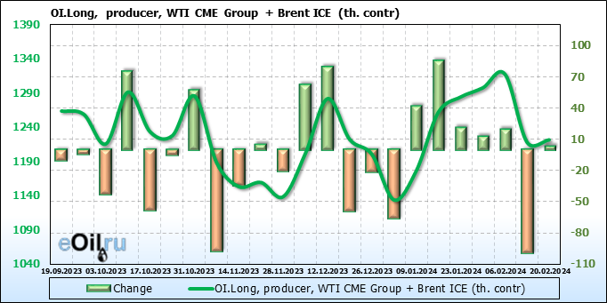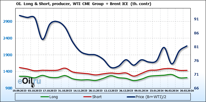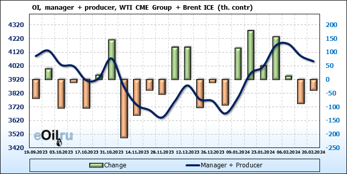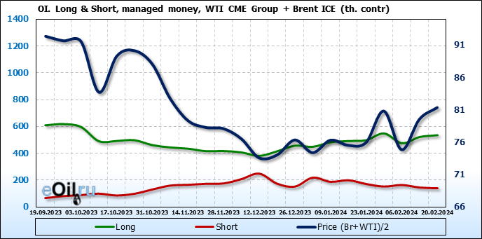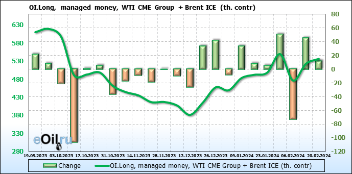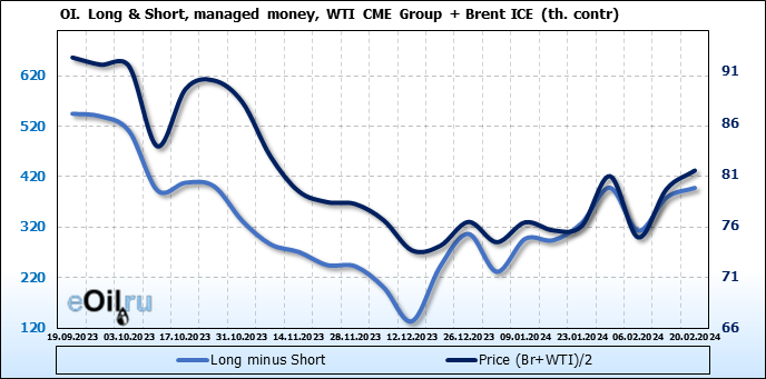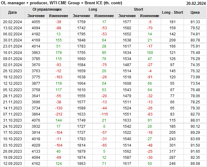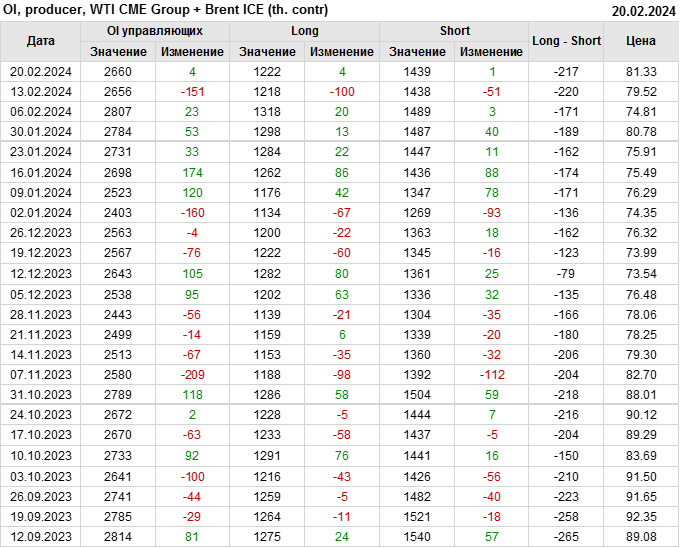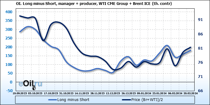За прошедшую неделю, 14.02.24 — 20.02.24, разница между длинными и короткими позициями управляющих увеличилась на 19 тыс. контрактов. В тоже время, цена выросла на 1.81 доллара.