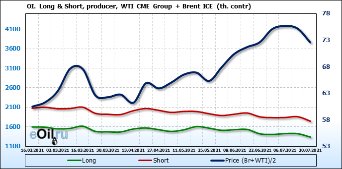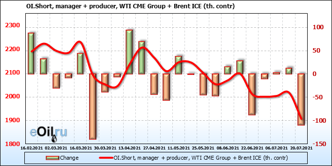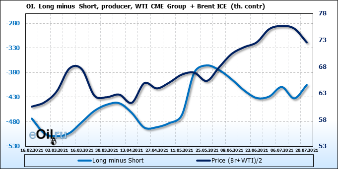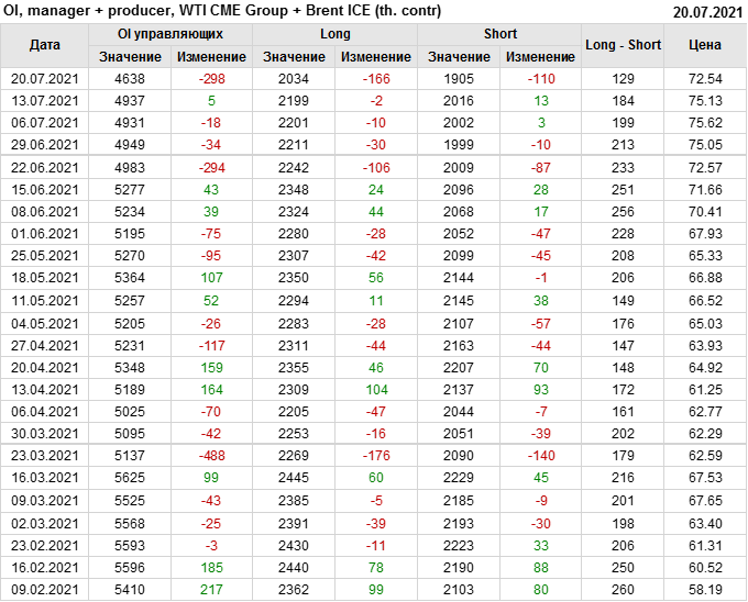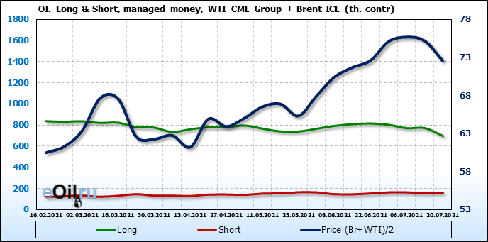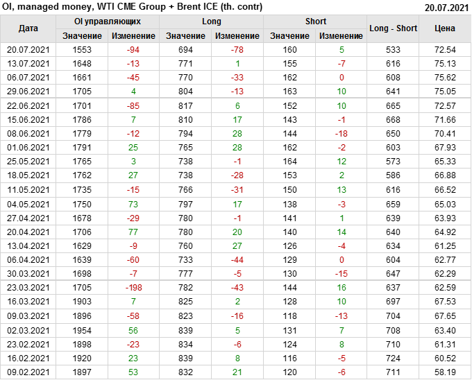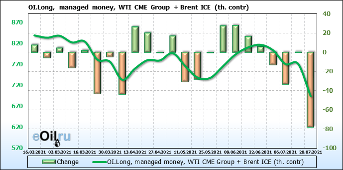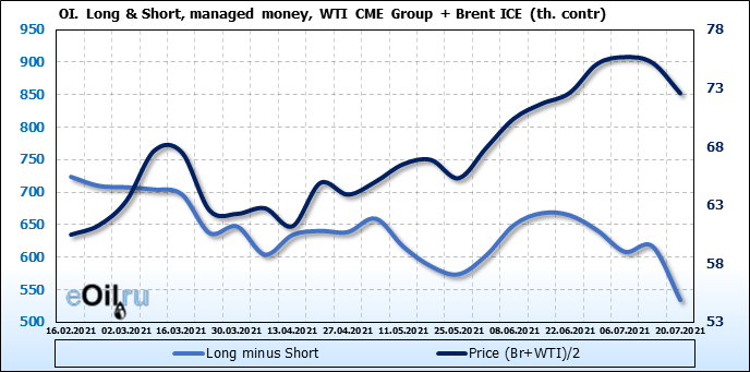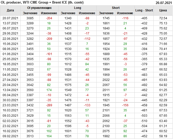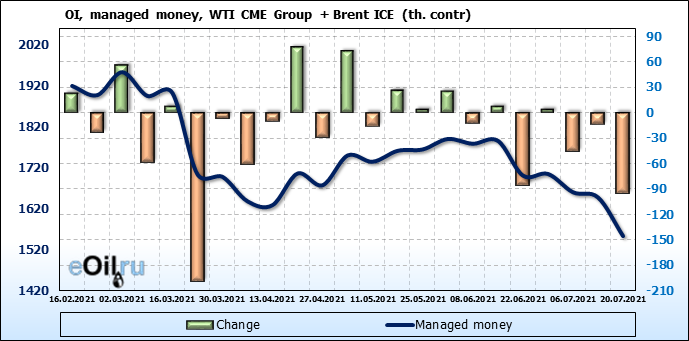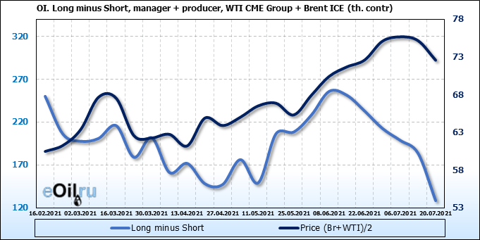 За прошлую неделю, 14.07.21 — 20.07.21, разница между длинными и короткими позициями управляющих сократилась на 82.8 тыс. контрактов. В тоже время, цена упала на 2.59 доллара.
