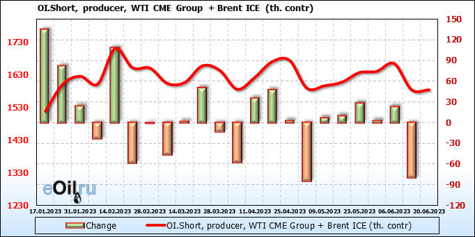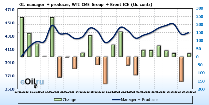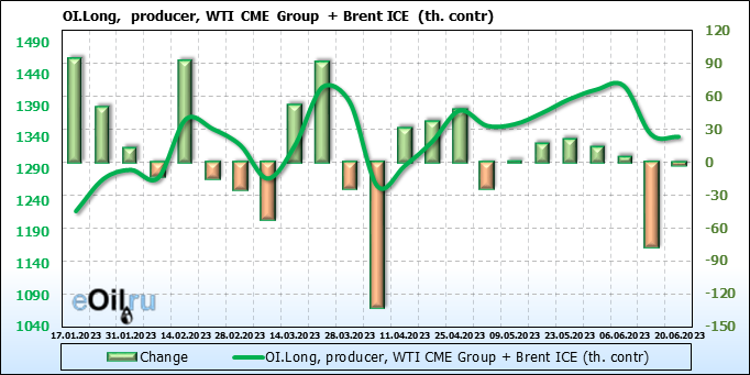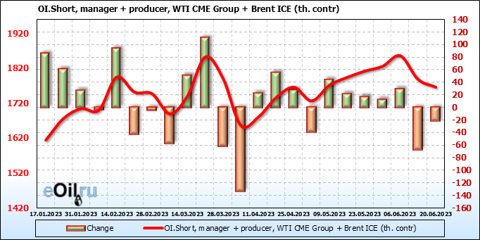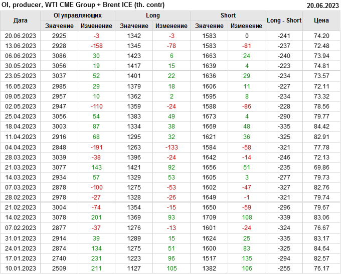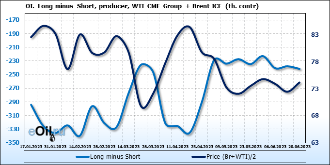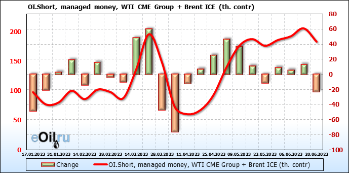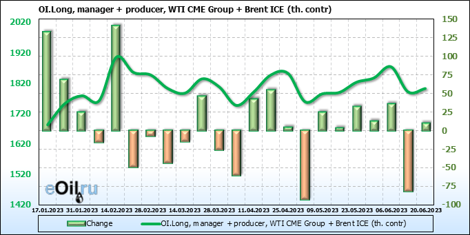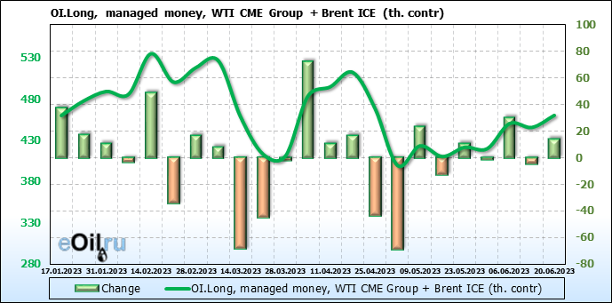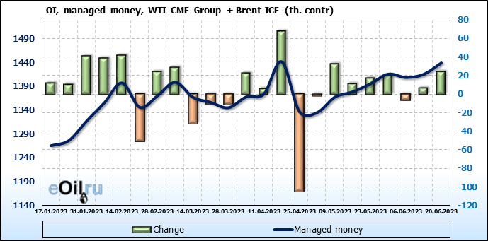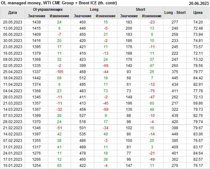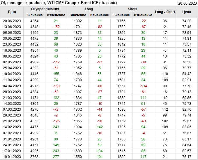 За прошедшую неделю, 14.06.23 — 20.06.23, разница между длинными и короткими позициями управляющих увеличилась на 37.3 тыс. контрактов. В тоже время, цена выросла на 1.72 доллара.