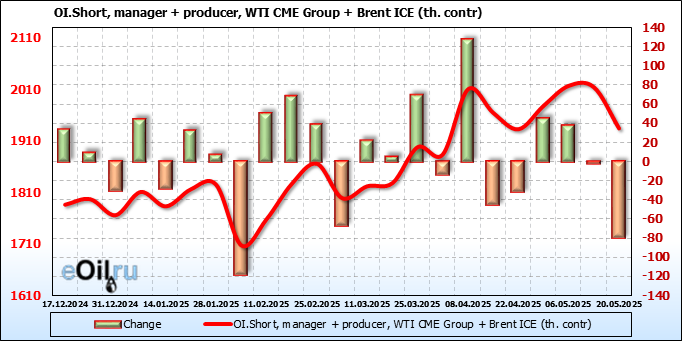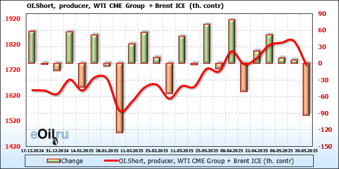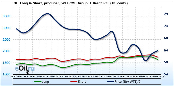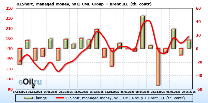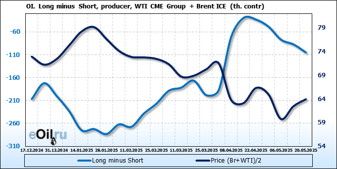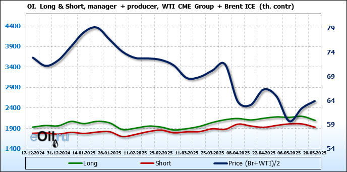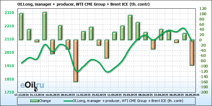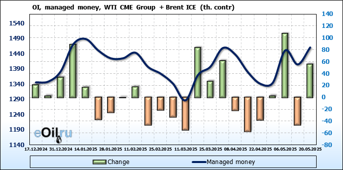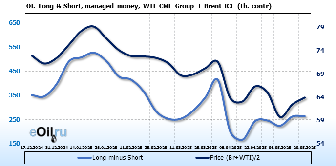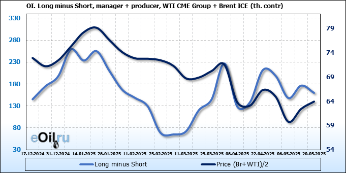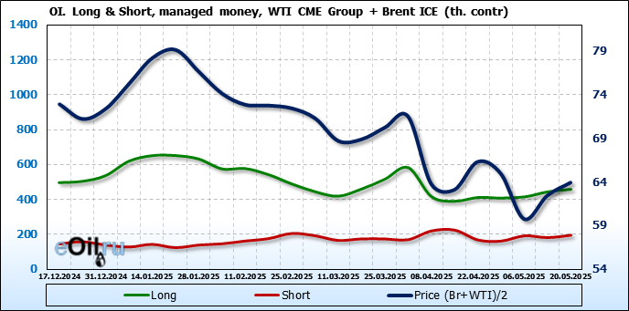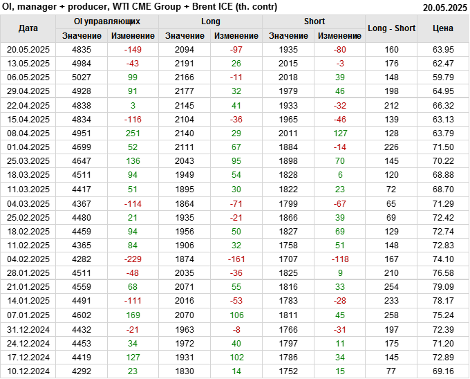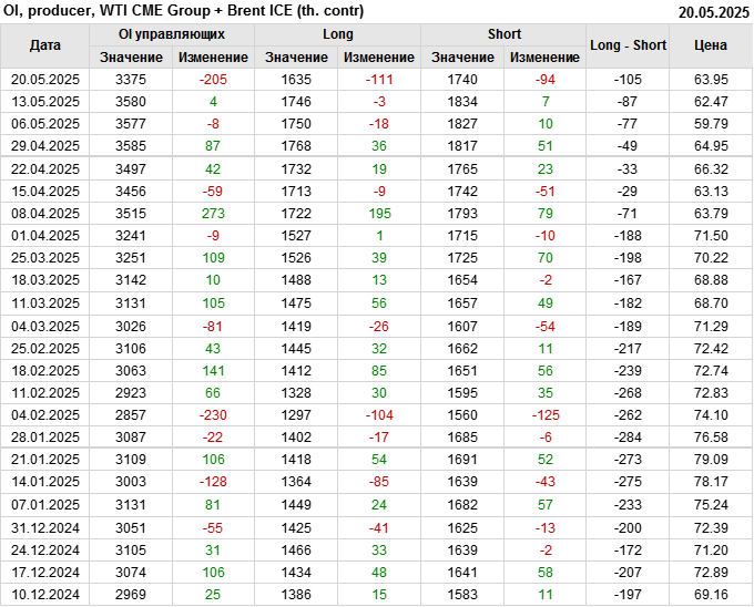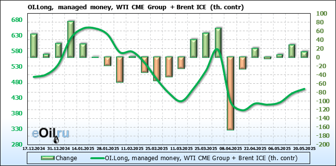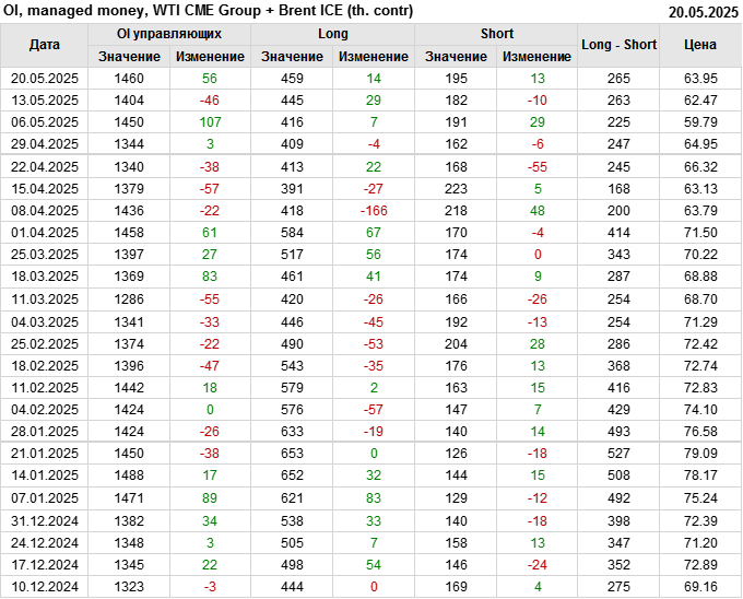 За прошедшую неделю, 14.05.25 — 20.05.25, разница между длинными и короткими позициями управляющих увеличилась на 1.2 тыс. контрактов. В тоже время, цена выросла на 1.48 доллара.