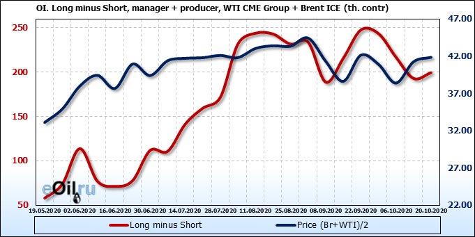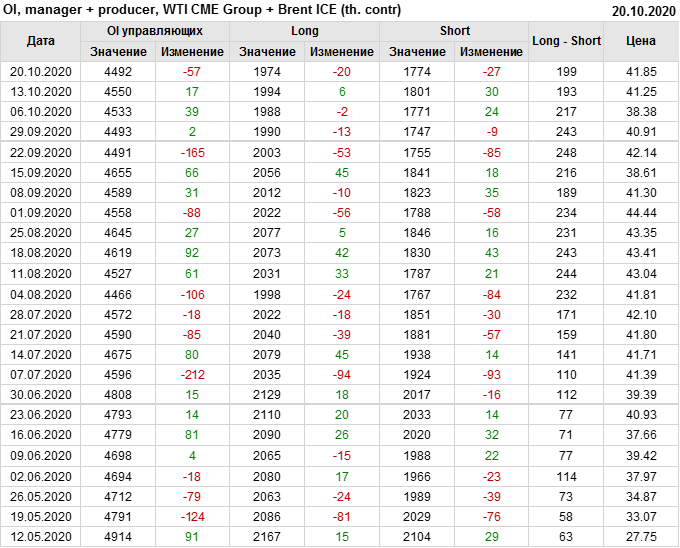 За прошлую неделю, 14.10.20 — 20.10.20, разница между длинными и короткими позициями производителей и управляющих выросла на 7 тыс. контрактов. За отчетный период времени, цена выросла на 0.6 доллара. Совокупно производители и управляющие наращивают длинные позиции, поддерживая рост цен. Это сильная комбинация, которая должна вызывать доверие у всё большего числа быков.