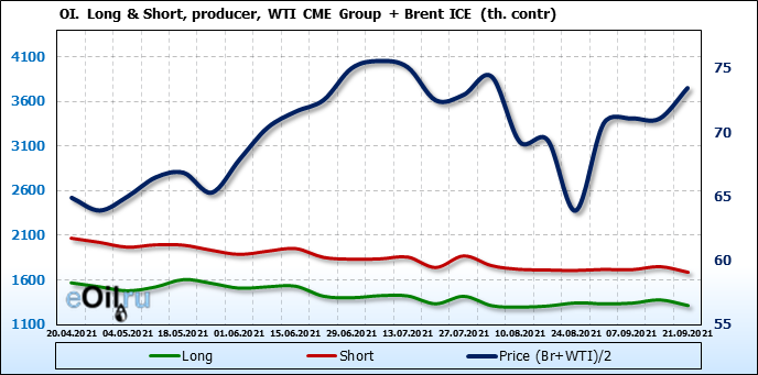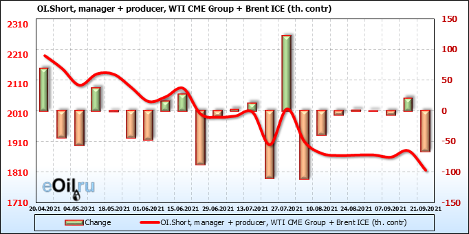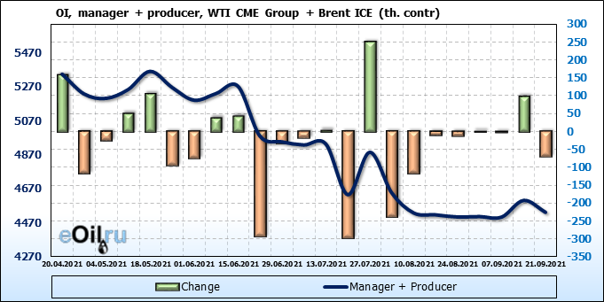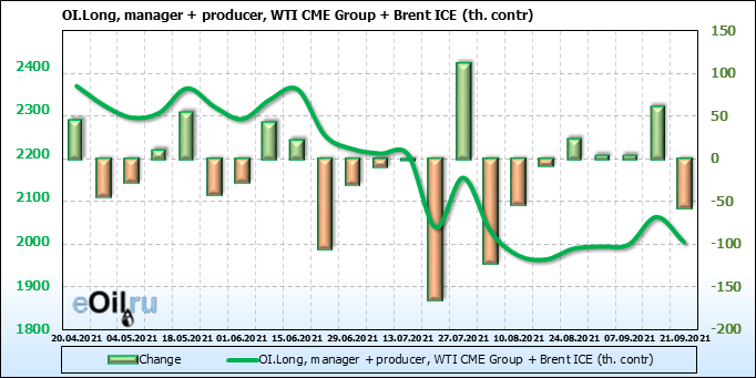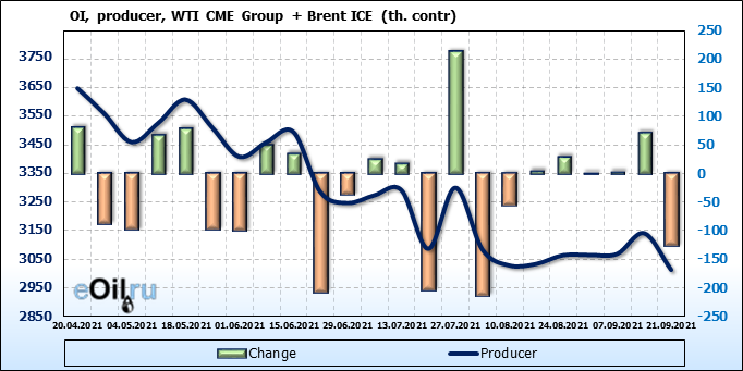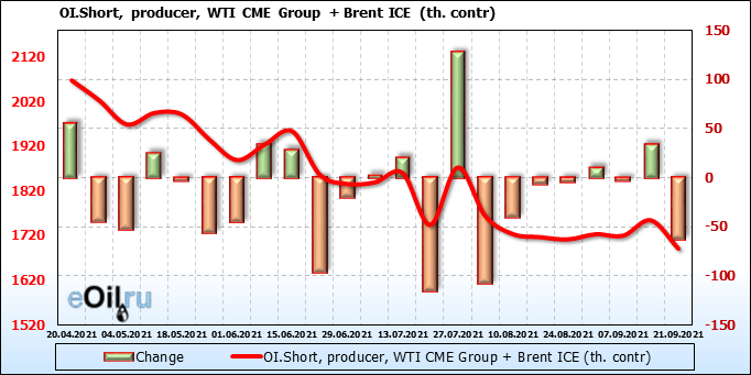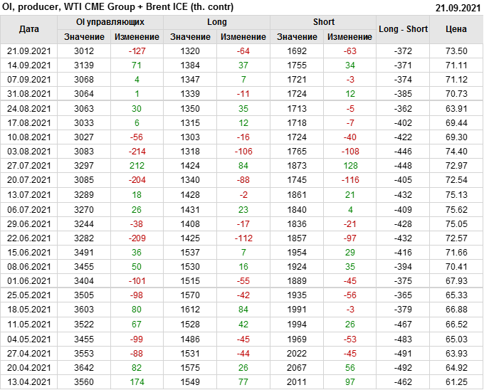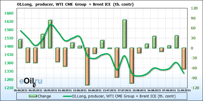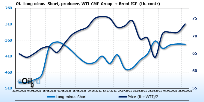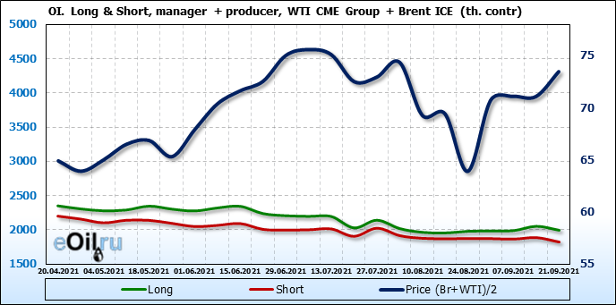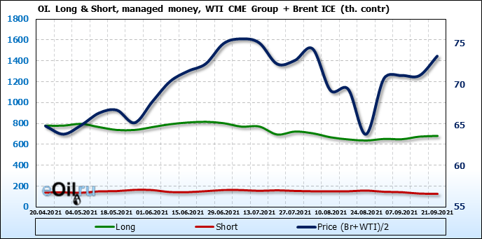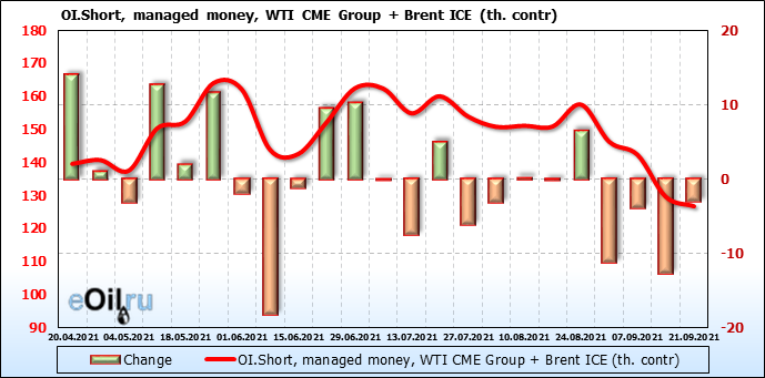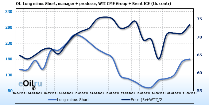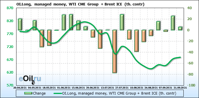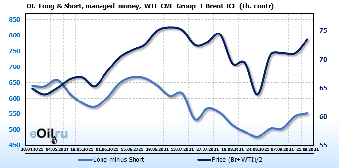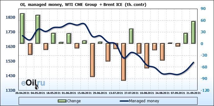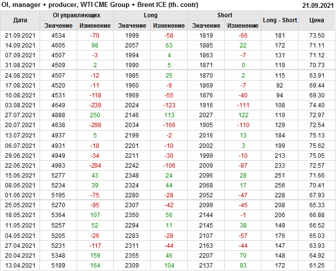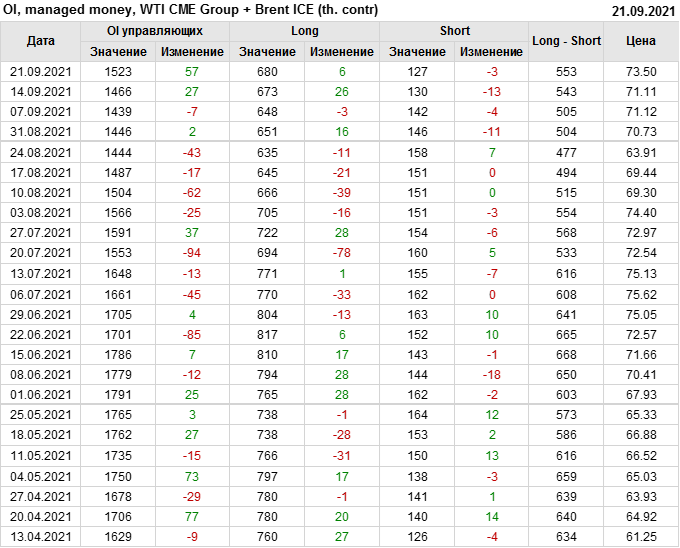 За прошлую неделю, 15.09.21 — 21.09.21, разница между длинными и короткими позициями управляющих увеличилась на 9.3 тыс. контрактов. В тоже время, цена выросла на 2.39 доллара.