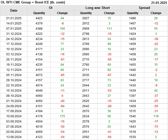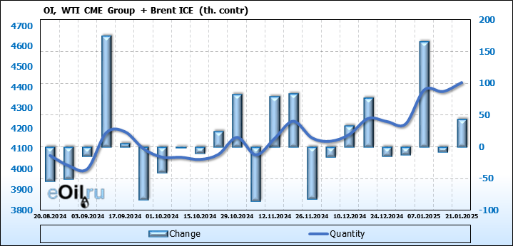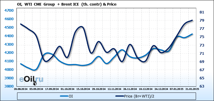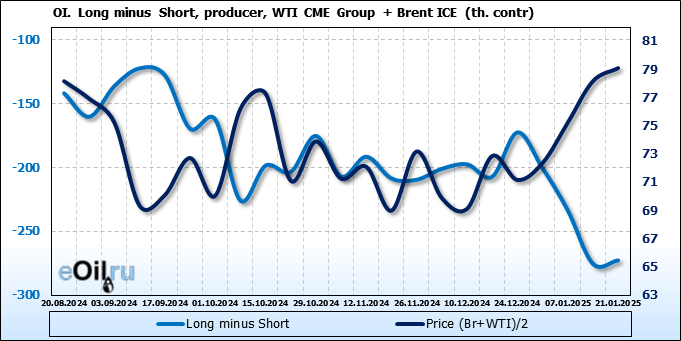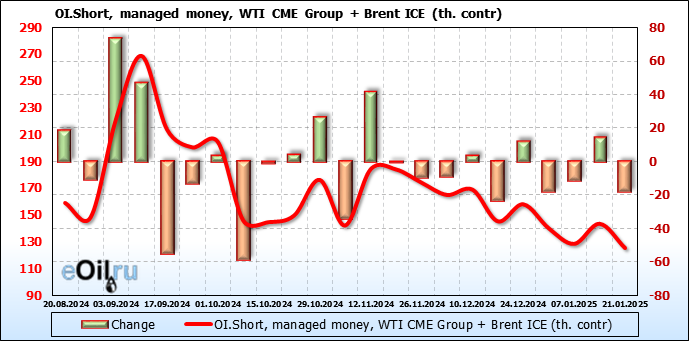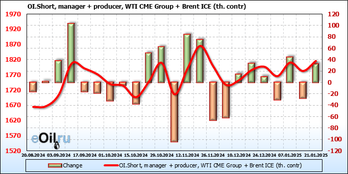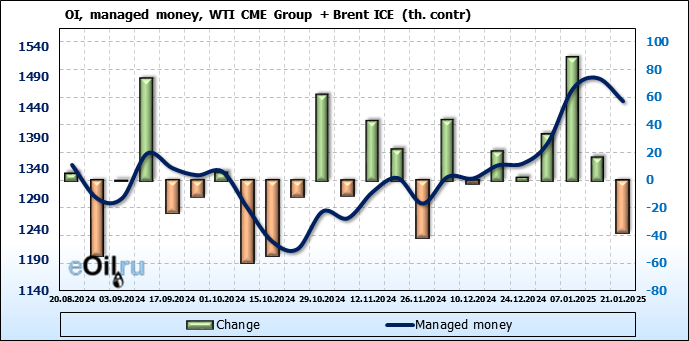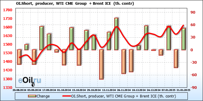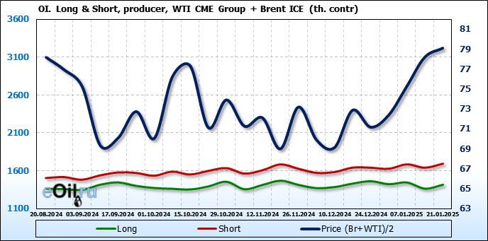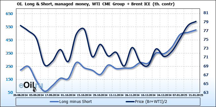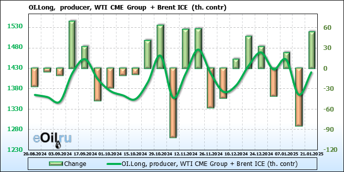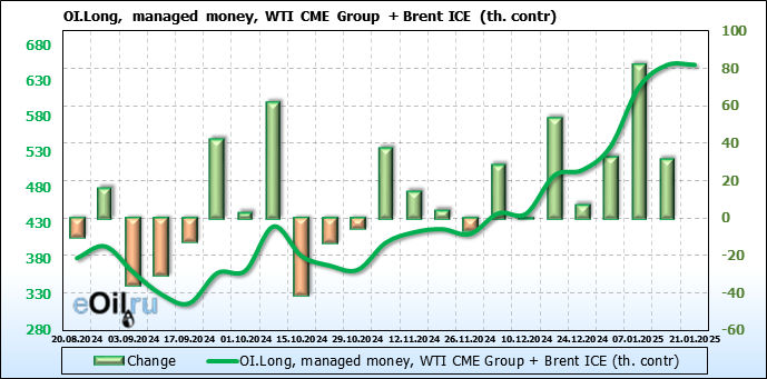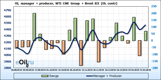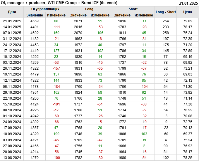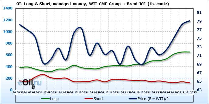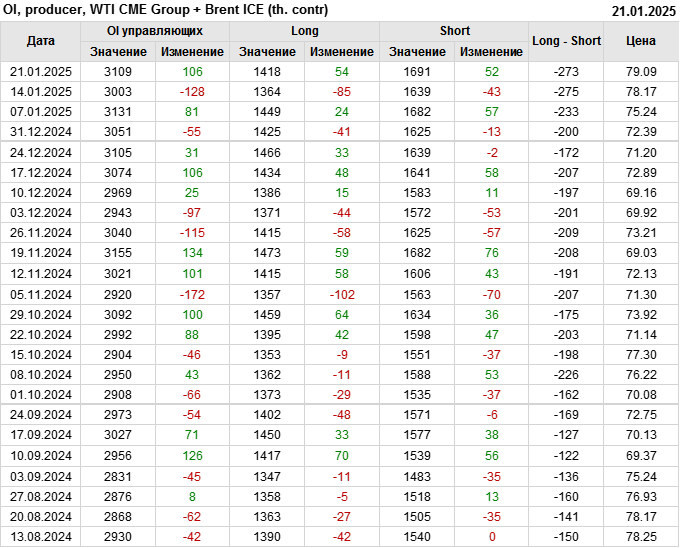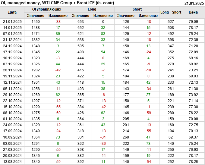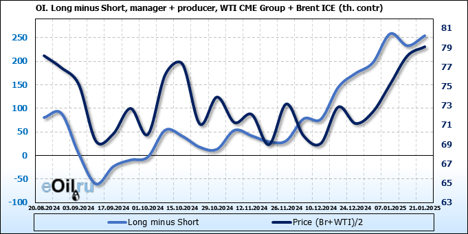 За прошедшую неделю, 15.01.25 — 21.01.25, разница между длинными и короткими позициями управляющих увеличилась на 18.7 тыс. контрактов. В тоже время, цена выросла на 0.92 доллара.