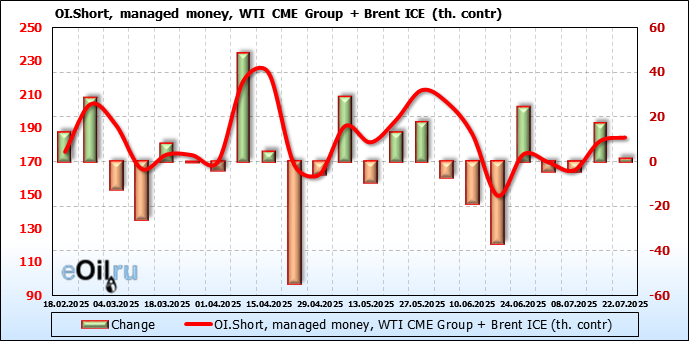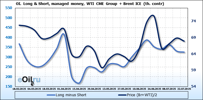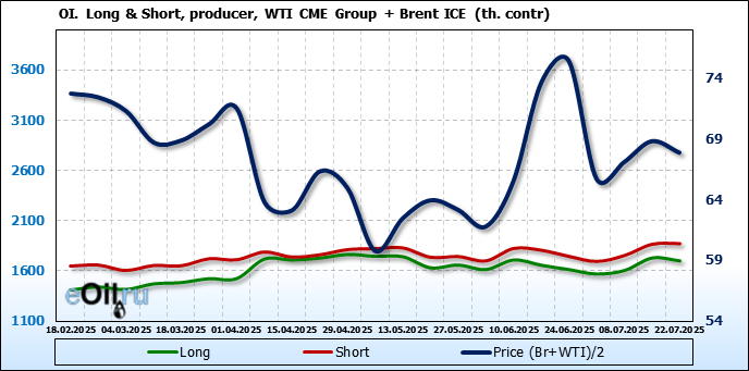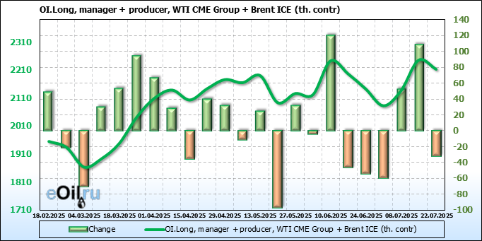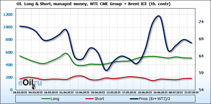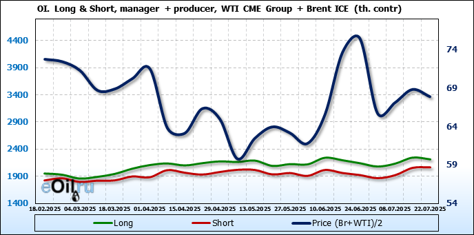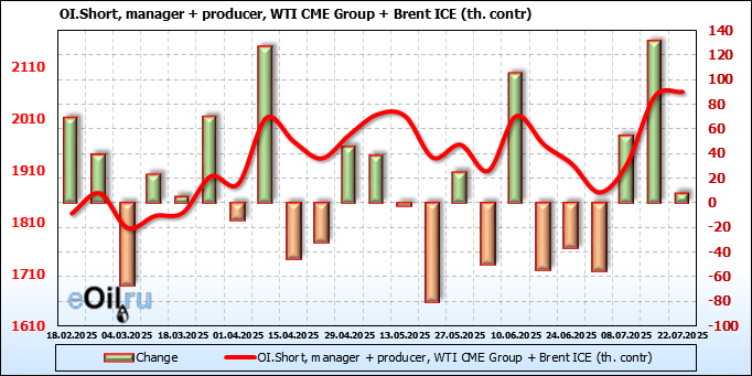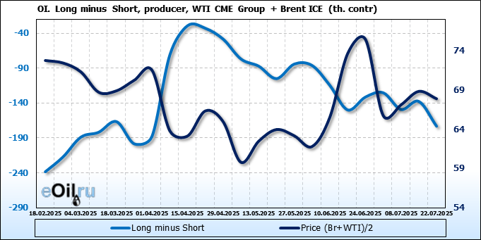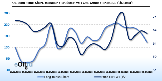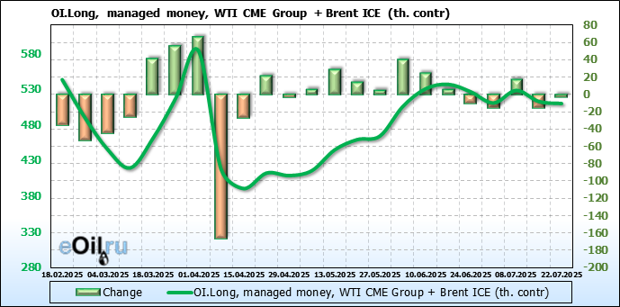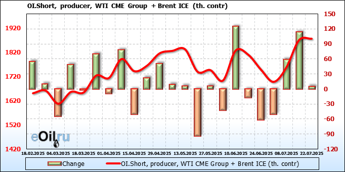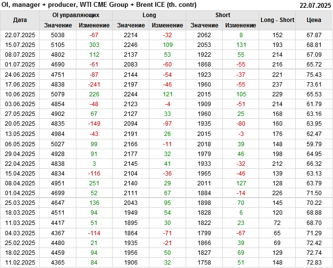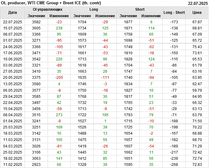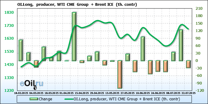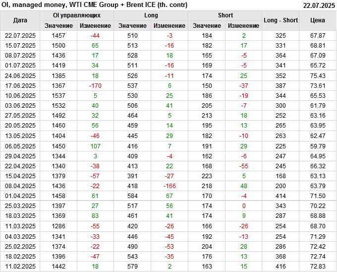 За прошедшую неделю, 16.07.25 — 22.07.25, разница между длинными и короткими позициями управляющих сократилась на 5.1 тыс. контрактов. В тоже время, цена упала на 0.94 доллара.