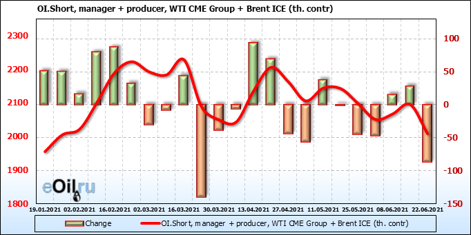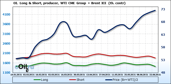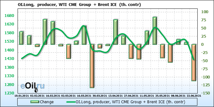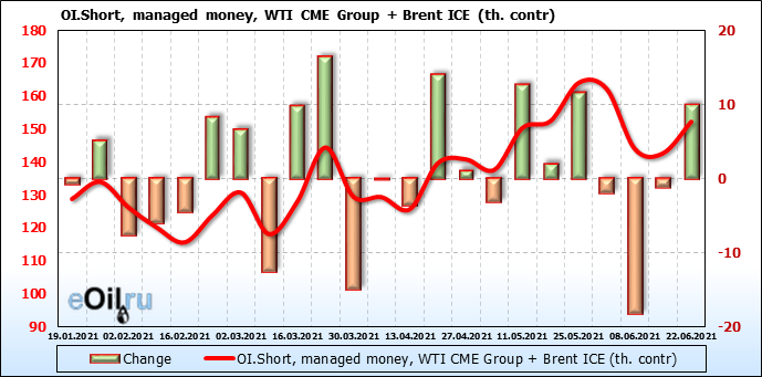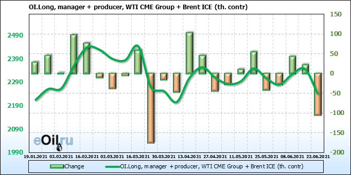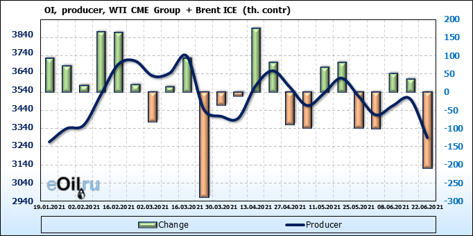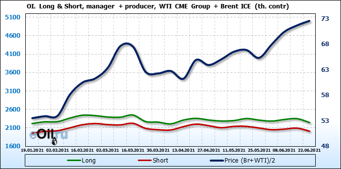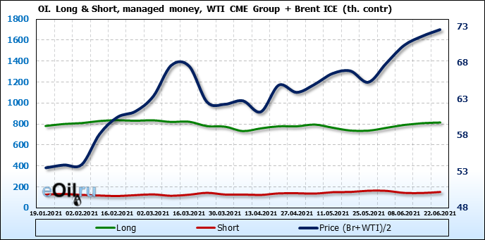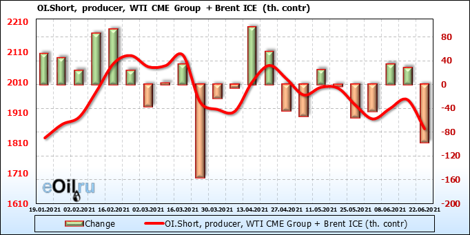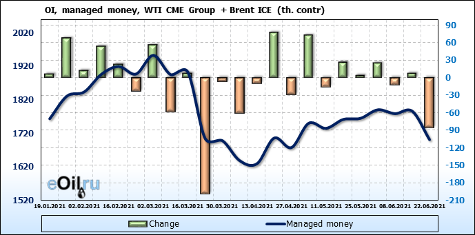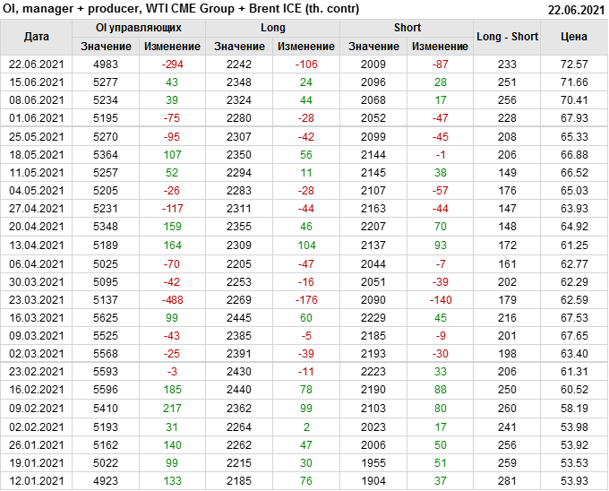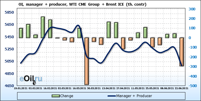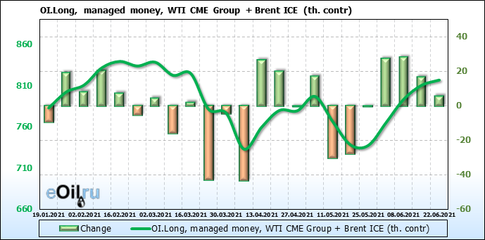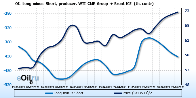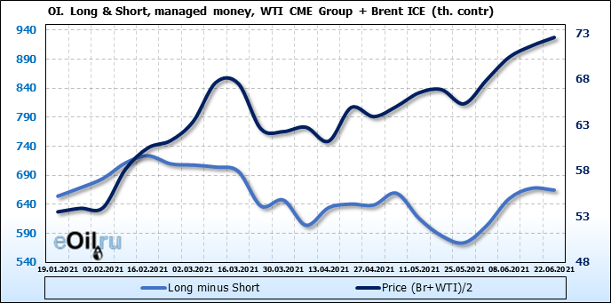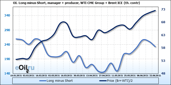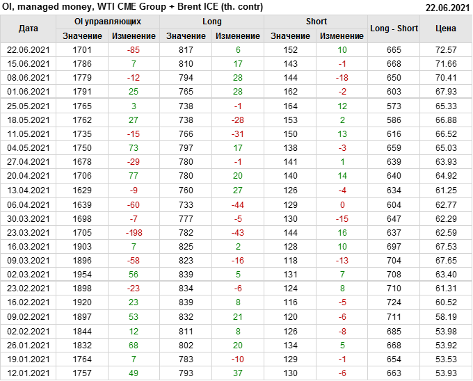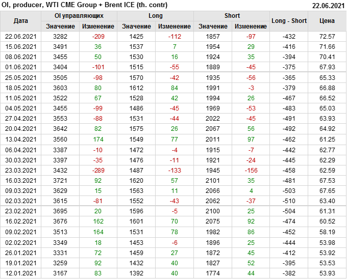 За прошлую неделю, 16.06.21 — 22.06.21, разница между длинными и короткими позициями управляющих сократилась на 3.2 тыс. контрактов. В тоже время, цена выросла на 0.91 доллара.
