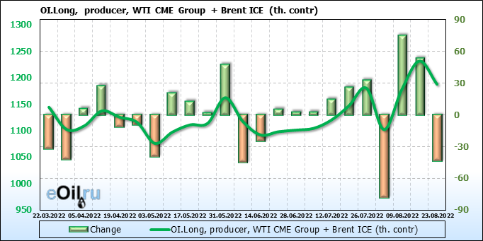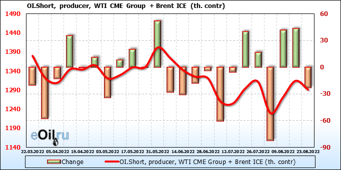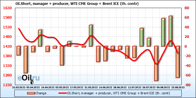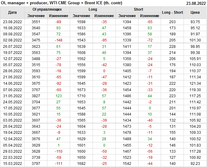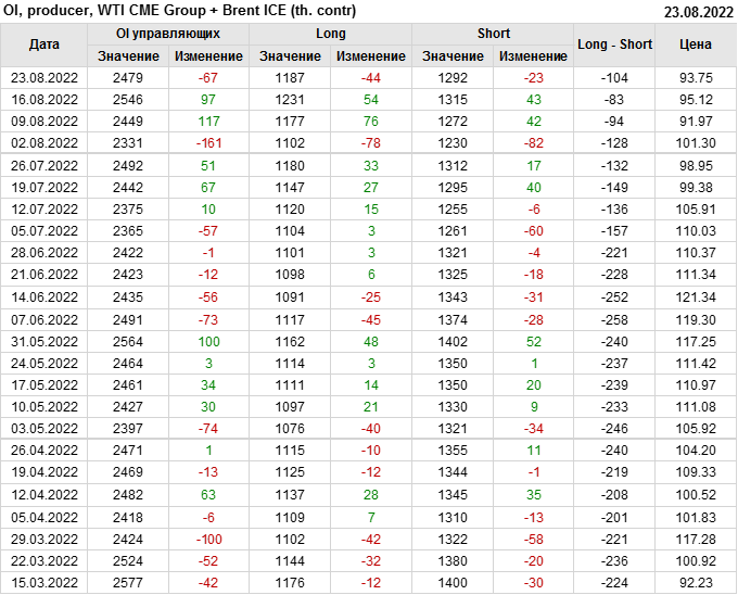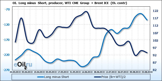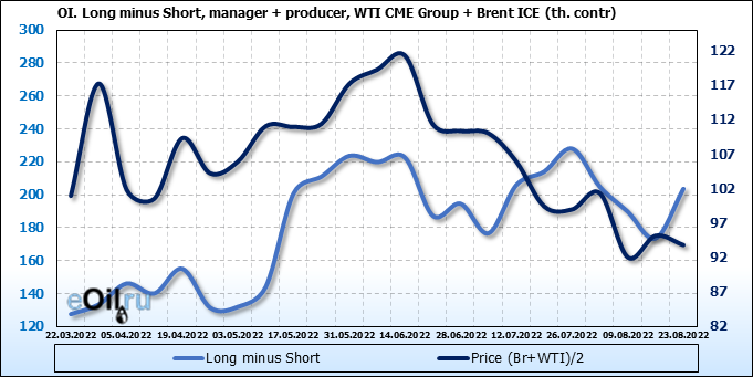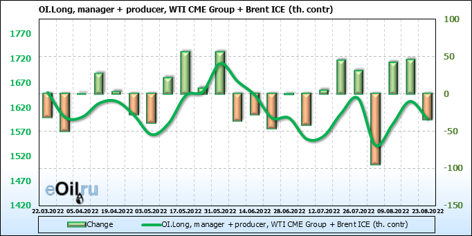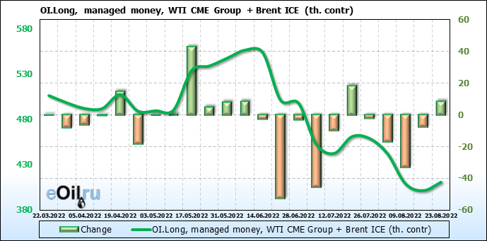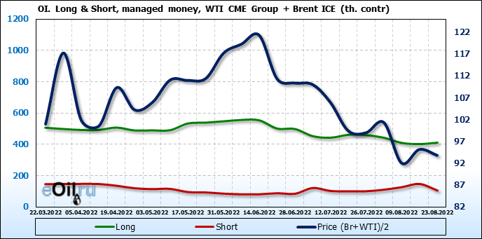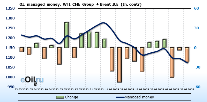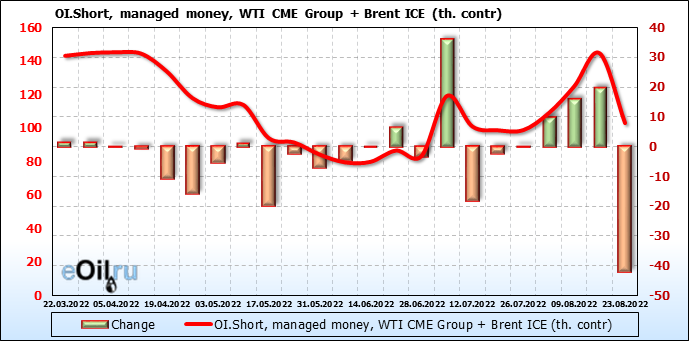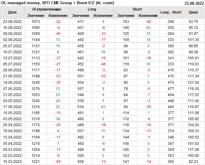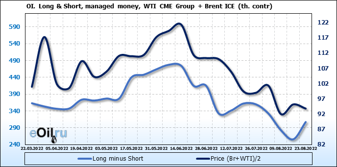 За прошедшую неделю, 17.08.22 — 23.08.22, разница между длинными и короткими позициями управляющих увеличилась на 51.1 тыс. контрактов. В тоже время, цена упала на 1.37 доллара.