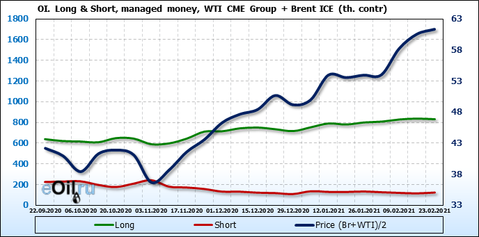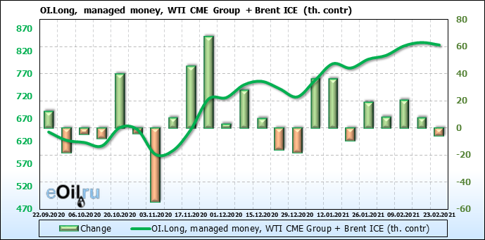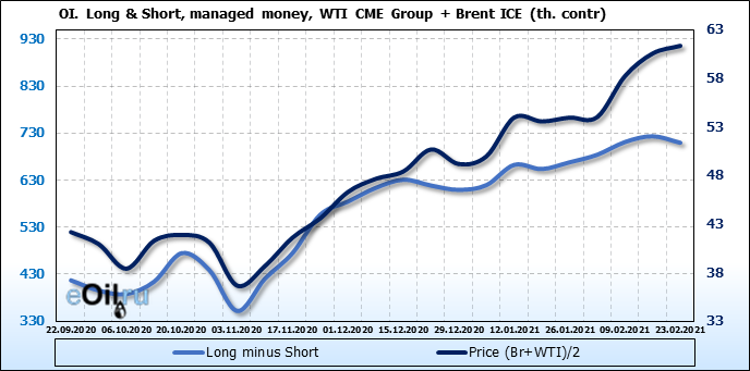За прошлую неделю, 17.02.21 — 23.02.21, разница между длинными и короткими позициями управляющих упала на 14 тыс. контрактов. В тоже время, цена выросла на 0.79 доллара. Управляющие не горят желанием покупать, что заставляет нас рассуждать о потери доверия к тенденции со стороны быков — спекулянтов. Рынок становится более тонким. Без прихода свежих объемов, толкать цену вверх скоро будет некому.
