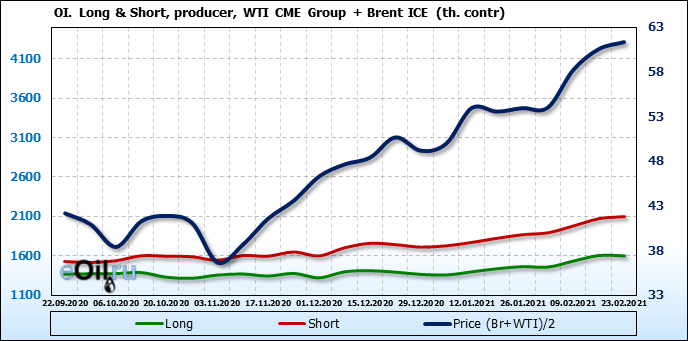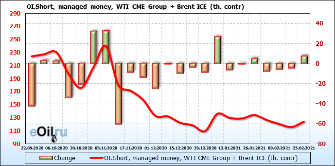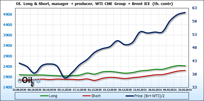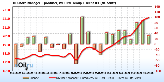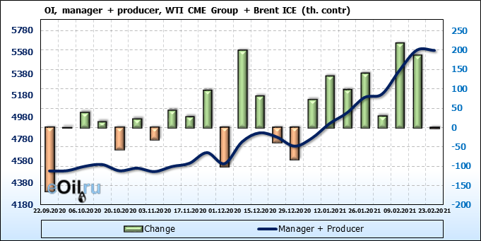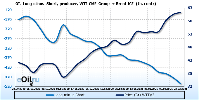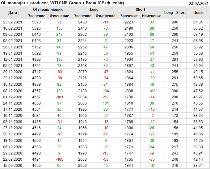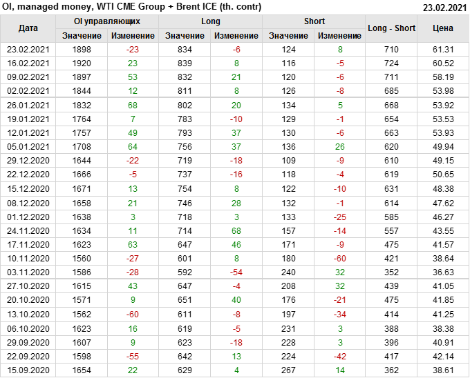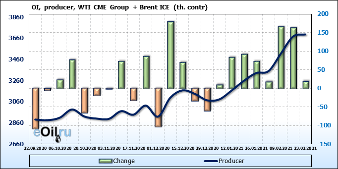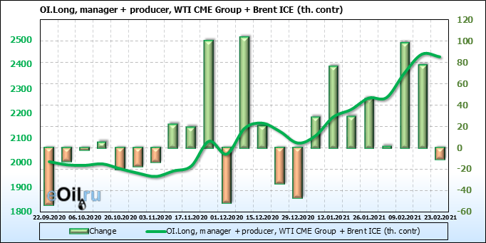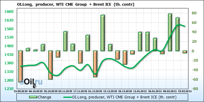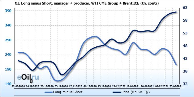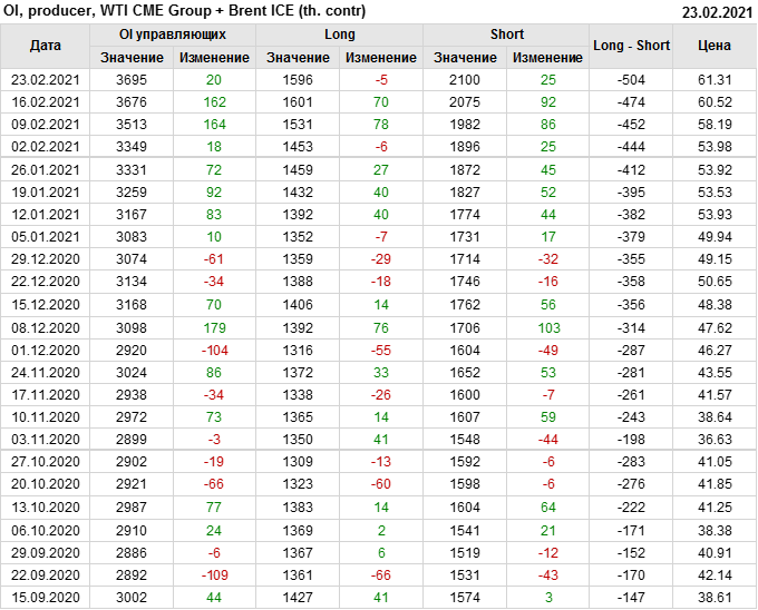 За прошлую неделю, 17.02.21 — 23.02.21, разница между длинными и короткими позициями производителей и управляющих упала на 44 тыс. контрактов. За отчетный период времени, цена выросла на 0.79 доллара. Разница совокупного объема длинных и коротких позиций производителей и управляющих на прошедшей неделе снизилась, в то время как цены выросли. Рынок теряет доверие покупателей, что, при продолжении данной динамики, приведет к стабилизации или падению цен в ближайшее время.