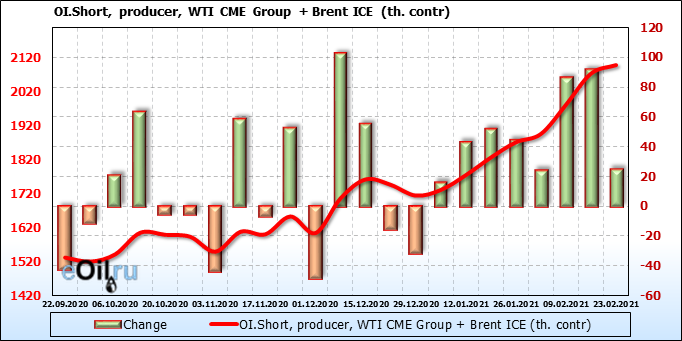 За прошлую неделю, 17.02.21 — 23.02.21, разница между длинными и короткими позициями производителей упала на 30 тыс. контрактов. В тоже время, цена выросла на 0.79 доллара. Производители увеличивают продажи, предполагая, что текущие уровни являются привлекательными для них. И не смотря на это, рынок продолжает расти, что показывает силу текущего тренда.
