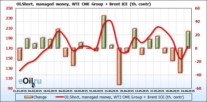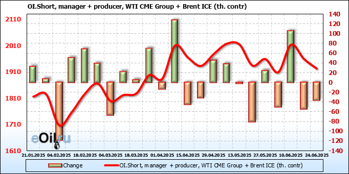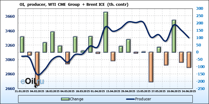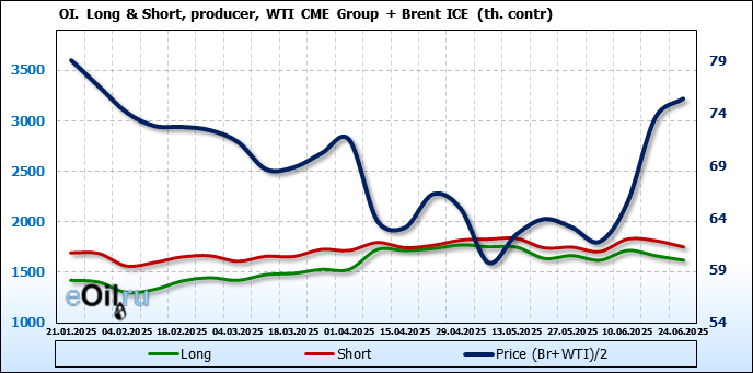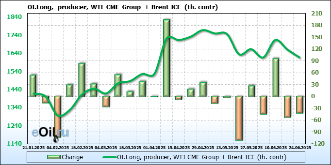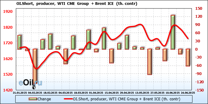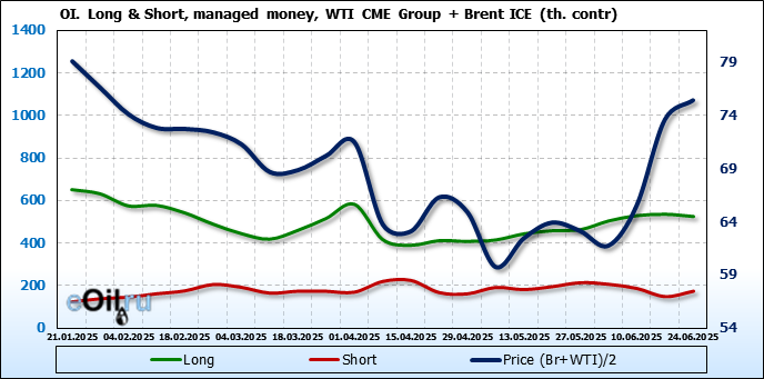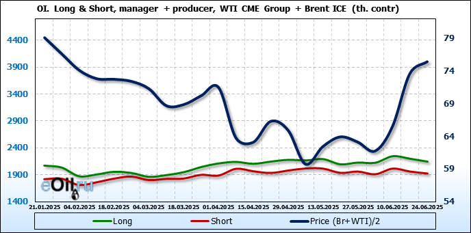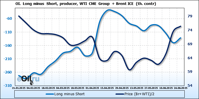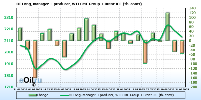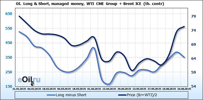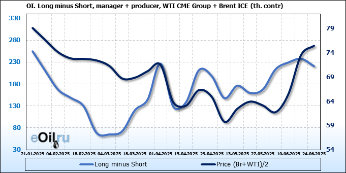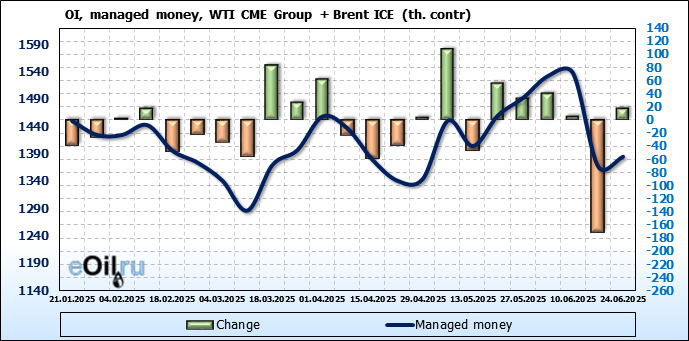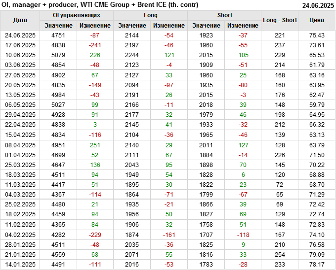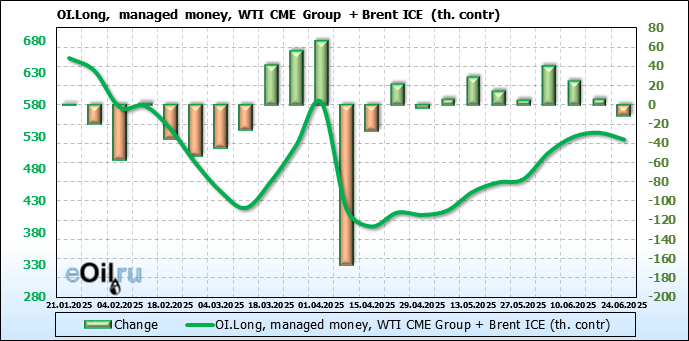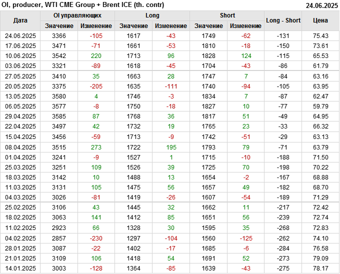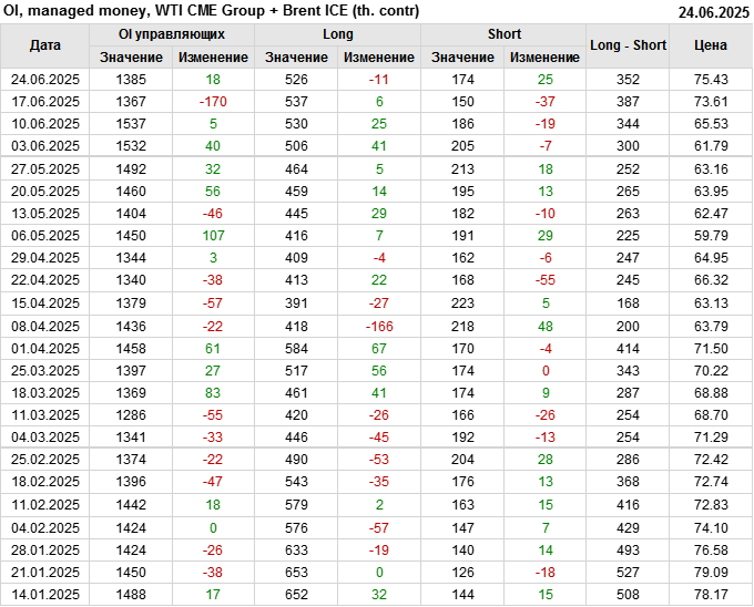 За прошедшую неделю, 18.06.25 — 24.06.25, разница между длинными и короткими позициями управляющих сократилась на 35.3 тыс. контрактов. В тоже время, цена выросла на 1.82 доллара.