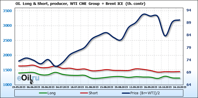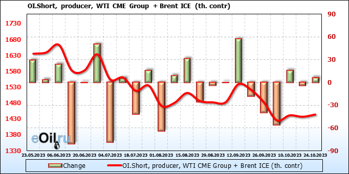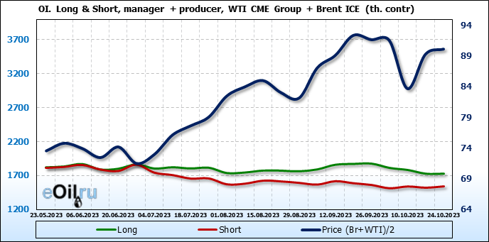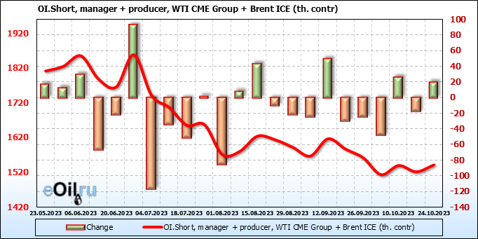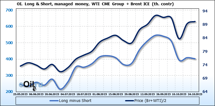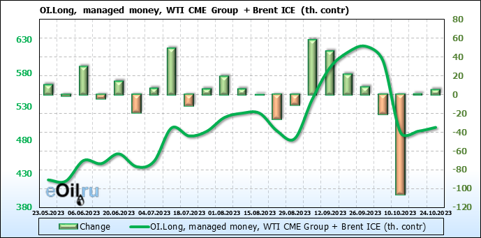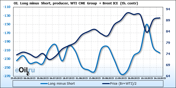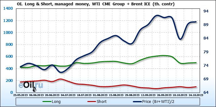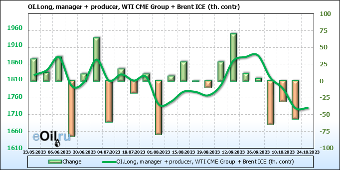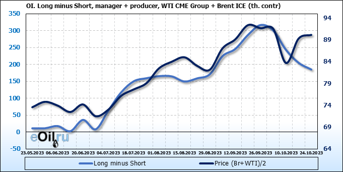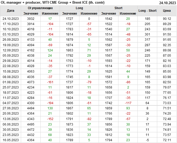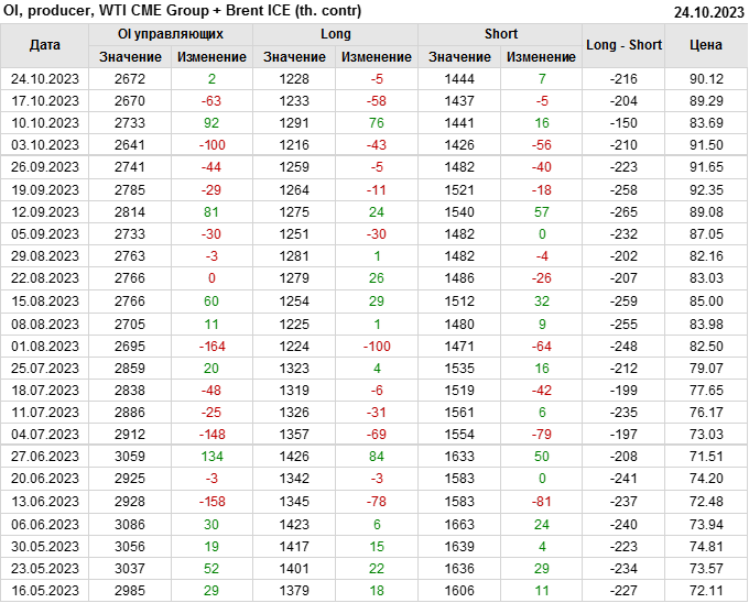 За прошедшую неделю, 18.10.23 — 24.10.23, разница между длинными и короткими позициями управляющих сократилась на 7 тыс. контрактов. В тоже время, цена выросла на 0.83 доллара.