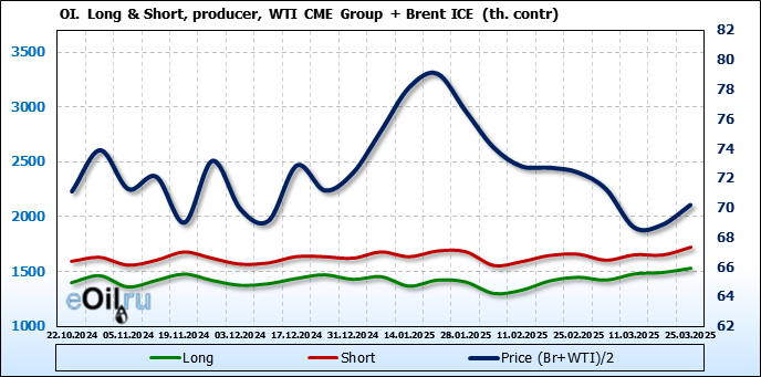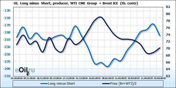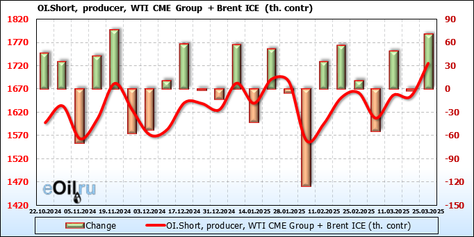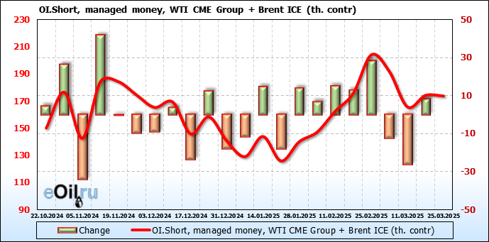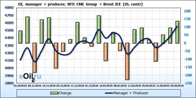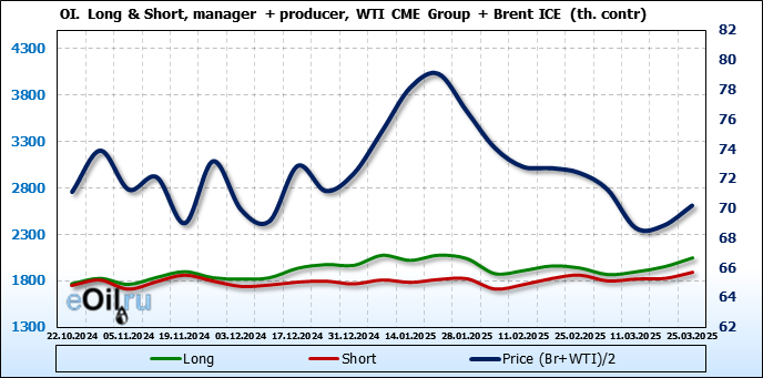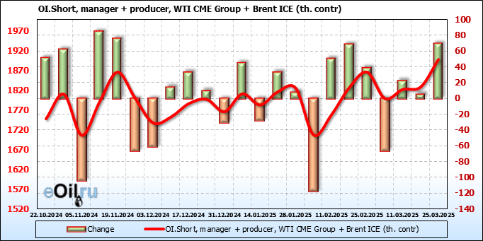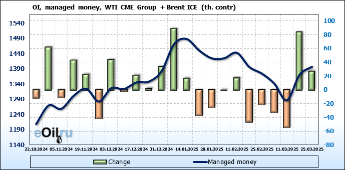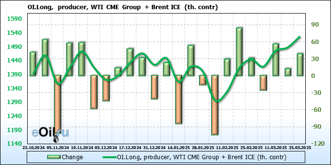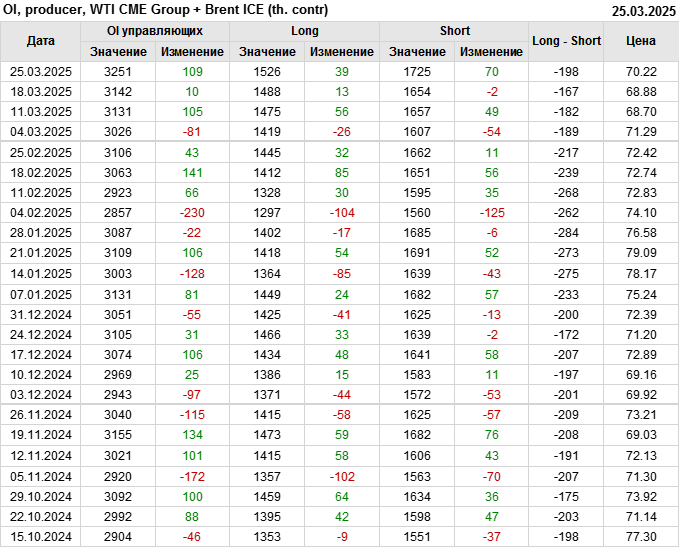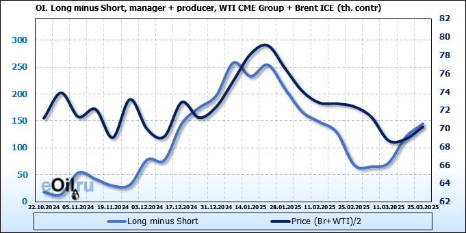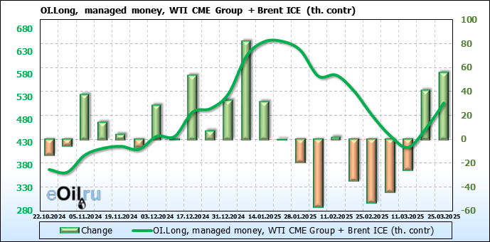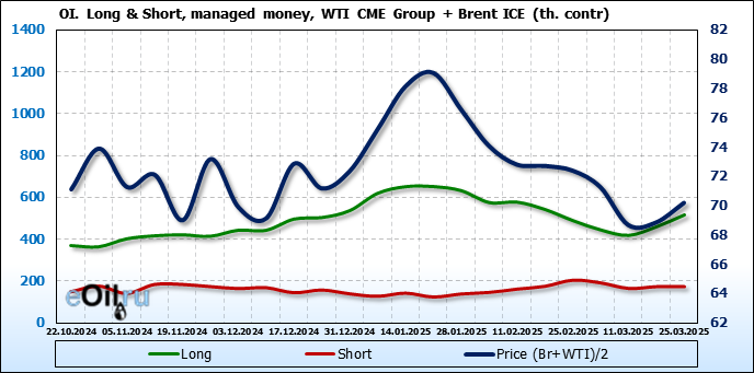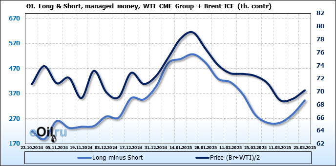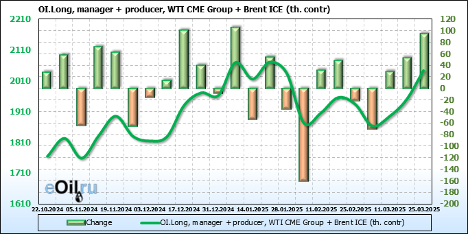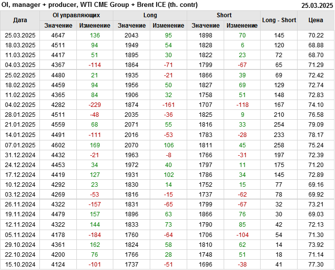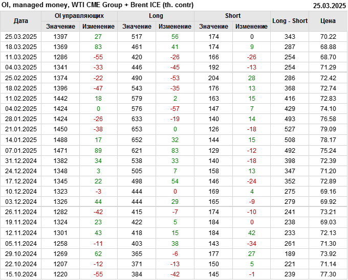 За прошедшую неделю, 19.03.25 — 25.03.25, разница между длинными и короткими позициями управляющих увеличилась на 56.5 тыс. контрактов. В тоже время, цена выросла на 1.34 доллара.
