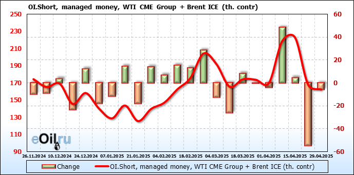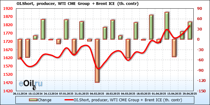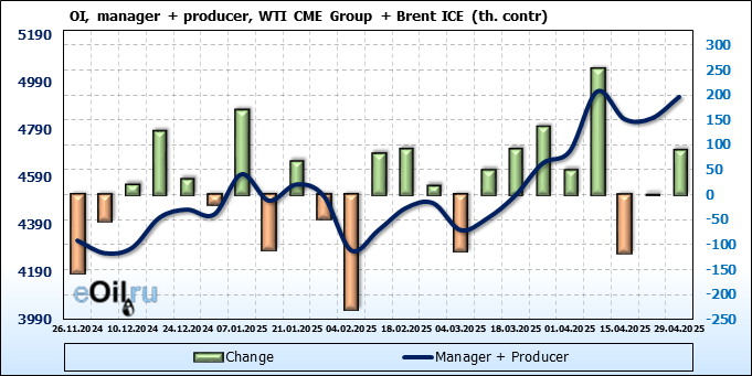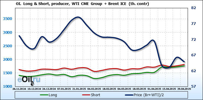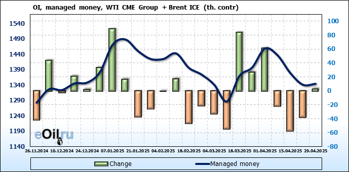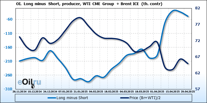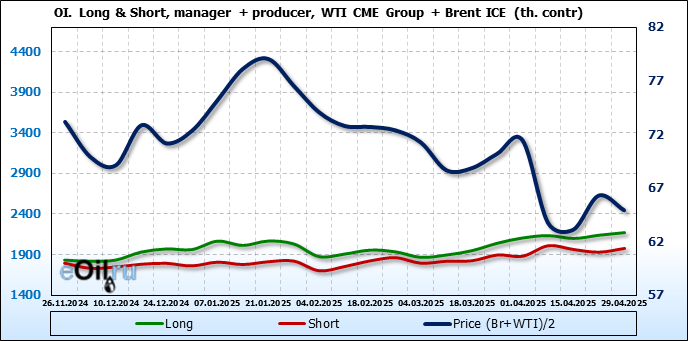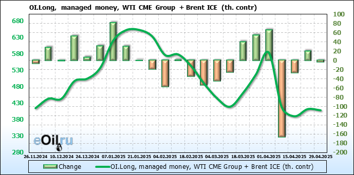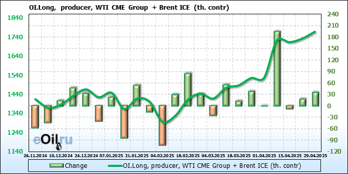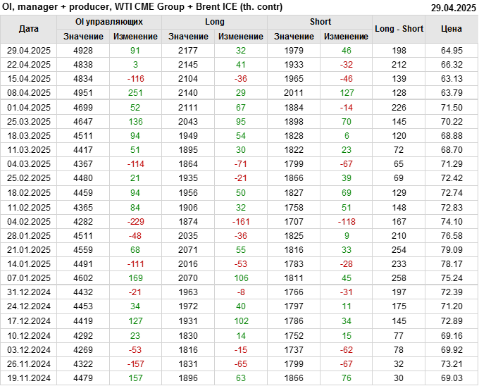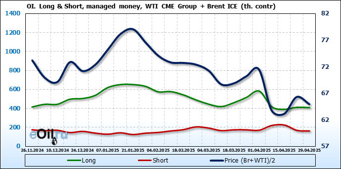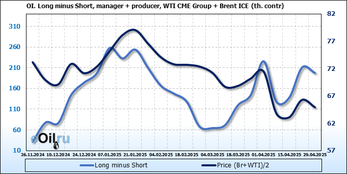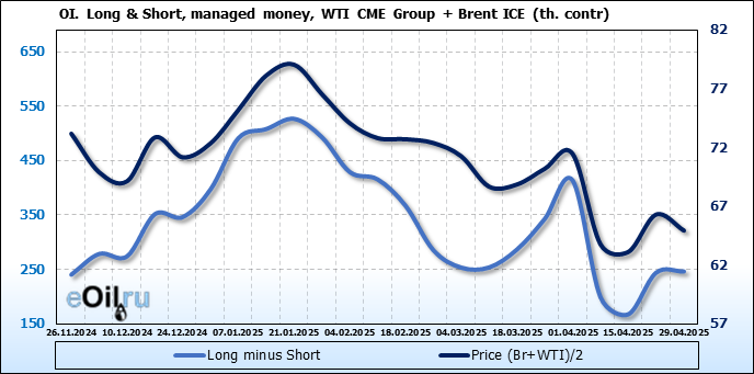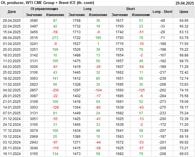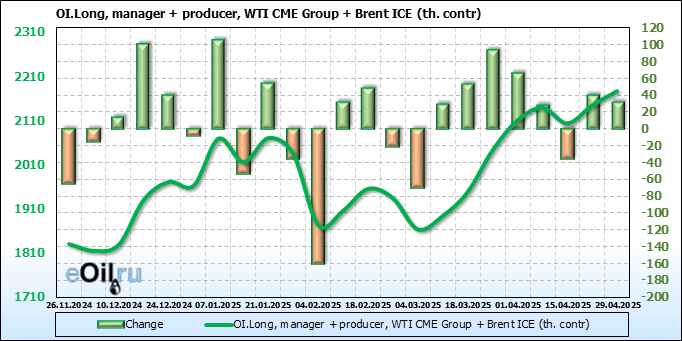 За прошедшую неделю, 23.04.25 — 29.04.25, разница между длинными и короткими позициями управляющих увеличилась на 2.2 тыс. контрактов. В тоже время, цена упала на 1.37 доллара.