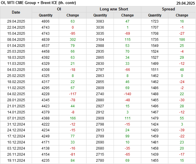 За прошлую неделю, 23.04.25 — 29.04.25, открытый интерес вырос на 63 тыс. контрактов. Объем вовлеченных в торговлю контрактов составляет 4 805 641 штуку. Текущее положение дел на рынке таково, что деньги в течение прошлой недели приходили на рынок поддерживая тенденцию.