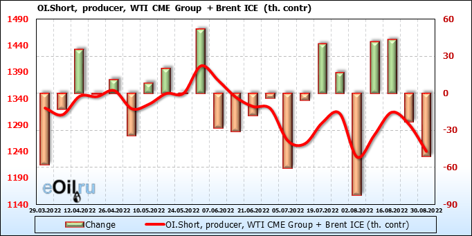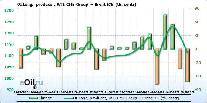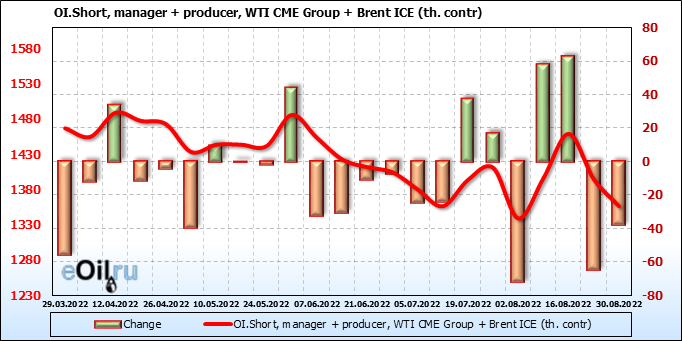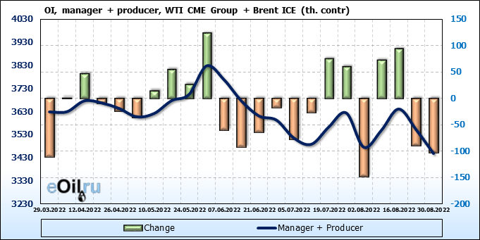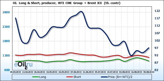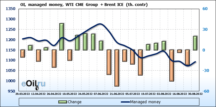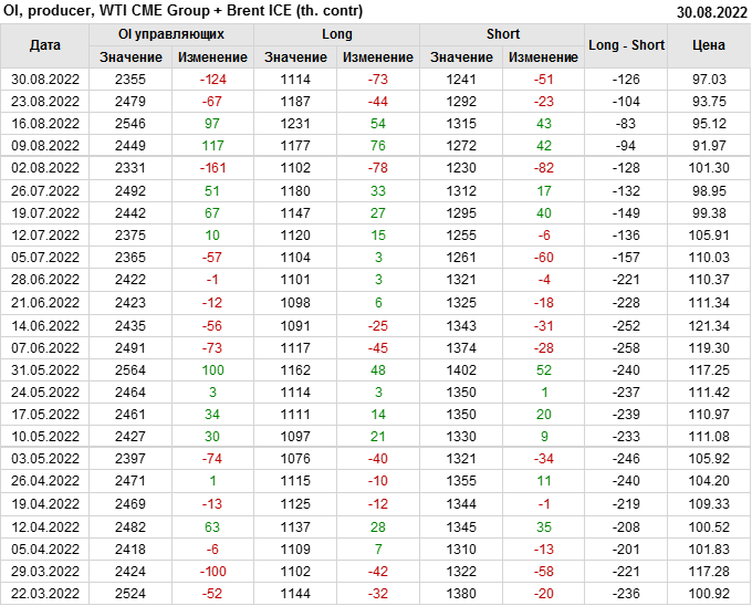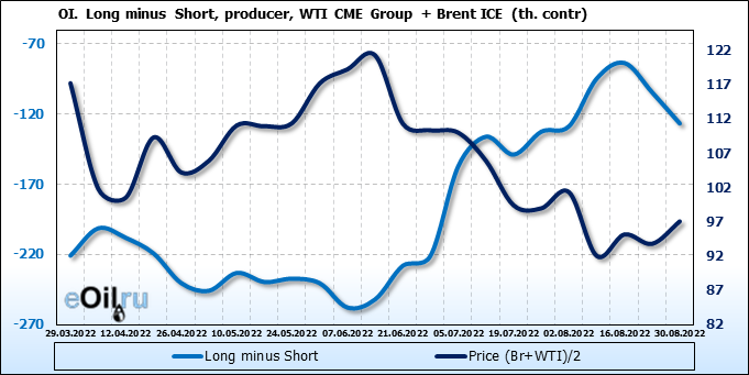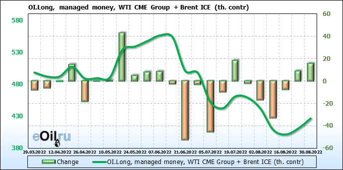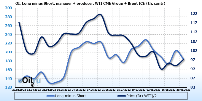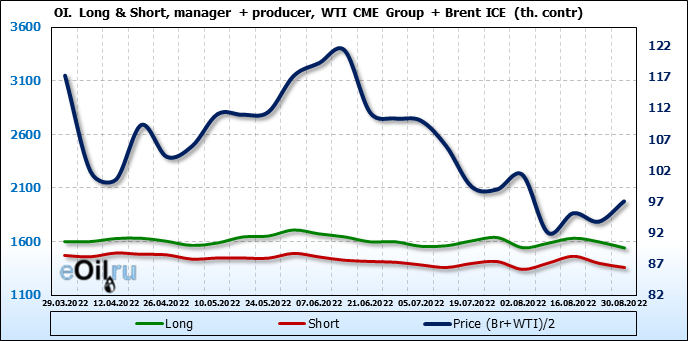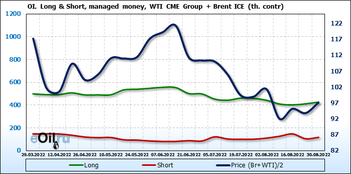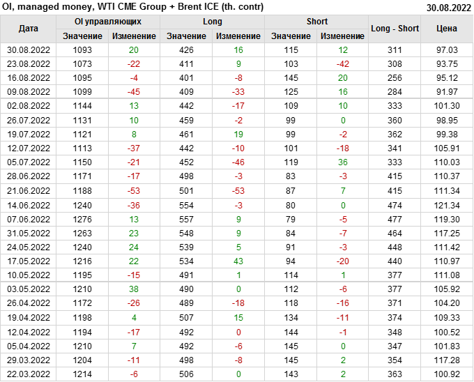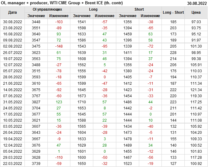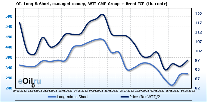 За прошедшую неделю, 24.08.22 — 30.08.22, разница между длинными и короткими позициями управляющих увеличилась на 3.4 тыс. контрактов. В тоже время, цена выросла на 3.28 доллара.