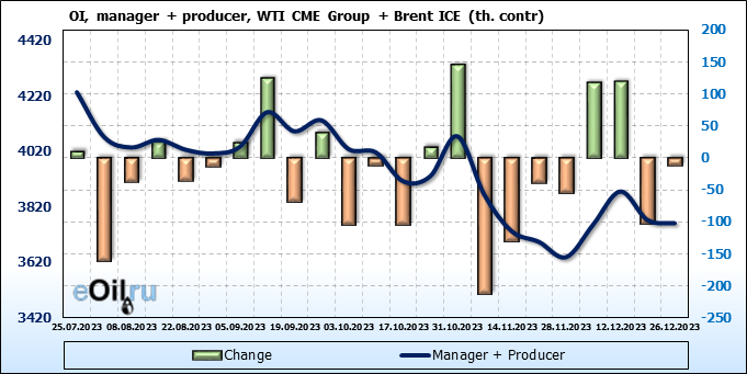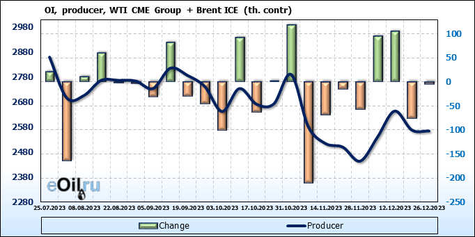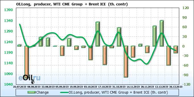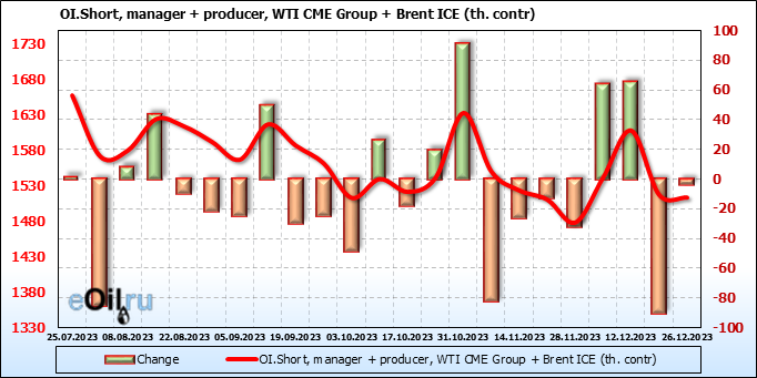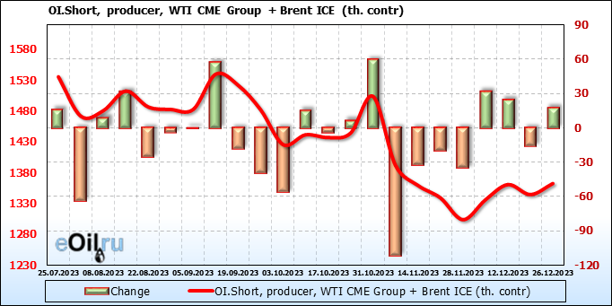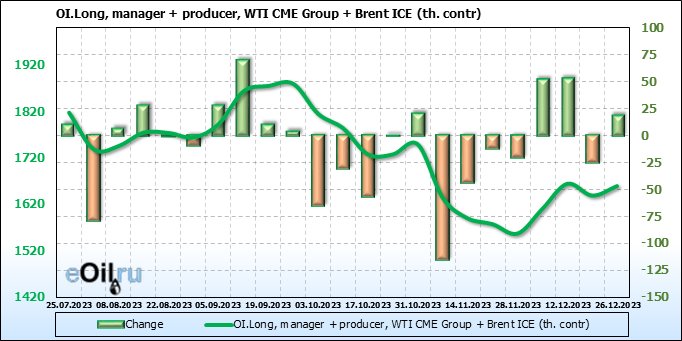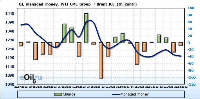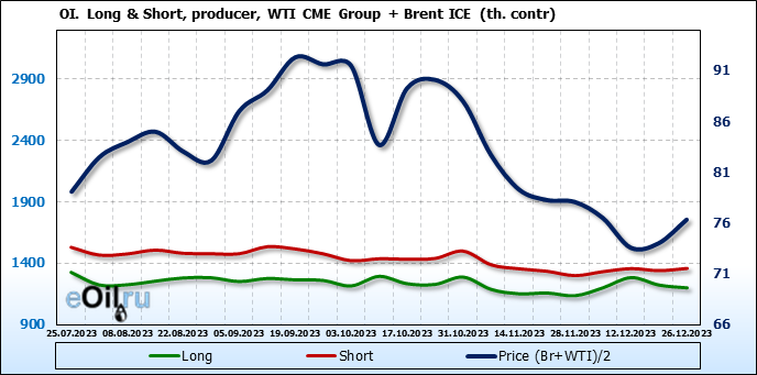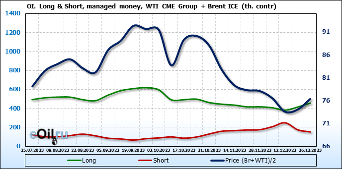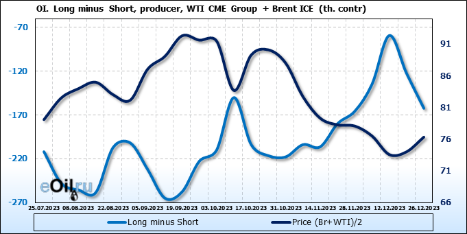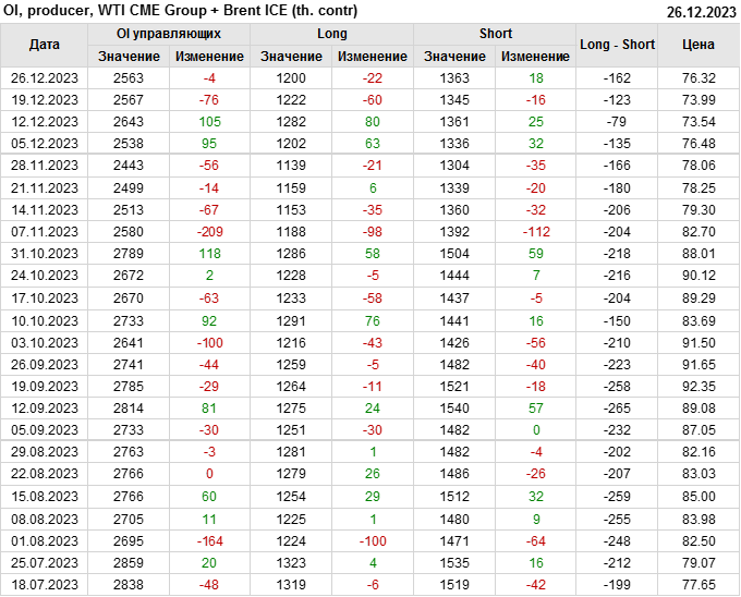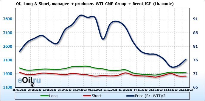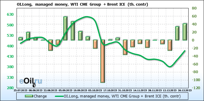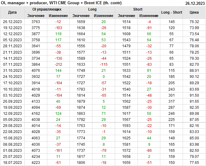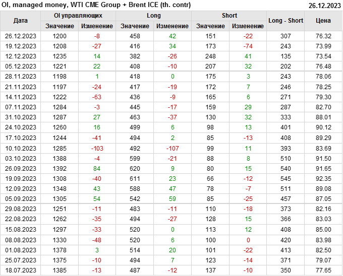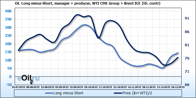За прошедшую неделю, 20.12.23 — 26.12.23, разница между длинными и короткими позициями управляющих увеличилась на 64 тыс. контрактов. В тоже время, цена выросла на 2.33 доллара.
