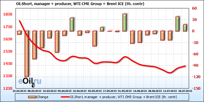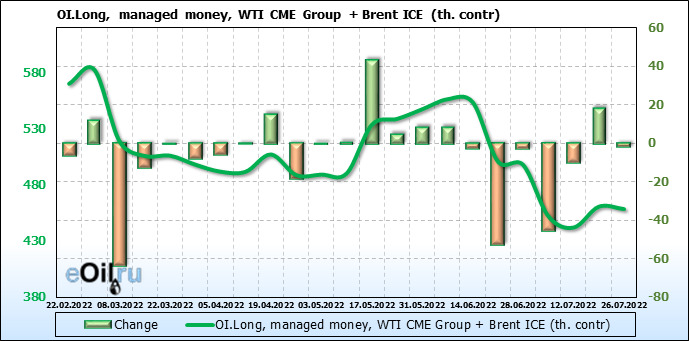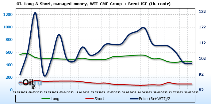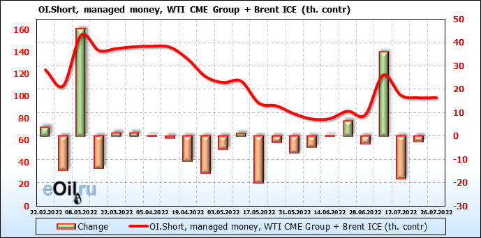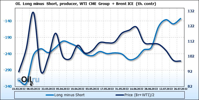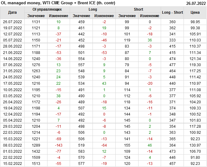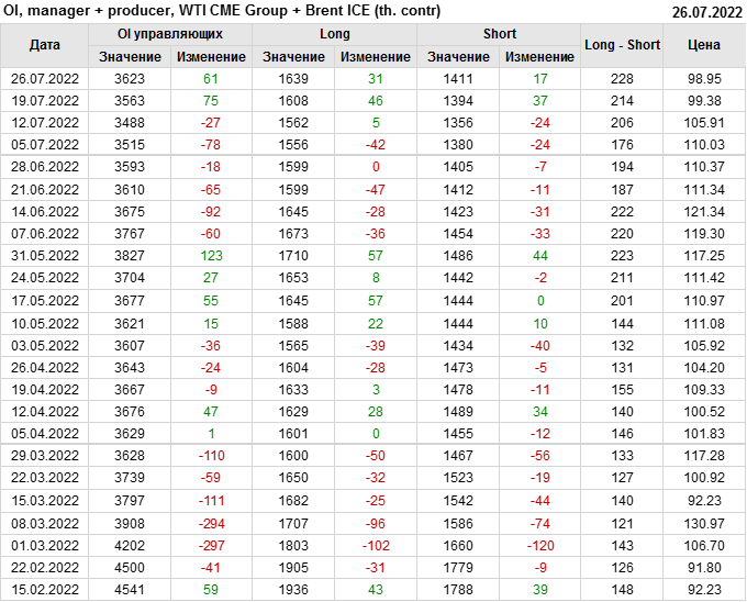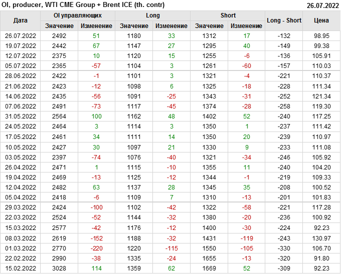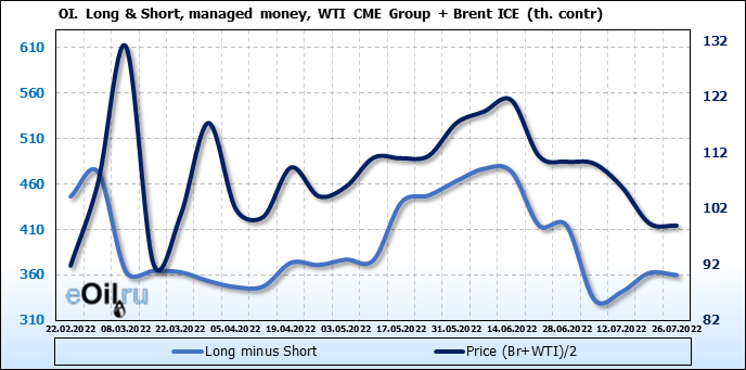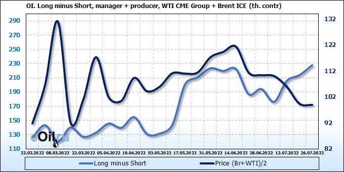За прошедшую неделю, 20.07.22 — 26.07.22, разница между длинными и короткими позициями управляющих сократилась на 2.3 тыс. контрактов. В тоже время, цена упала на 0.43 доллара.