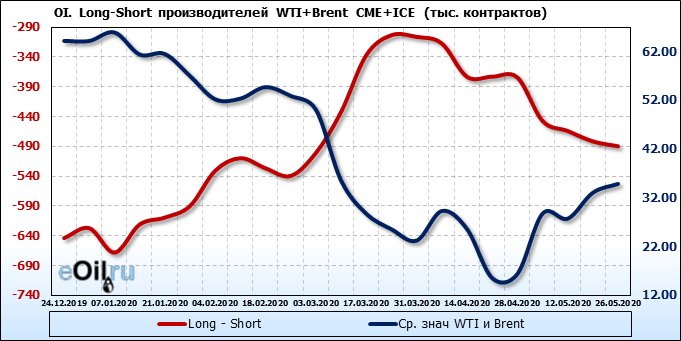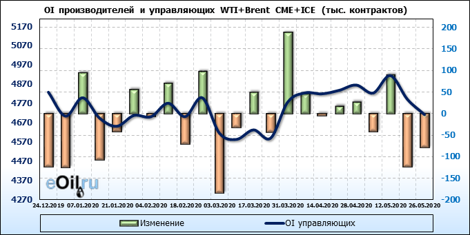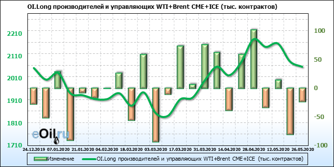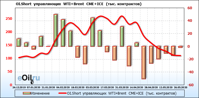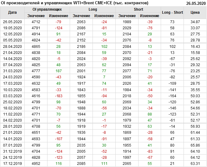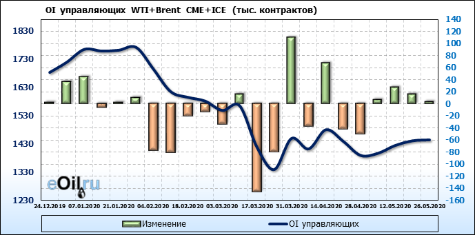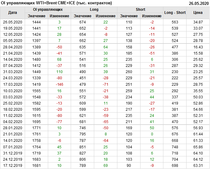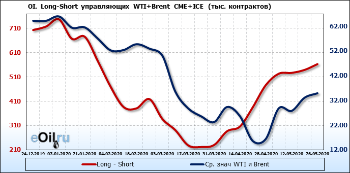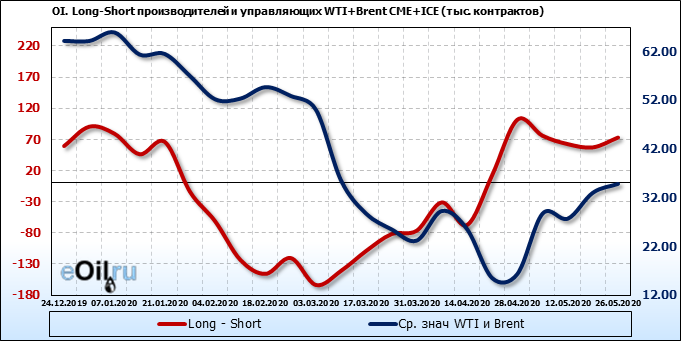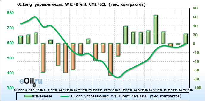 За прошлую неделю, 20.05.20 — 26.05.20, разница между длинными и короткими позициями управляющих выросла на 24 тыс. контрактов. В тоже время, цена выросла на 1.8 доллара. Управляющие наращивают позиции, разгоняя тем самым рост цен, что говорит нам о текущей силе рынка.