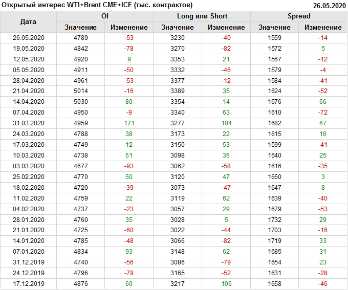 За прошлую неделю, 20.05.20 — 26.05.20, открытый интерес упал на 53 тыс. контрактов. Объем вовлеченных в торговлю контрактов составляет 4 788 938 штук. Текущее положение дел на рынке таково, что деньги в течение прошлой недели уходили с рынка не видя привлекательности в текущей ситуации.
