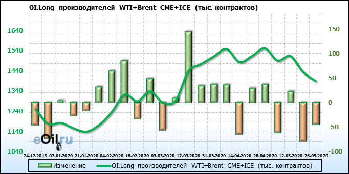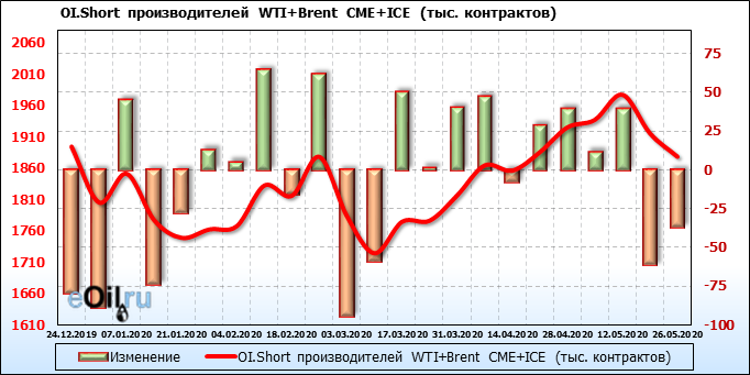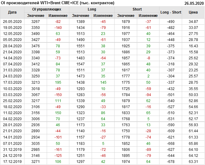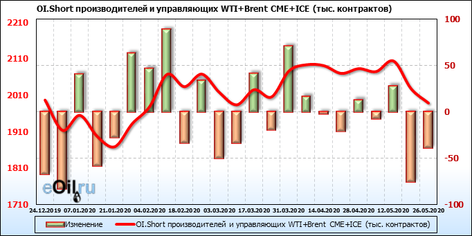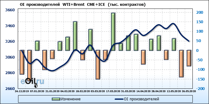 За прошлую неделю, 20.05.20 — 26.05.20, разница между длинными и короткими позициями производителей упала на 8 тыс. контрактов. В тоже время, цена выросла на 1.8 доллара. Производители увеличивают продажи, предполагая, что текущие уровни являются привлекательными для них. И не смотря на это, рынок продолжает расти, что показывает силу текущего тренда.
