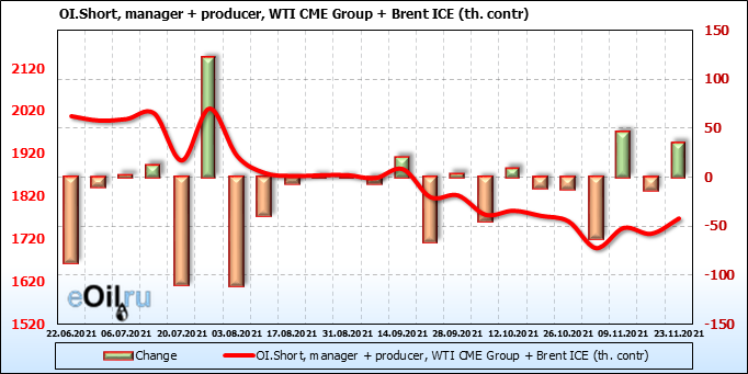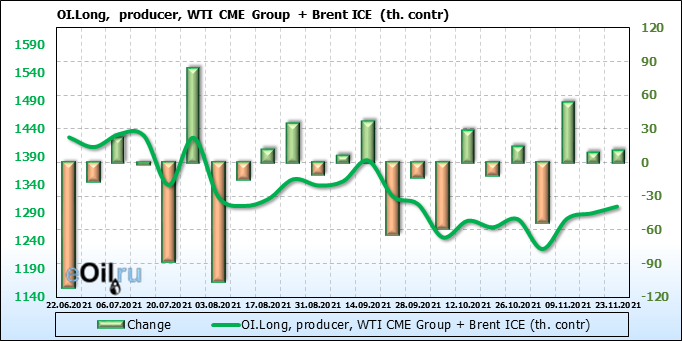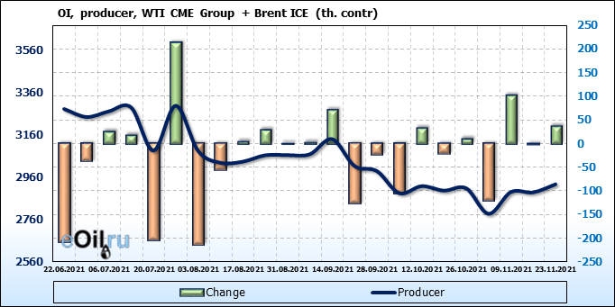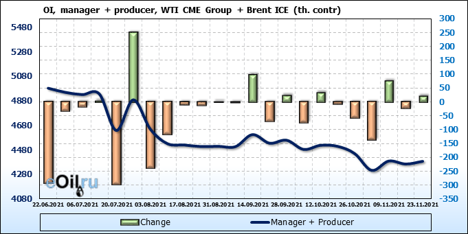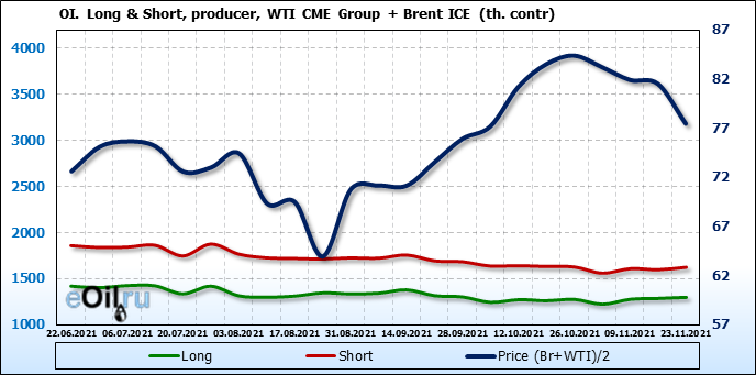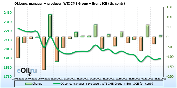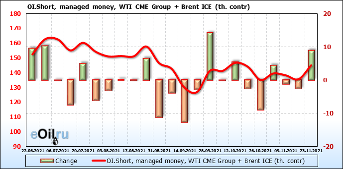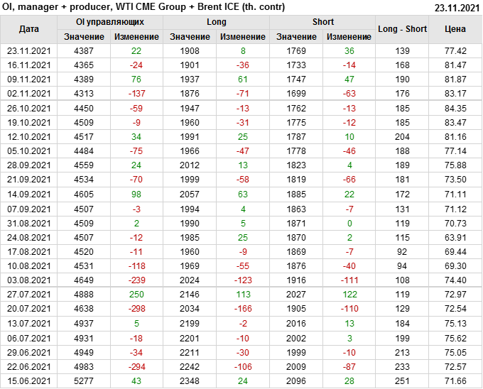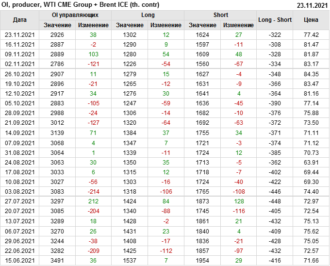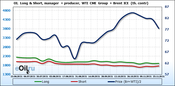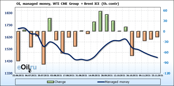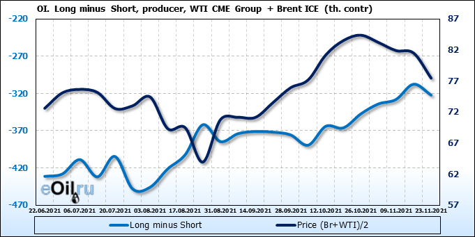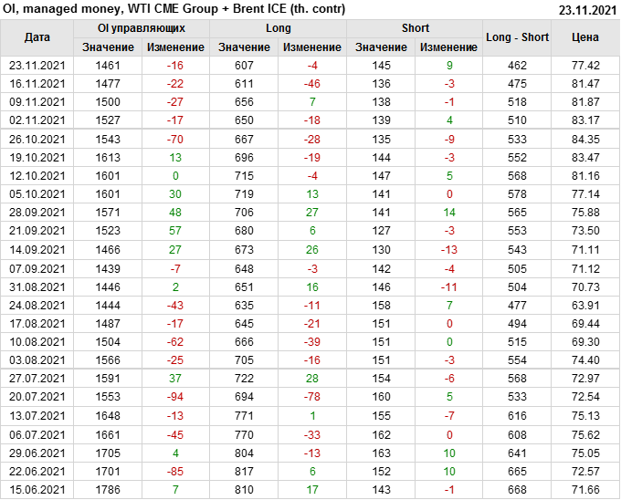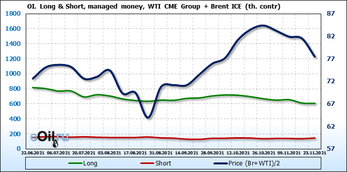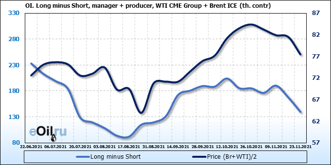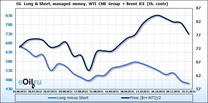 За прошлую неделю, 17.11.21 — 23.11.21, разница между длинными и короткими позициями управляющих сократилась на 13.5 тыс. контрактов. В тоже время, цена упала на 4.05 доллара.
