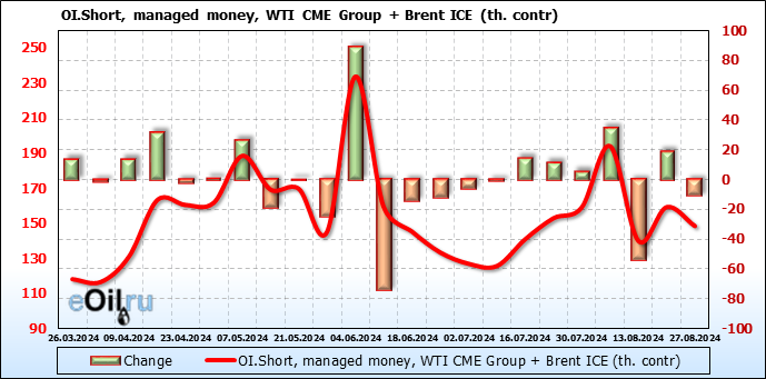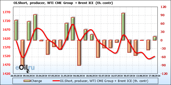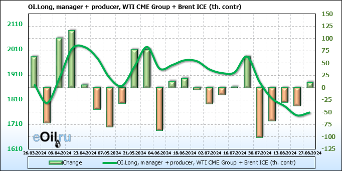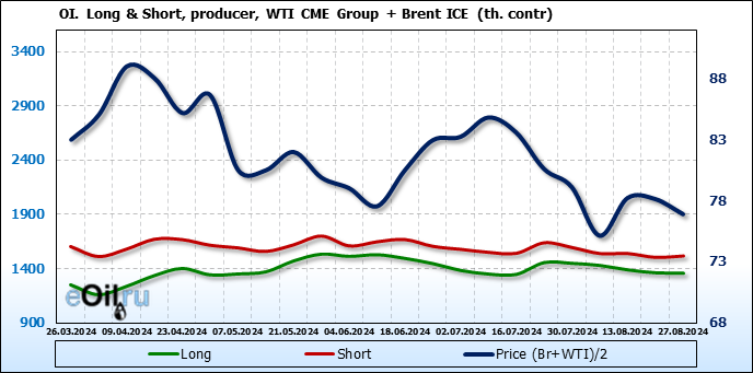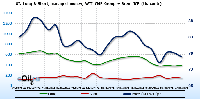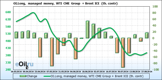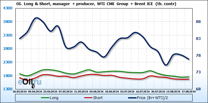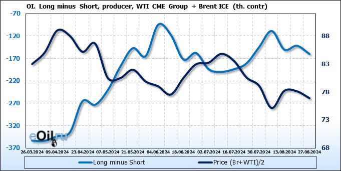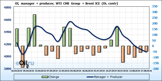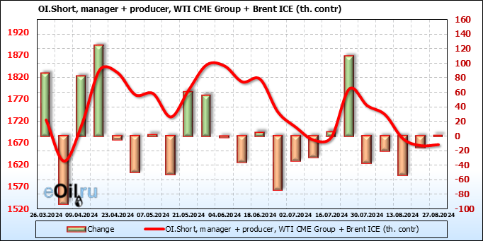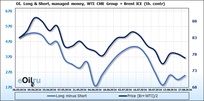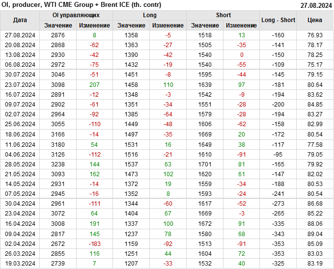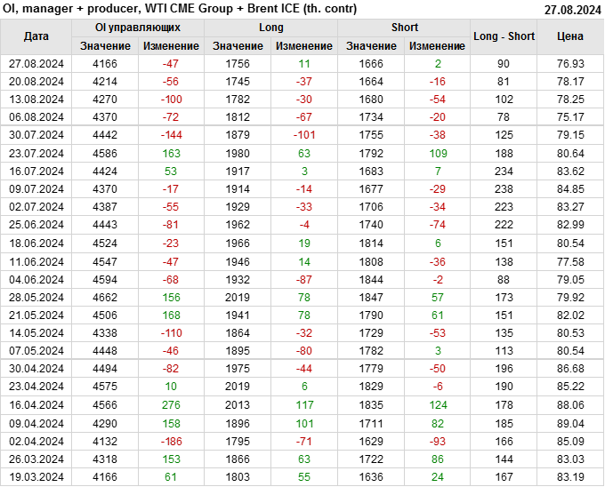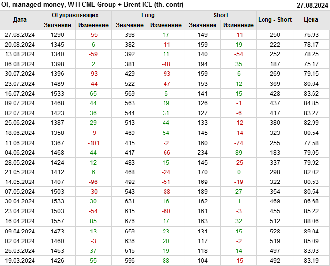 За прошедшую неделю, 21.08.24 — 27.08.24, разница между длинными и короткими позициями управляющих увеличилась на 27.4 тыс. контрактов. В тоже время, цена упала на 1.24 доллара.