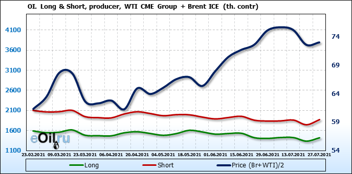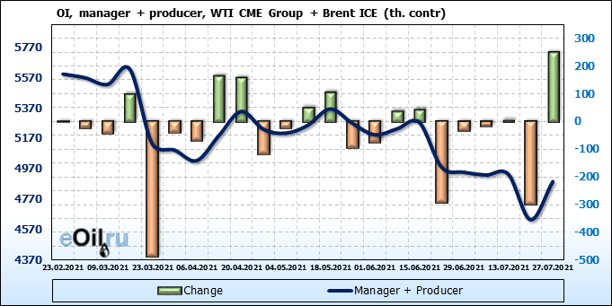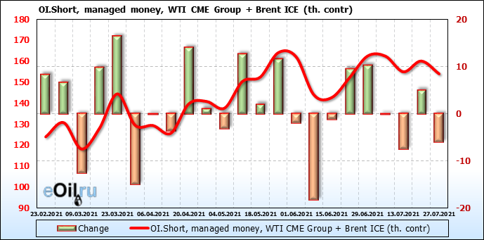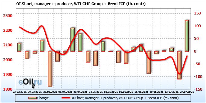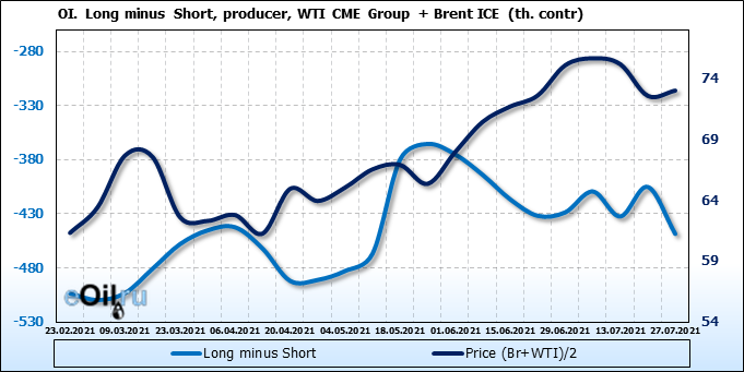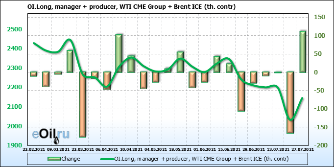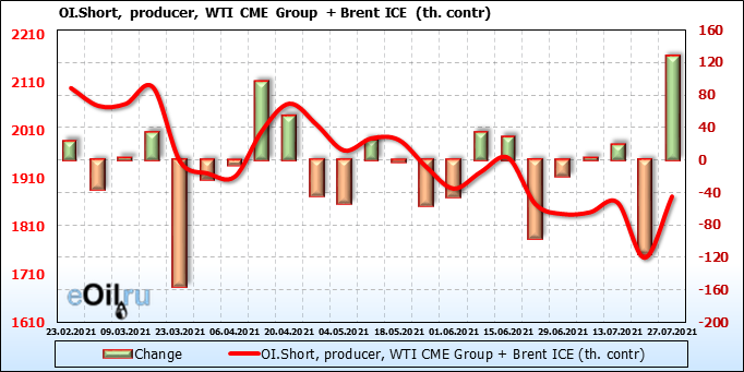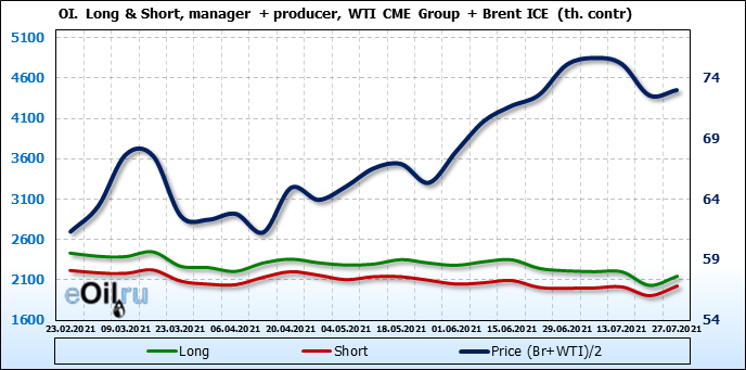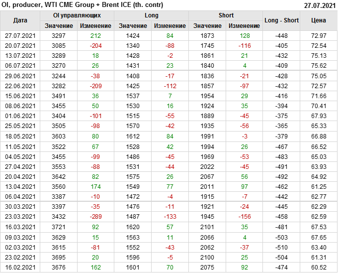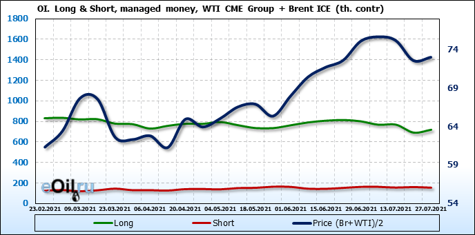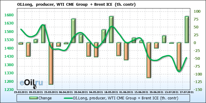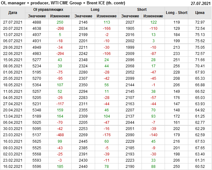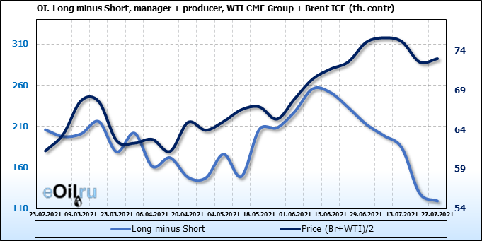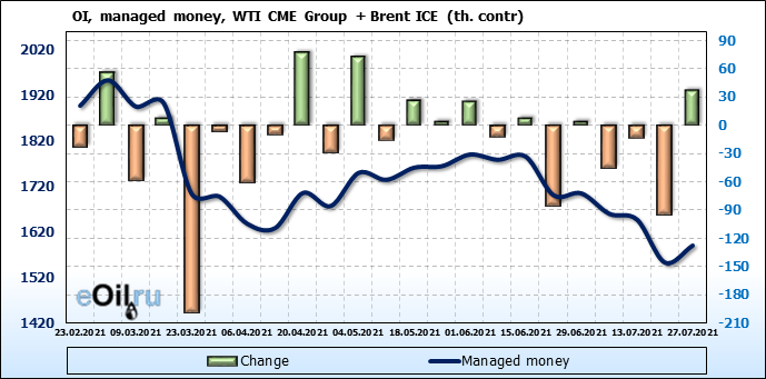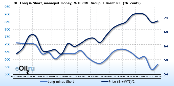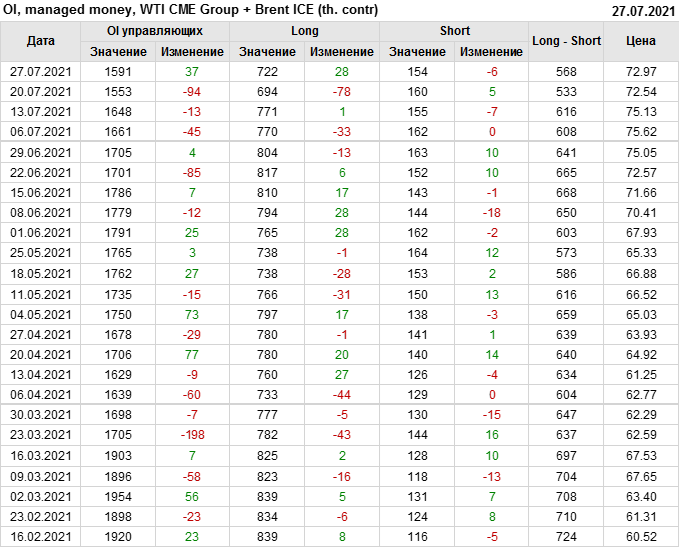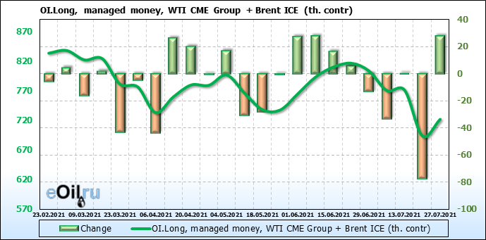 За прошлую неделю, 21.07.21 — 27.07.21, разница между длинными и короткими позициями управляющих увеличилась на 34.4 тыс. контрактов. В тоже время, цена выросла на 0.43 доллара.