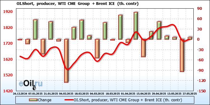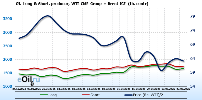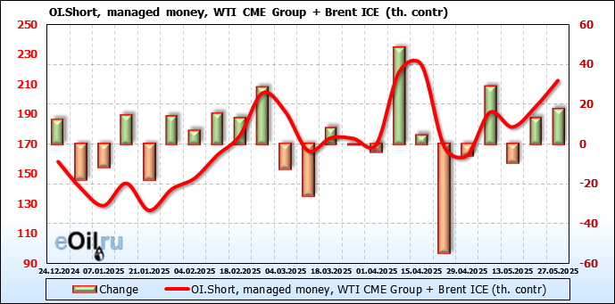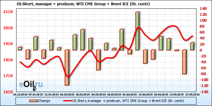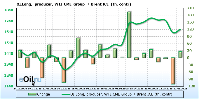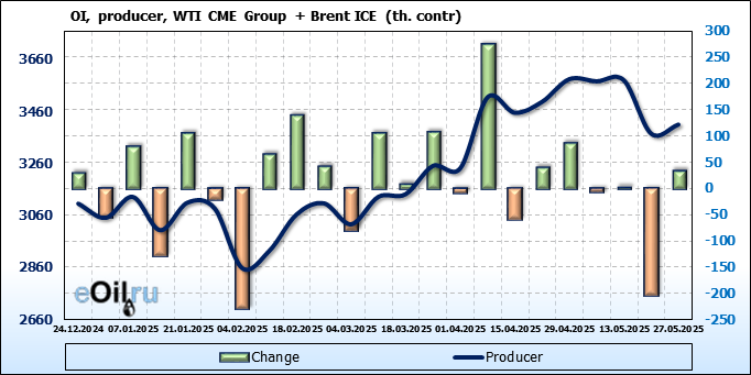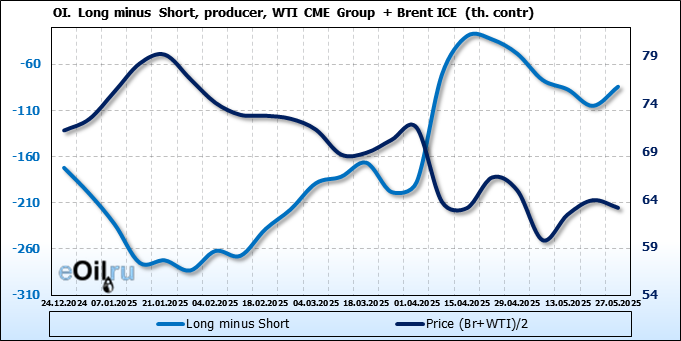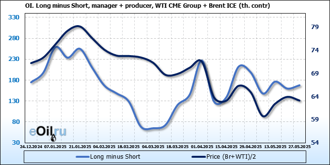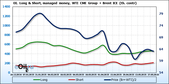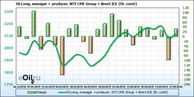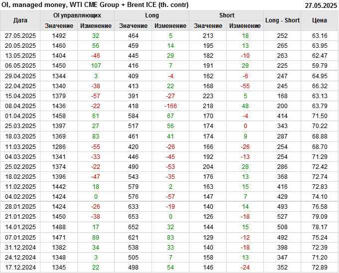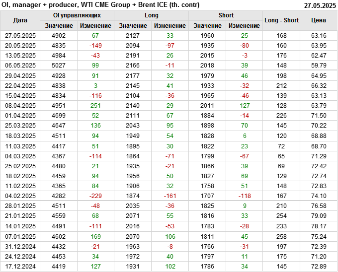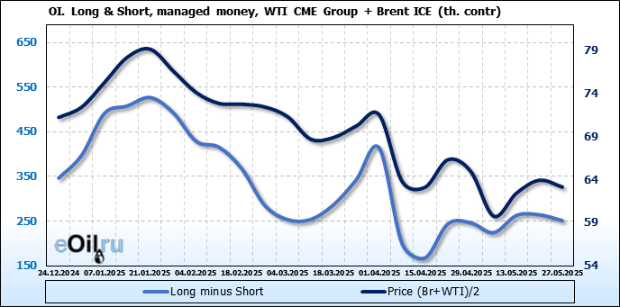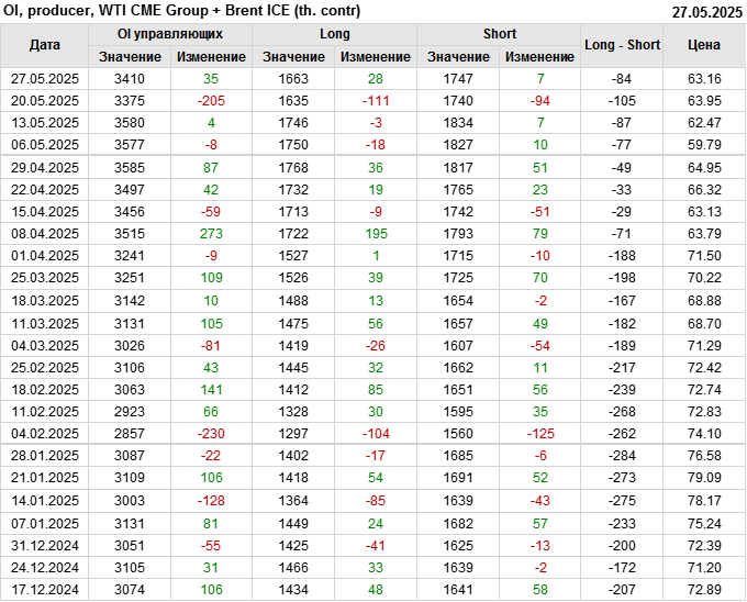 За прошедшую неделю, 21.05.25 — 27.05.25, разница между длинными и короткими позициями управляющих сократилась на 12.9 тыс. контрактов. В тоже время, цена упала на 0.79 доллара.